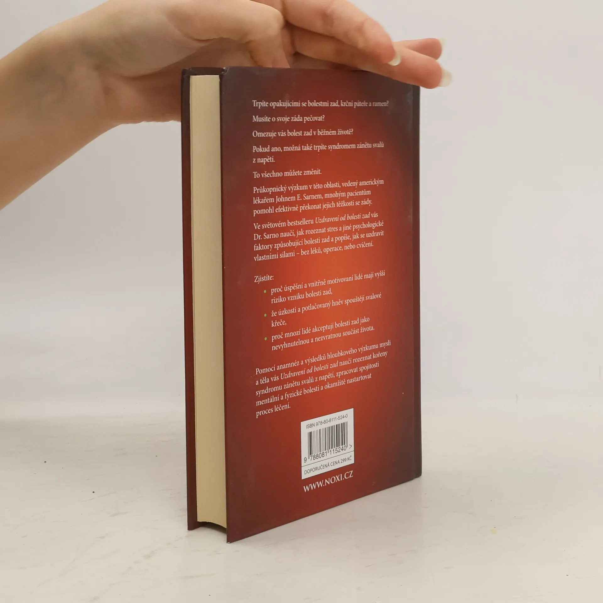 Trpíte opakujícími se bolestmi zad, krční páteře a ramen? Musíte o svoje záda pečovat? Omezuje vás bolest zad v běžném životě? Pokud ano, možná také trpíte syndromem zánětu svalů z napětí. To všechno můžete změnit. Průkopnický výzkum v této oblasti, vedený americkým lékařem Johnem E. Sarnem, mnohým pacientům pomohl efektivně překonat jejich těžkosti se zády. Ve světovém bestselleru Uzdravení od bolesti zad vás Dr. Sarno naučí, jak rozeznat stres a jiné psychologické faktory způsobující bolesti zad a popíše, jak se uzdravit vlastními silami – bez léků, operace, nebo cvičení. Zjistíte: - proč úspěšní a vnitřně motivovaní lidé mají vyšší riziko vzniku bolesti zad, - že úzkosti a potlačovaný hněv spouštějí svalové křeče, - proč mnozí lidé akceptují bolesti zad jako nevyhnutelnou a nezvratnou součást života. Pomocí anamnéz a výsledků hloubkového výzkumu mysli a těla vás Uzdravení od bolesti zad naučí rozeznat kořeny syndromu zánětu svalů z napětí, zpracovat spojitosti mentální a fyzické bolesti a okamžitě nastartovat proces léčení.