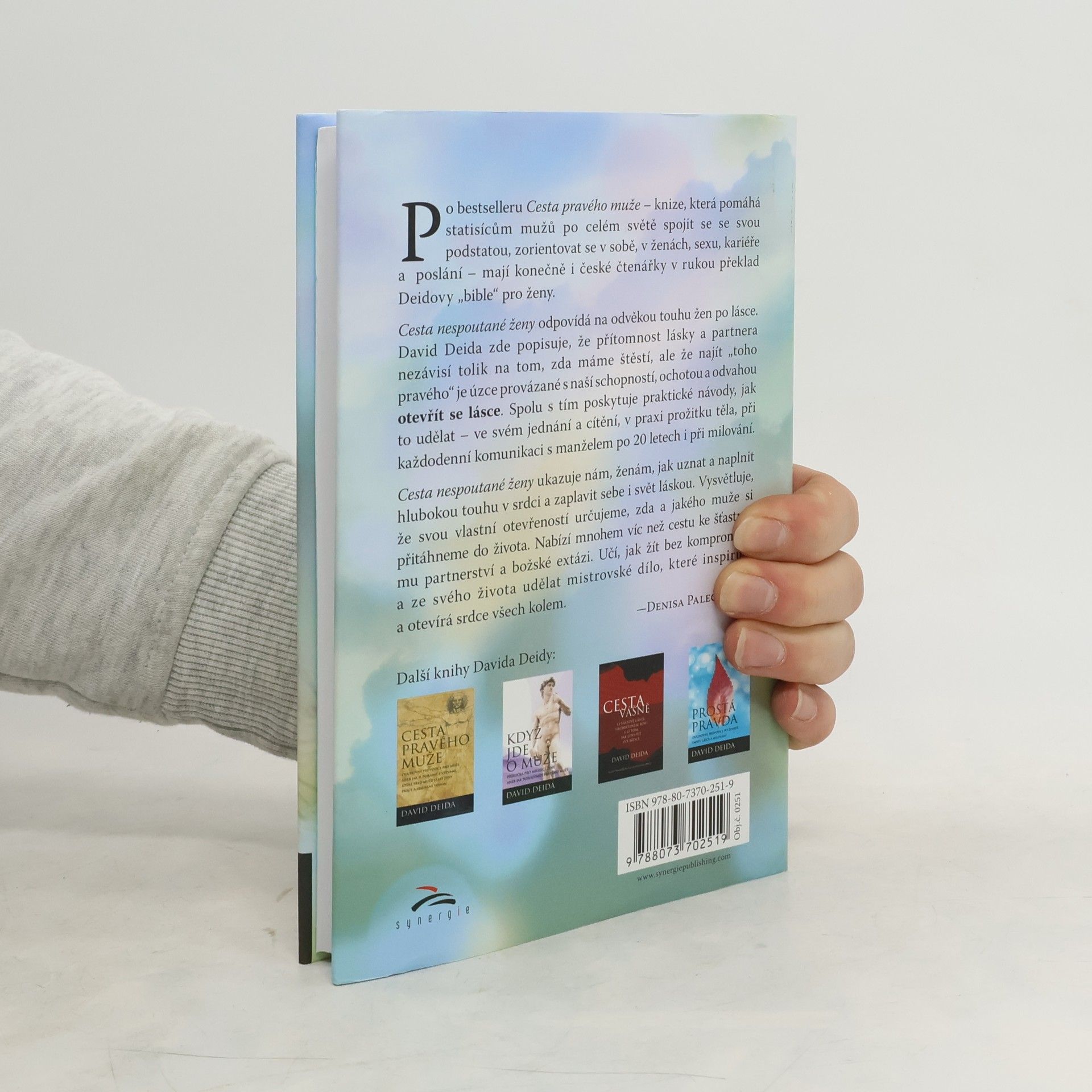 Po bestselleru Cesta pravého muže - knize, která pomáhá statisícům mužů po celém světě spojit se se svou podstatou, zorientovat se v sobě, v ženách, sexu, kariéře a poslání - mají konečně i české čtenářky v rukou překlad Deidovy "bible" pro ženy. Cesta nespoutané ženy odpovídá na odvěkou touhu žen po lásce. David Deida ukazuje, že přítomnost lásky a partnera nezávisí tolik na tom, zda máme štěstí, ale že najít "toho pravého" je úzce provázané s naší schopností, ochotou a odvahou otevřít se lásce. Spolu s tím poskytuje praktické návody, jak to udělat - ve svém jednání a cítění, v praxi prožitku těla, při každodenní komunikaci s manželem po 20 letech i při milování. Ukazuje tak nám ženám cestu, jak uznat a naplnit hlubokou touhu v srdci a zaplavit sebe i svět láskou. Vysvětluje, že svou vlastní otevřeností určujeme, zda a jakého muže si přitáhneme do života. Ukazuje mnohem víc než cestu ke šťastnému partnerství a božské extázi. Učí žít bez kompromisů, a ze svého života udělat mistrovské dílo, které inspiruje a otevírá srdce všech kolem.