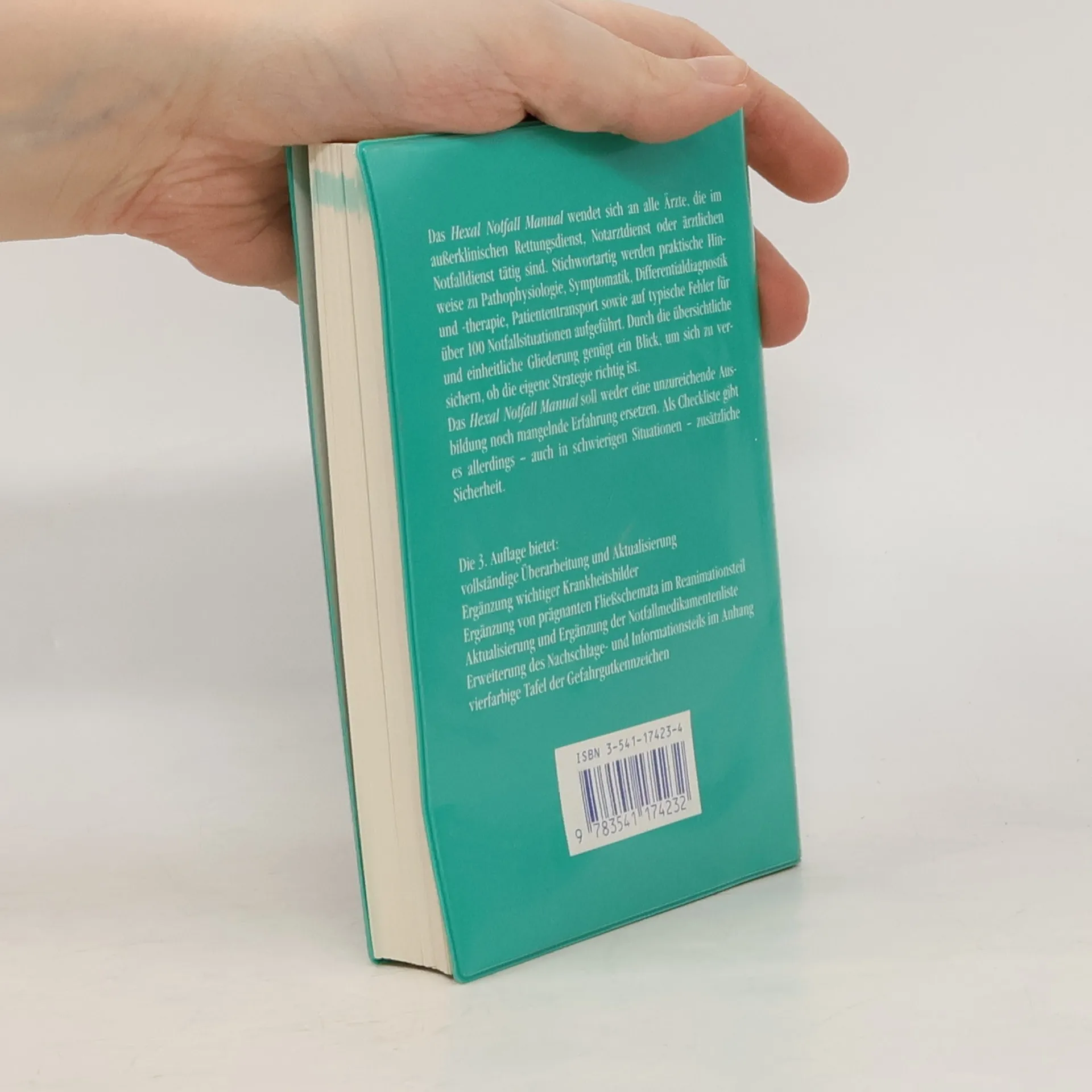 Bevor Notärzte den Einsatzort erreichen, haben sie nur wenige Angaben über ihre Patienten. Umso wichtiger ist es, sich in kürzester Zeit auf ein Spektrum möglicher Notfall-indikationen vorbereiten zu können. Hier hilft das Hexal Notfall Manual: Gegliedert nach Fachgebieten, werden die typischen Notfälle hochstrukturiert und stichwortartig abgehandelt. Auf häufige Fehler wird gesondert hingewiesen. Ideal zum schnellen Nachschlagen ist auch der Anhang mit Tabellen zur Notfallmedikation und vielem mehr. Die neue Auflage ist aktualisiert und um weitere häufige Notfälle erweitert.