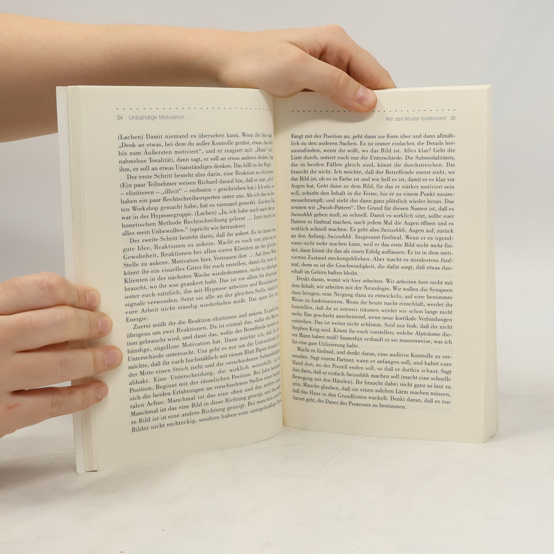 In diesem neuen Buch des NLP-Mitbegründers Richard Bandler geht es darum, individuelle Kontrolle über den eigenen Zustand und das eigene Bewußtsein zu gewinnen und anderen Menschen die gleiche Art von Kontrolle vermitteln zu können. Hypnosetechniken spielen bei dieser Arbeit eine wesentliche Rolle. Die in diesem Buch vorgestellten Techniken und Übungen sind sehr effizient und führen in kurzer Zeit zu nachhaltigen Ergebnissen. "Führt die Menschen nicht in die Vergangenheit zurück, führt sie nach vorn. Die Welt wird auf Dauer für alle angenehmer, wenn wir die Menschen in die Zukunft orientieren, mit einem Fetisch für mehr und mehr Erfolg, mehr und mehr Glück, mehr und mehr Kompetenz, mehr und mehr Freundlichkeit. Es wird nicht geschehen, wenn wir die Menschen leiden lassen. Alle möglichen Ideologien haben es immer wieder versucht, die Menschen durch Leid und Entbehrung , menschlicher' zu machen. Das funktioniert nicht. Menschen sind gut und großzügig, wenn sie das haben, was sie brauchen. Wir wollen Menschen, die versessen darauf sind, erfolgreich zu sein, Spaß zu haben, gut zu leben und mitfühlend zu sein - die Art von Dingen, die jeden Tag zu einem Abenteuer machen. Denkt daran, womit wir hier arbeiten. Wir arbeiten hier nicht mit dem Inhalt, wir arbeiten mit der Neurologie. Wir wollen die Synapsen dazu bringen, eine Neigung dazu zu entwickeln, auf eine bestimmte Weise zu funktionieren ..." - Richard Bandler