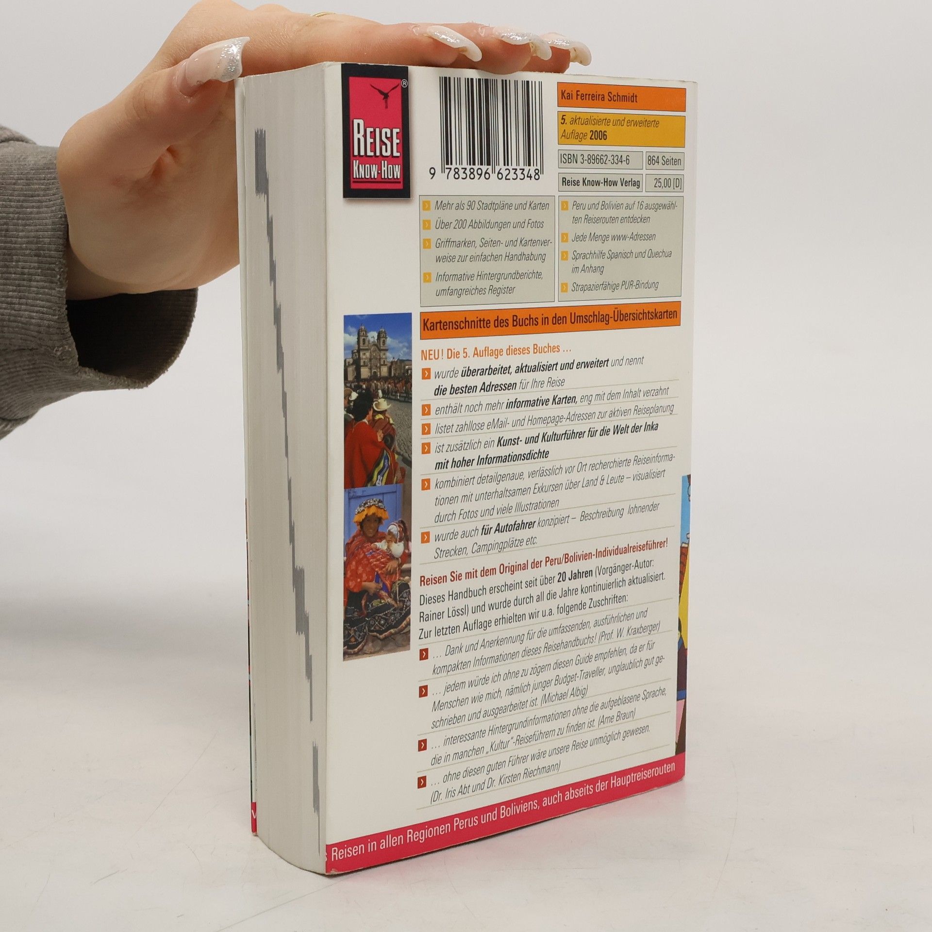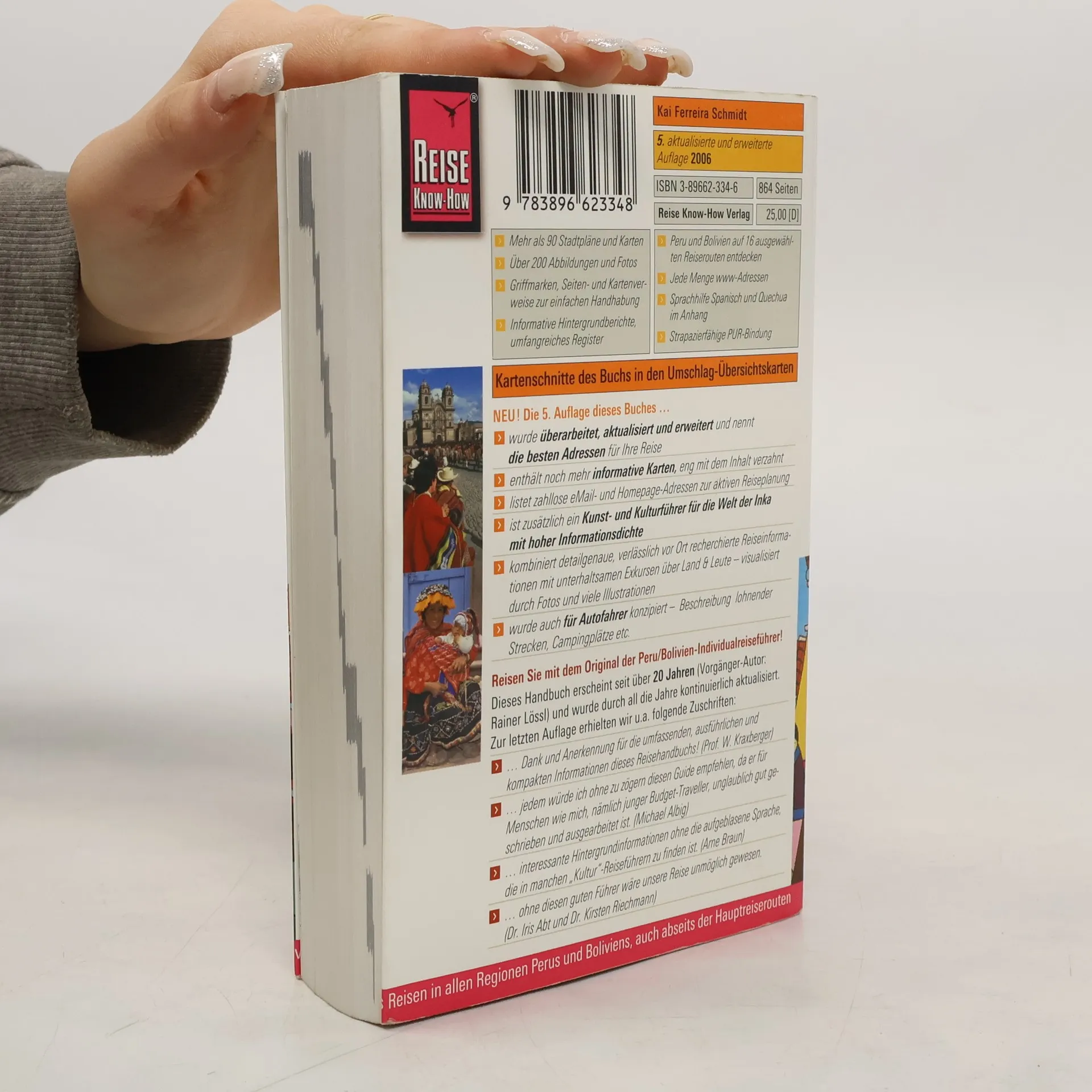 Der richtige Führer für Erlebnisreisen auf den Spuren der Inka. Ausführliche Reiserouten durch das Hoch- und Küstenland, Stadtrundgänge in alten Kolonialstädten, Abstecher in den Urwald sowie Trekkingrouten. Mit fundierten Hintergrundinformationen zu Land und Leuten Dieser bewährte RKH-Reiseführer ist ein idealer Begleiter durch Peru und Bolivien sowohl für Einzel- als auch für organisiert Reisende. Die ausführlichen Beschreibungen der sehenswerten Orte und Sehenswürdigkeiten, der archäologischen Stätten und Naturschutzgebiete werden durch zahllose Adressen, praktische Informationen sowie eine Sprachhilfe Spanisch und Quechua ergänzt. Besonders nützlich sind die detaillierten, eng mit dem Text verzahnten Karten sowie die persönlichen Empfehlungen des Autors zu Unterkünften, Restaurants und Transportmitteln (Bus, Bahn, Flugzeug, Schiff, Mietwagen). Der landeskundliche Teil und viele informative Exkurse zeichnen ein plastisches Bild der Geschichte, Kultur und aktuellen Situation der beiden Andenländer. Schwerpunktkapitel zur Welt der Inka (Cusco, Machupicchu, Inka-Trail u. a.), zu Regenwald-Exkursionen und Trekking. Mit über 90 auf den Text abgestimmte, detaillierte Karten und Stadtpläne, über 200 Abbildungen u. Fotos, Klappenkarten, Griffmarken, Sprachhilfe Spanisch u. Quechua, umfangreiches Glossar u. Register.