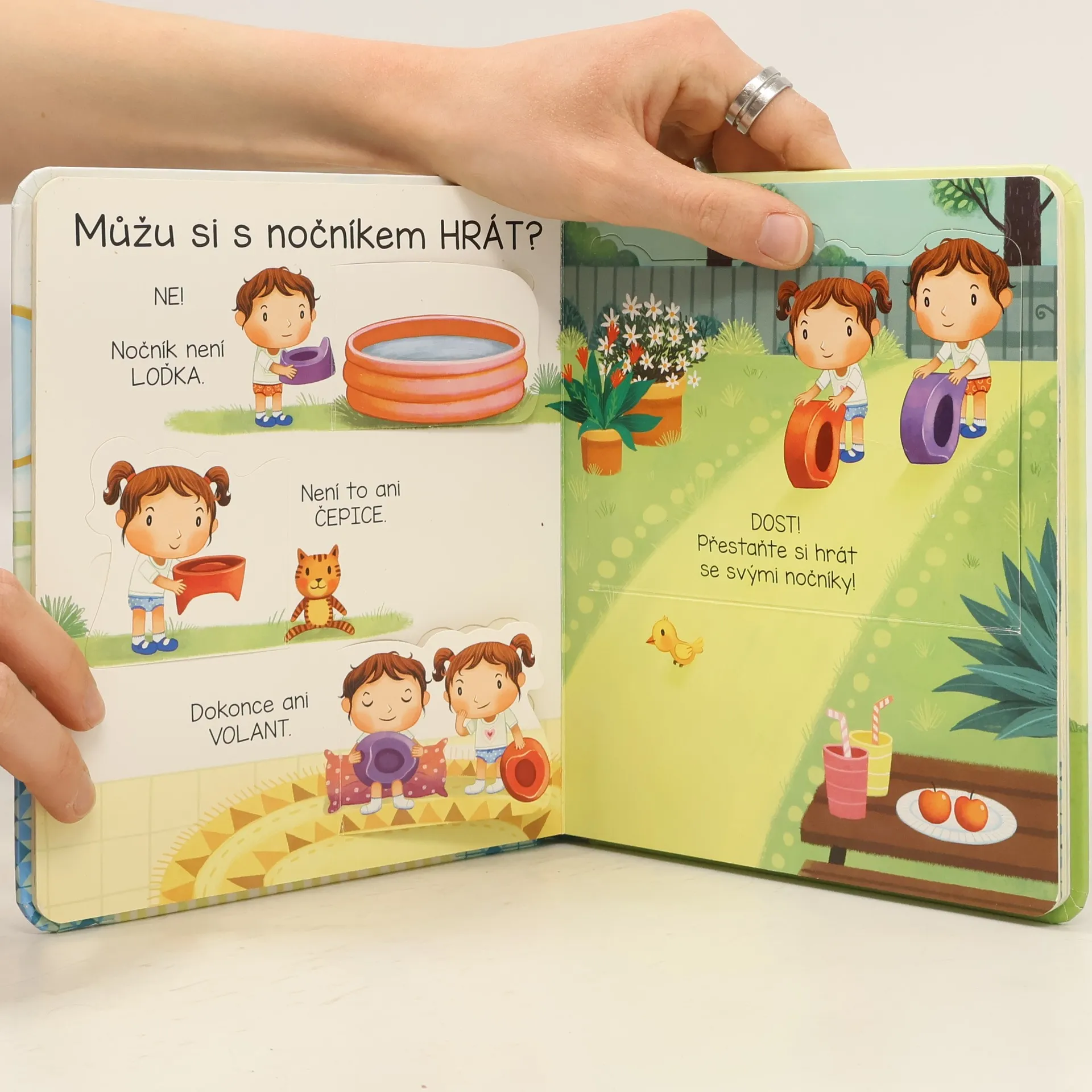 K čemu je nočník, proč ho potřebujeme a jak se používá? Velkou změnu v podobě přechodu na nočník můžete svému dítěti vysvětlit různě, například pomocí jednoduché knížky. Toto obrázkové leporelo s odklápěcími okénky je ideálním pomocníkem pro všechny malé děti, které se učí chodit na nočník. Půvabné ilustrace jsou doprovázeny jednoduchým textem, který něžně povzbuzuje dítě k přechodu z plen na nočník a posléze i na záchod. České vydání publikace nakladatelství Usborne.