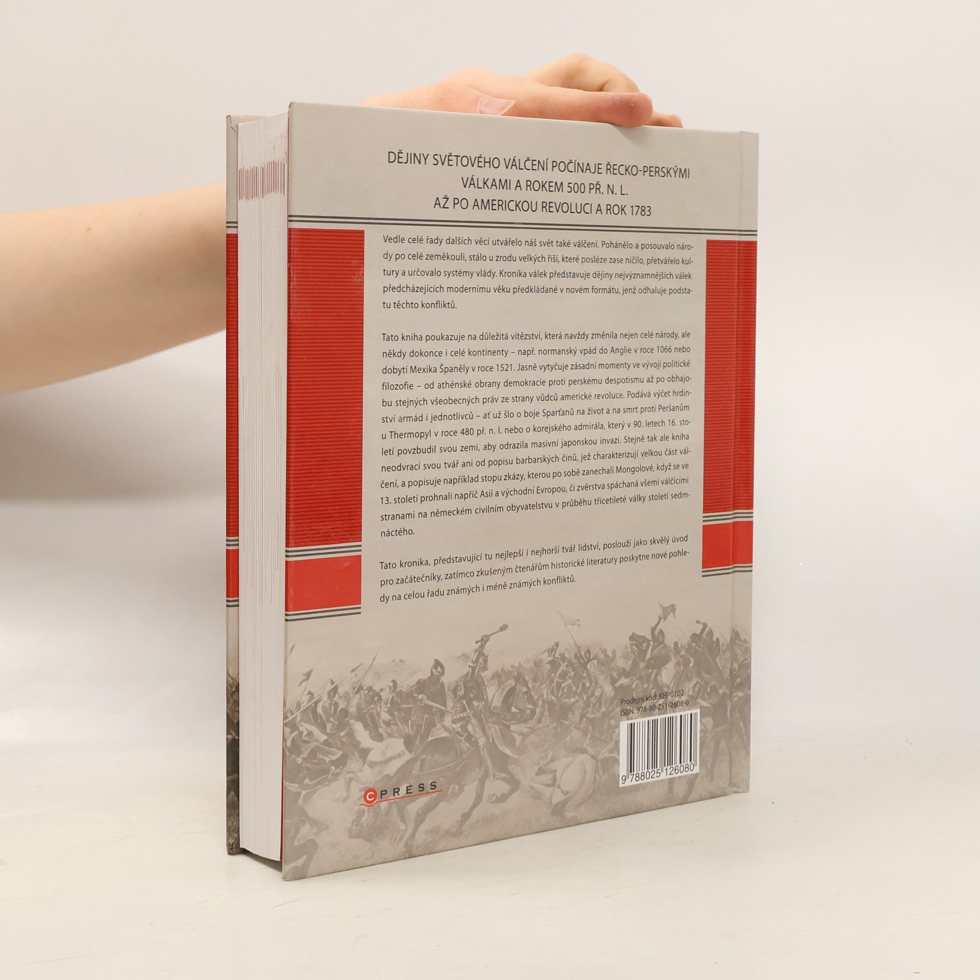 Dějiny válčení utvářely náš svět, posouvaly národy a zakládaly velké říše, které následně ničila. Tato kronika významných válek od řecko-perských konfliktů po americkou revoluci přináší nový pohled na podstatu těchto historických událostí. Kniha zdůrazňuje klíčová vítězství, která změnila národy a kontinenty, jako normanský vpád do Anglie v roce 1066 nebo dobytí Mexika Španěly v roce 1521. Věnuje se také zásadním momentům v politické filozofii, od obrany athénské demokracie proti perskému despotismu až po obhajobu práv během americké revoluce. Popisuje hrdinství armád a jednotlivců, jako byly boje Sparťanů u Thermopyl v roce 480 př. n. l. nebo činy korejského admirála v 90. letech 16. století, který vedl svou zemi proti japonské invazi. Kniha však nezapomíná ani na barbarské činy, jako je zkáza, kterou zanechali Mongolové v 13. století, či zvěrstva během třicetileté války. Tento přehled, ukazující jak nejlepší, tak nejhorší stránky lidstva, je skvělým úvodem pro začátečníky a nabízí nové perspektivy zkušeným čtenářům historické literatury.