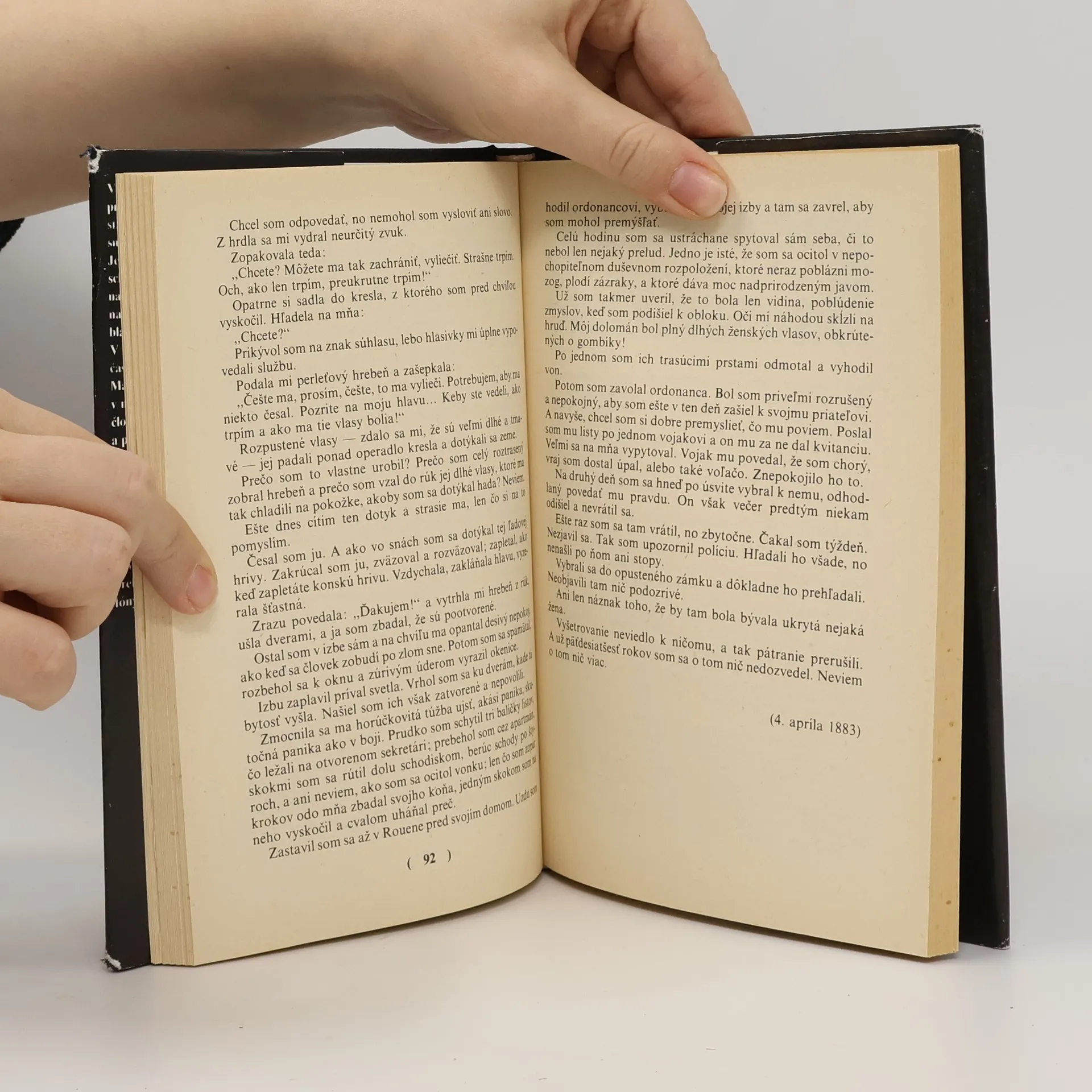 Fantastické povídky, v nichž autor vystihuje vnitřní konflikty naplněné dramatičností, tajemstvím nebo bláznivými výstřednostmi. Poviedky: Uspávačka, Portrét, Noc, Pani Hermetová, Horla, Prípad jednéhorozvodu, Neznáma, Tik, Blázon ?, Vlasy, Ruka, On ?, Matka netvorov, Zjavenie, Pri mŕtvom, Vianočná poviedka, Vlk, Strach, Sny, Magnetizmus, Na vode, Doktor Héraclius Gloss. Prvé vydanie.