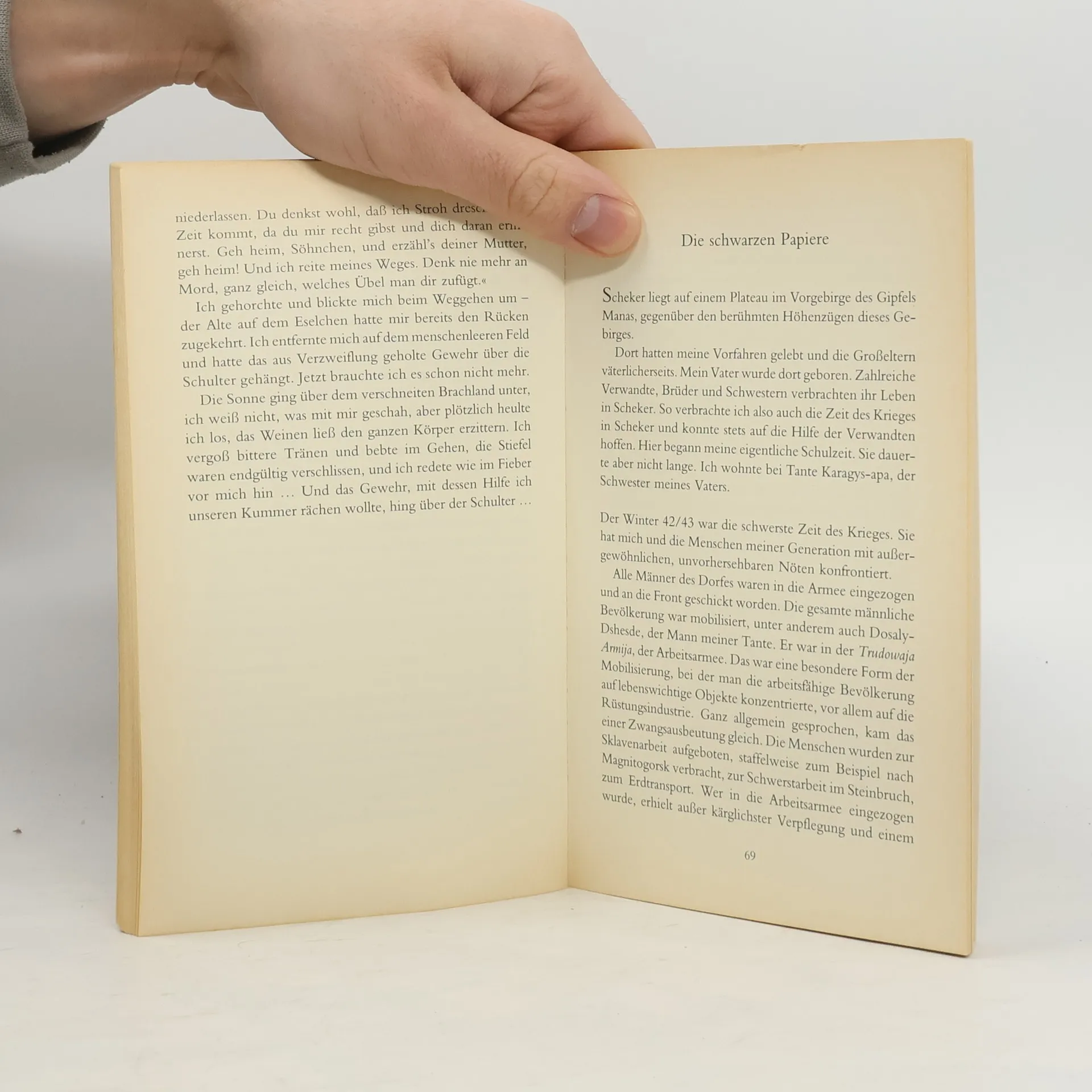 Er war noch zu klein, um richtig aufs Pferd zu steigen, da mußte er schon als Sekretär des Dorfsowjets die Steuern eintreiben und den Frauen die Todesmeldungen von der Front überbringen. Aber zu dieser kirgisischen Kindheit gehört auch das Eintauchen in die reichen Überlieferungen seines Volkes, gehören heitere Erinnerungen und Erlebnisse. Die wahre Geschichte einer verbotenen Liebe im Dorf entpuppt sich als Kern der Novelle "Dshamilja" und Aitmatows Jugendfreund Sejtaly als Vorbild des "Ersten Lehrers". Einige Jahre später erntet der junge Viehzuchtexperte Aitmatow Auszeichnungen für seine rund hundert musterhaft gehaltenen Milchkühe. Als er aber seine ersten Novellen publiziert, entfesselt er im Schriftstellerverband einen Sturm der Entrüstung - er hat mit seinen Werken zu viele Tabus gebrochen.