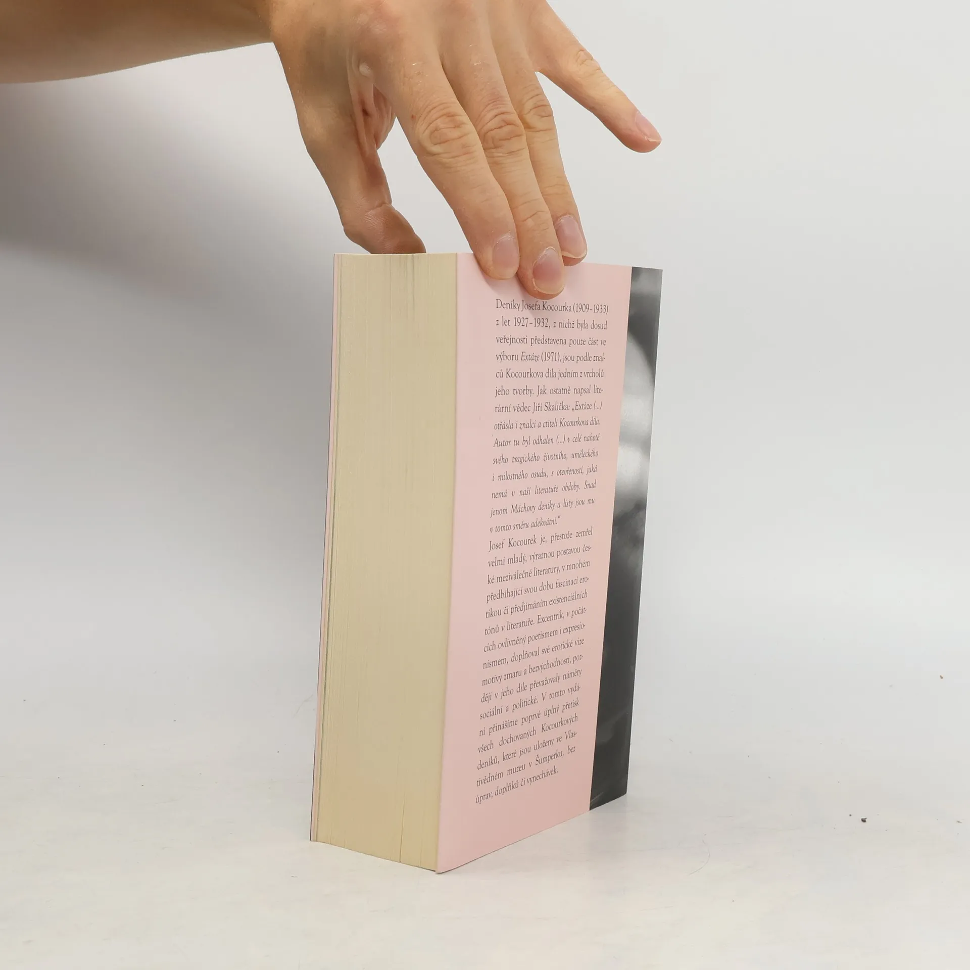Deníky Josefa Kocourka (1909–1933) z let 1927–1932, z nichž byla dosud veřejnosti představena pouze část ve výboru Extáze (1971), jsou podle znalců Kocourkova díla jedním z vrcholů jeho tvorby. Jak ostatně napsal literární vědec Jiří Skalička: „Extáze (...) otřásla i znalci a ctiteli Kocourkova díla. Autor tu byl odhalen (...) v celé nahotě svého tragického životního, uměleckého i milostného osudu, s otevřeností, jaká nemá v naší literatuře obdoby. Snad jenom Máchovy deníky a listy jsou mu v tomto směru adekvátní.“ Josef Kocourek je, přestože zemřel velmi mladý, výraznou postavou české meziválečné literatury, v mnohém předbíhající svou dobu fascinací erotikou či předjímáním existenciálních tónů v literatuře. Excentrik, v počátcích ovlivněný poetismem i expresionismem, doplňoval své erotické vize motivy zmaru a bezvýchodnosti, později v jeho díle převažovaly náměty sociální a politické. V tomto vydání přinášíme poprvé úplný přetisk všech dochovaných Kocourkových deníků, které jsou uloženy ve Vlastivědném muzeu v Šumperku, bez úprav, doplňků či vynechávek.