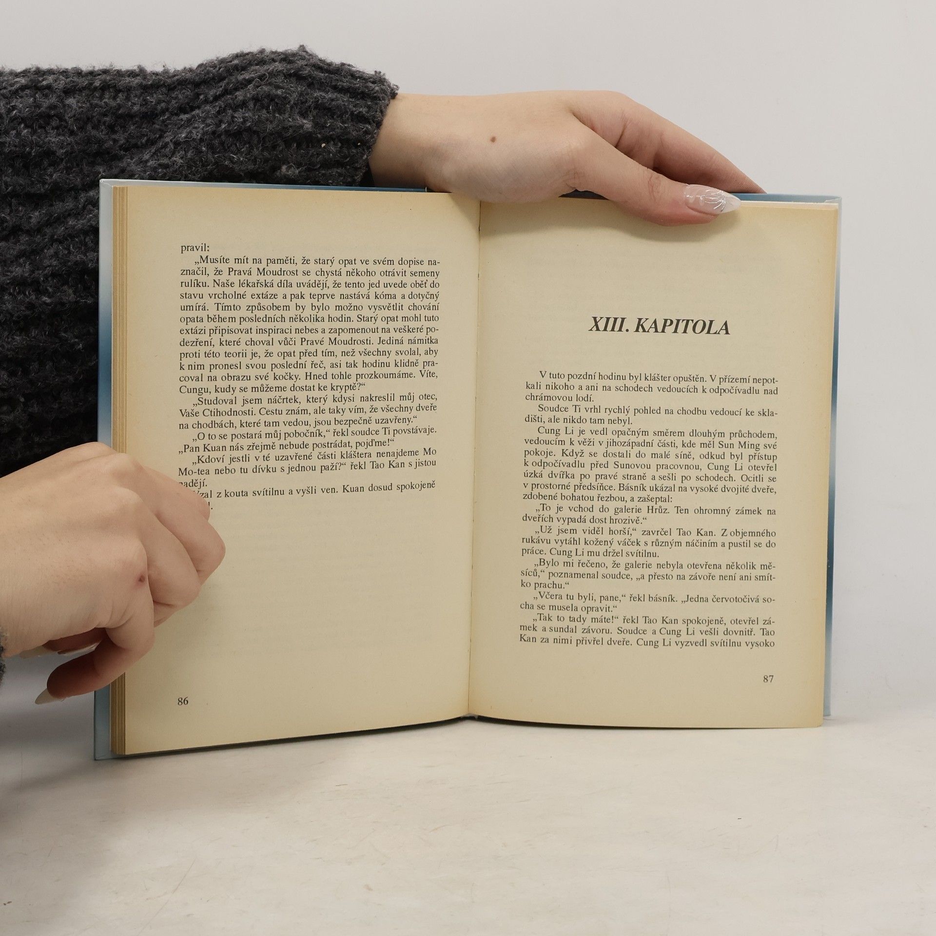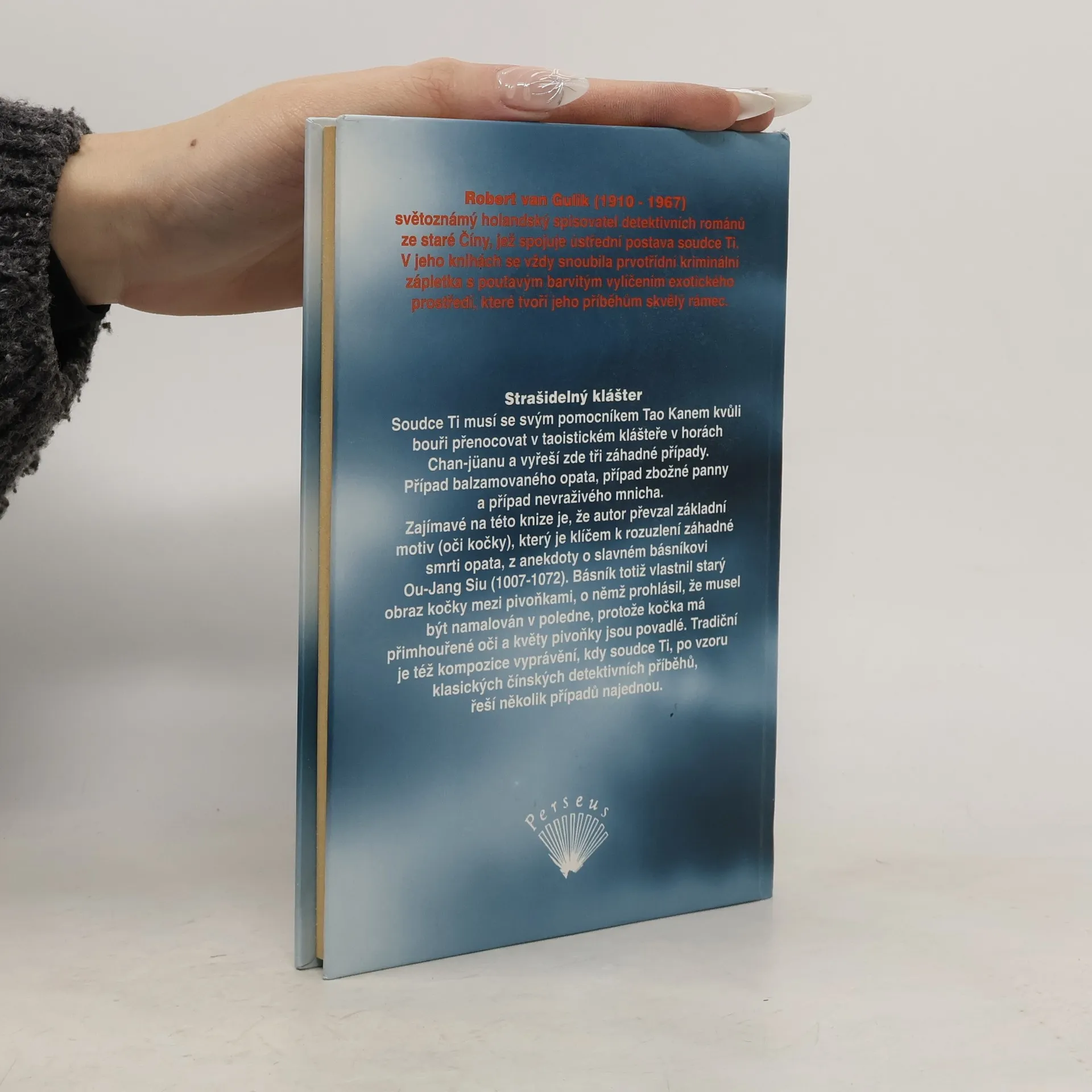 Soudce Ti musí se svým pomocníkem Tao Kanem kvůli bouři přenocovat v taoistickém klášteře v horách Chan-jüanu a vyřeší zde tři záhadné případy. Případ balzamovaného opata, případ zbožné panny a případ nevraživého mnicha. Zajímavé na této knize je, že autor převzal základní motiv (oči kočky), který je klíčem k rozuzlení záhadné smrti opata, z anekdoty o slavném básníkovi Ou-Jang Siu (1007 - 1072). Básník totiž vlastnil starý obraz kočky mezi pivoňkami, o němž prohlásil, že musel být namalován v poledne, protože kočka má přimhouřené oči a květy pivoňky jsou povadlé. Tradiční je též kompozice vyprávění, kdy soudce Ti, po vzoru klasických čínských detektivních příběhů, řeší několik případů najednou.