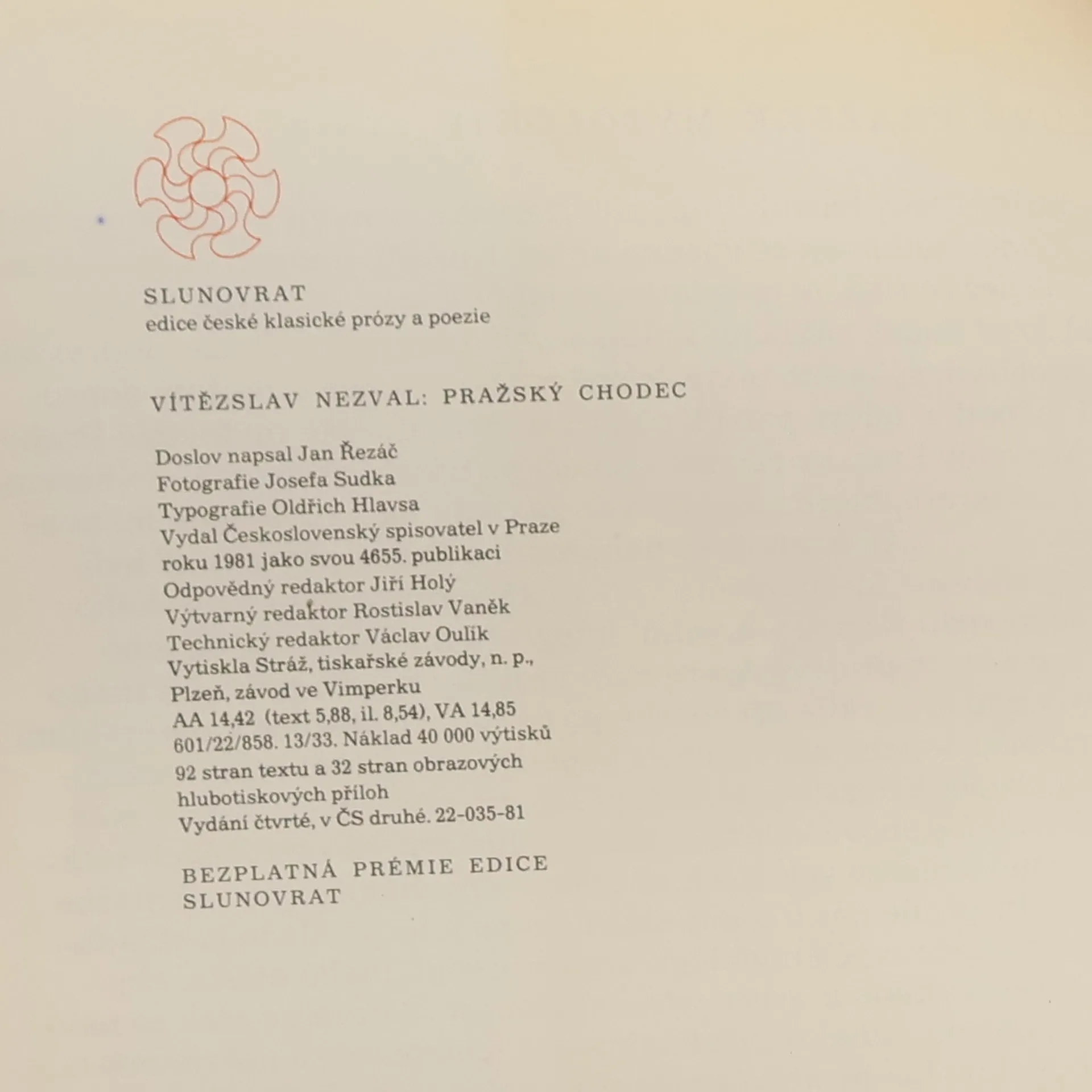 Lyrický zápisník jednoho Nezvalova pražského roku. Básník nás v něm provází známými i méně známými místy Prahy, objevuje skryté půvaby a poezii jejich zákoutí, vyslovuje okouzlení atmosférou svého milovaného města. Čtvrté vydání.