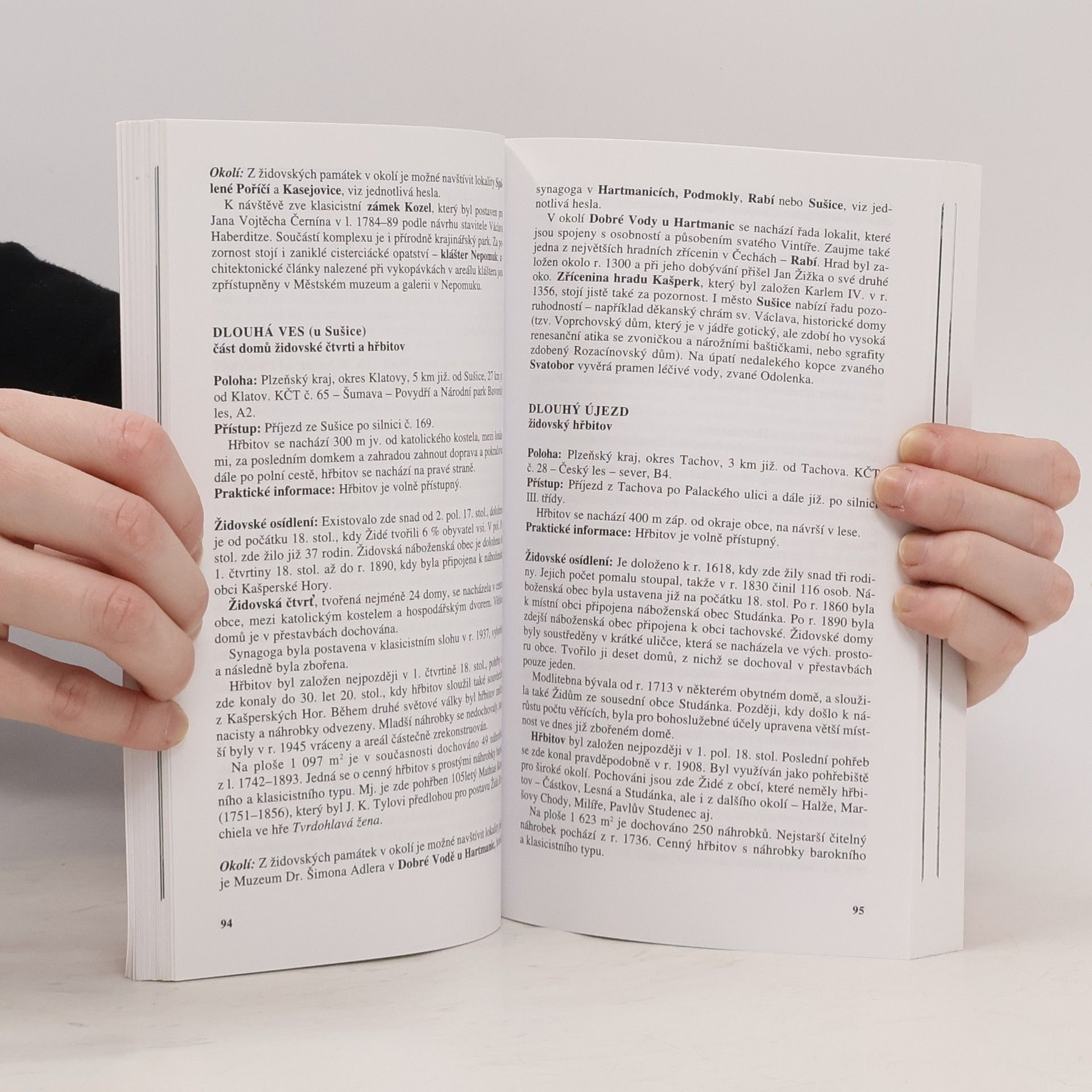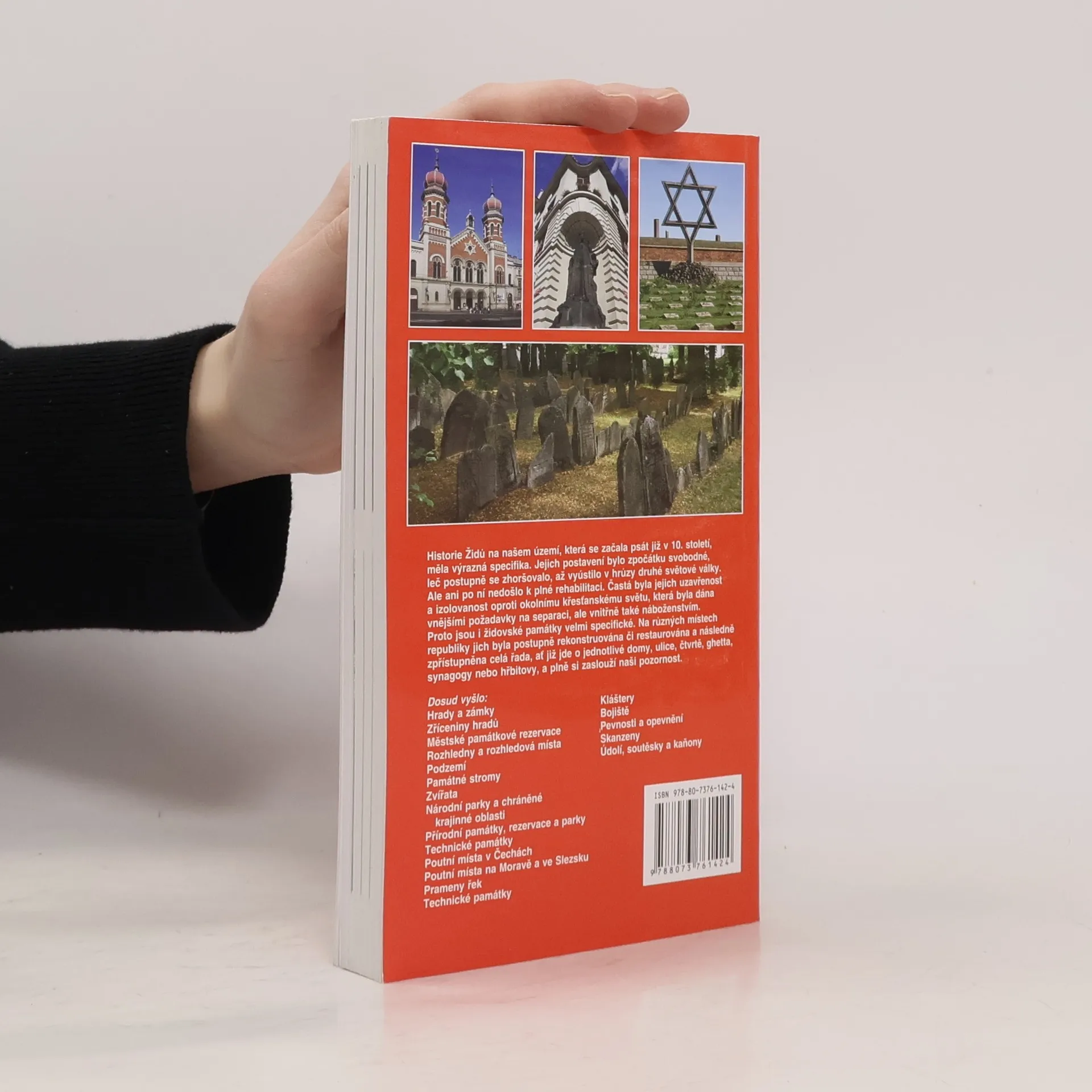 V dalším svazku červené řady se podíváme do mnoha měst a obcí, kde se dochovaly památky na židovskou komunitu, z velké části zničené během 2. světové války. Objevíme staré synagogy, často s pozoruhodnou architekturou, které dnes slouží jiným účelům, půvabné židovské hřbitovy, ukryté na okrajích obcí a chráněné vysokými zdmi, s pietou si prohlédneme místa kdysi plná života, do kterých se po posledním světovém konfliktu často neměl kdo vrátit a která někdy upadla v zapomnění... Velká pozornost je věnována pražským památkám a také jednomu z nejzachovalejších židovských ghett, které najdeme v Třebíči. Tam byly židovské památky nemalými prostředky obnoveny a dostaly se na Seznam přírodního a kulturního dědictví UNESCO. Kniha je doplněna barevnými fotografiemi.