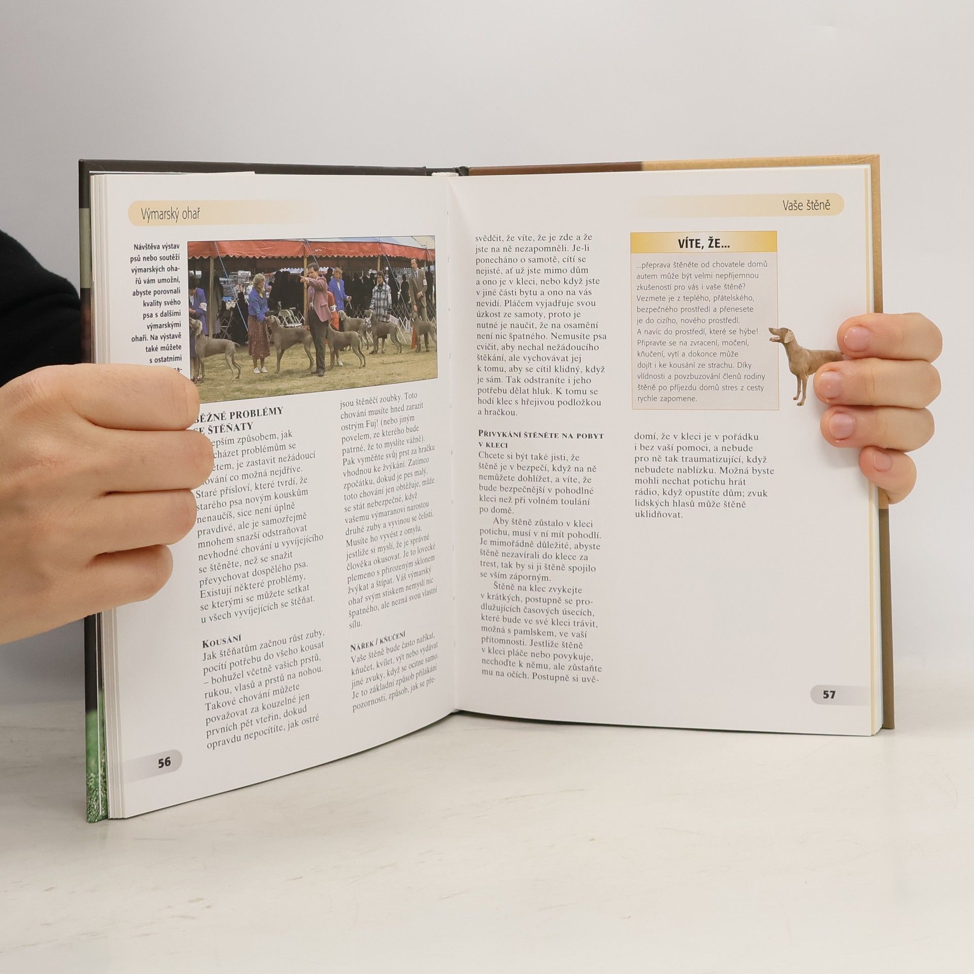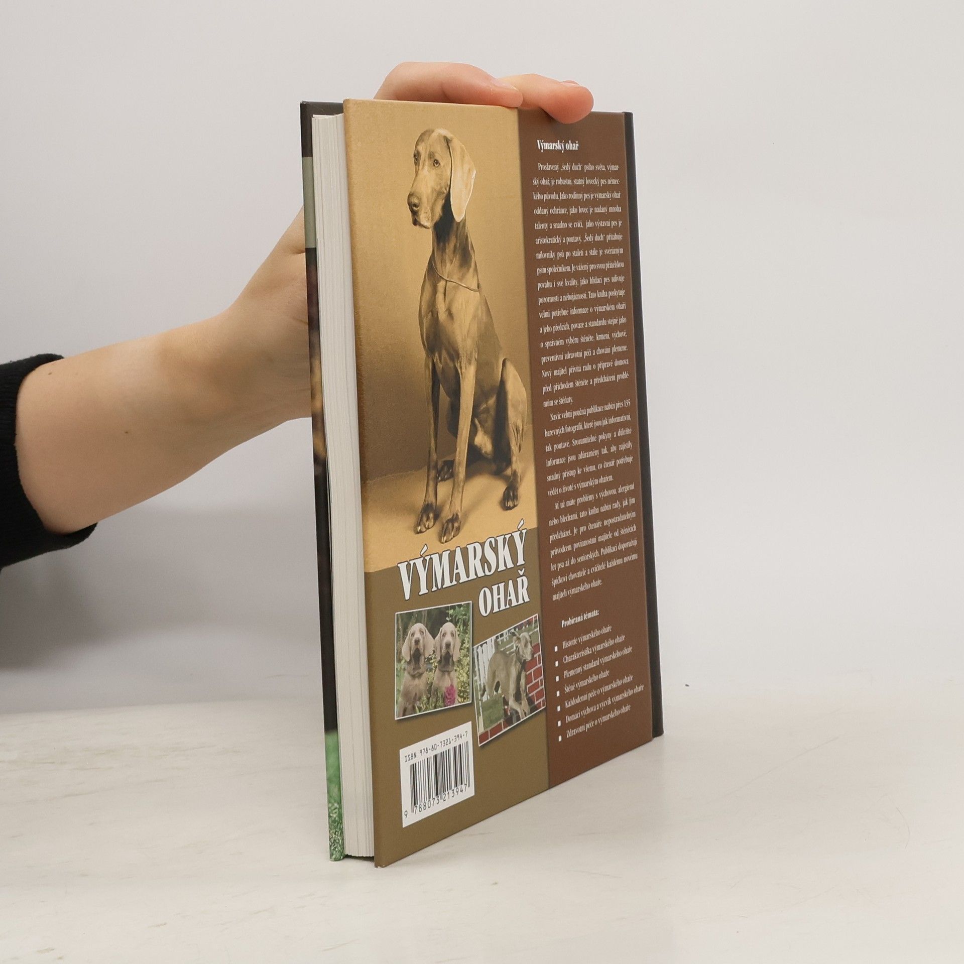 Špičková publikace obohacená množstvím barevných fotografií (více než 135) je doporučovaná předními odborníky každému majiteli výmarského ohaře, proslaveného "šedého ducha" psího světa, robustního, statného loveckého psa německého původu. Jako rodinný pes je výmarský ohař oddaný přítel a ochránce, jako lovec je nadaný mnoha talenty a snadno se cvičí, jako výstavní pes je aristokratický a poutavý.