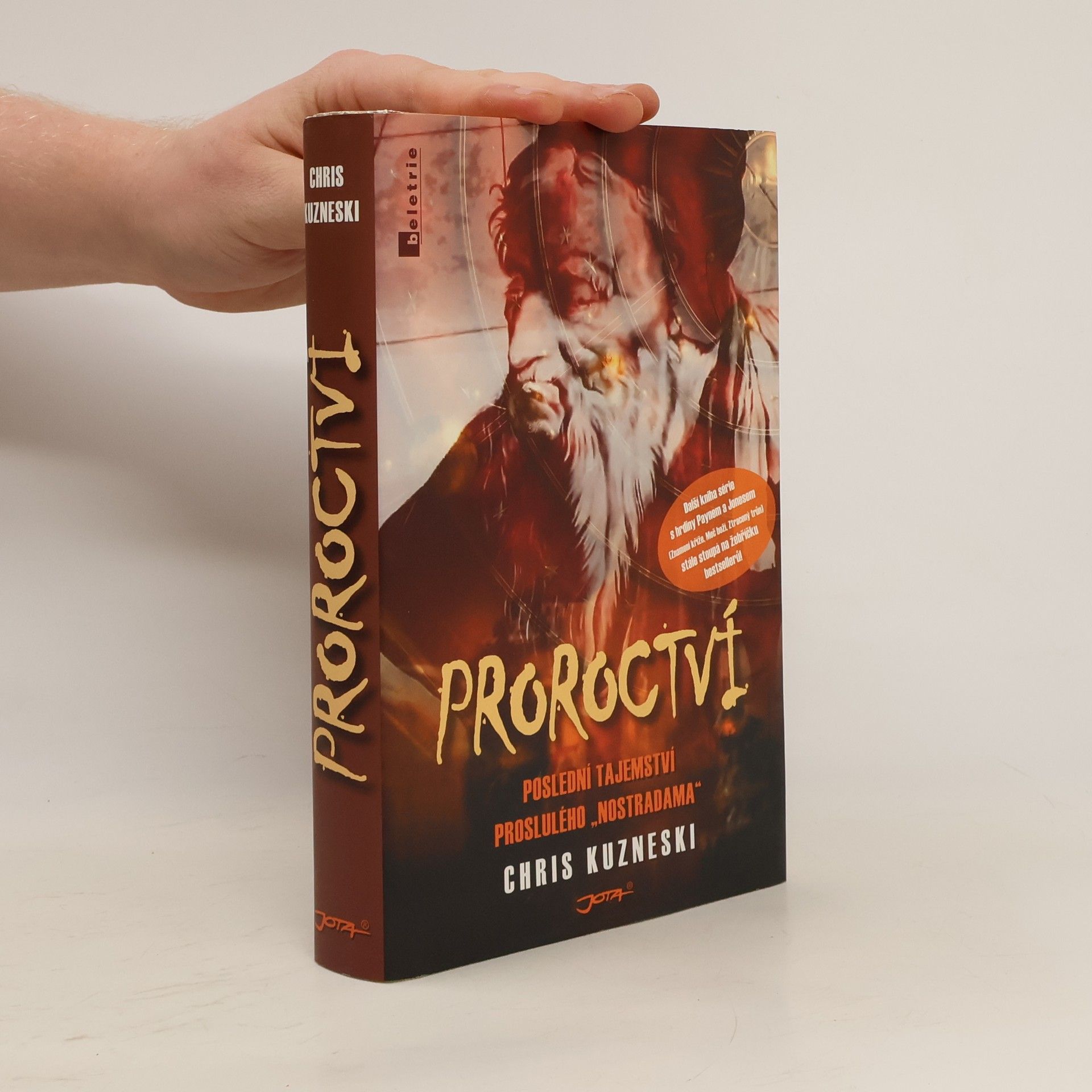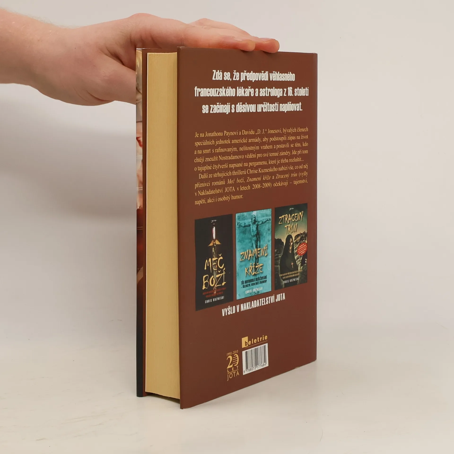 Jako by se předpovědi věhlasného francouzského lékaře a astrologa začínaly s děsivou přesností naplňovat! Je na Jonathonu Payneovi a Davidu „D. J.“ Jonesovi, bývalých členech speciálních jednotek americké armády, aby podstoupili zápas na život a na smrt s rafinovaným a nelítostným vrahem a postavili se těm, kdo chtějí zneužít Nostradamovo vědění pro své temné záměry. Hraje se o tajuplné čtyřverší napsané na pergamenu, které je třeba rozluštit… Další ze strhujících thrillerů Chrise Kuzneského nabízí vše, co od něj příznivci románů Meč boží, Znamení kříže a Ztracený trůn očekávají — tajemství, napětí, akci i osobitý humor.