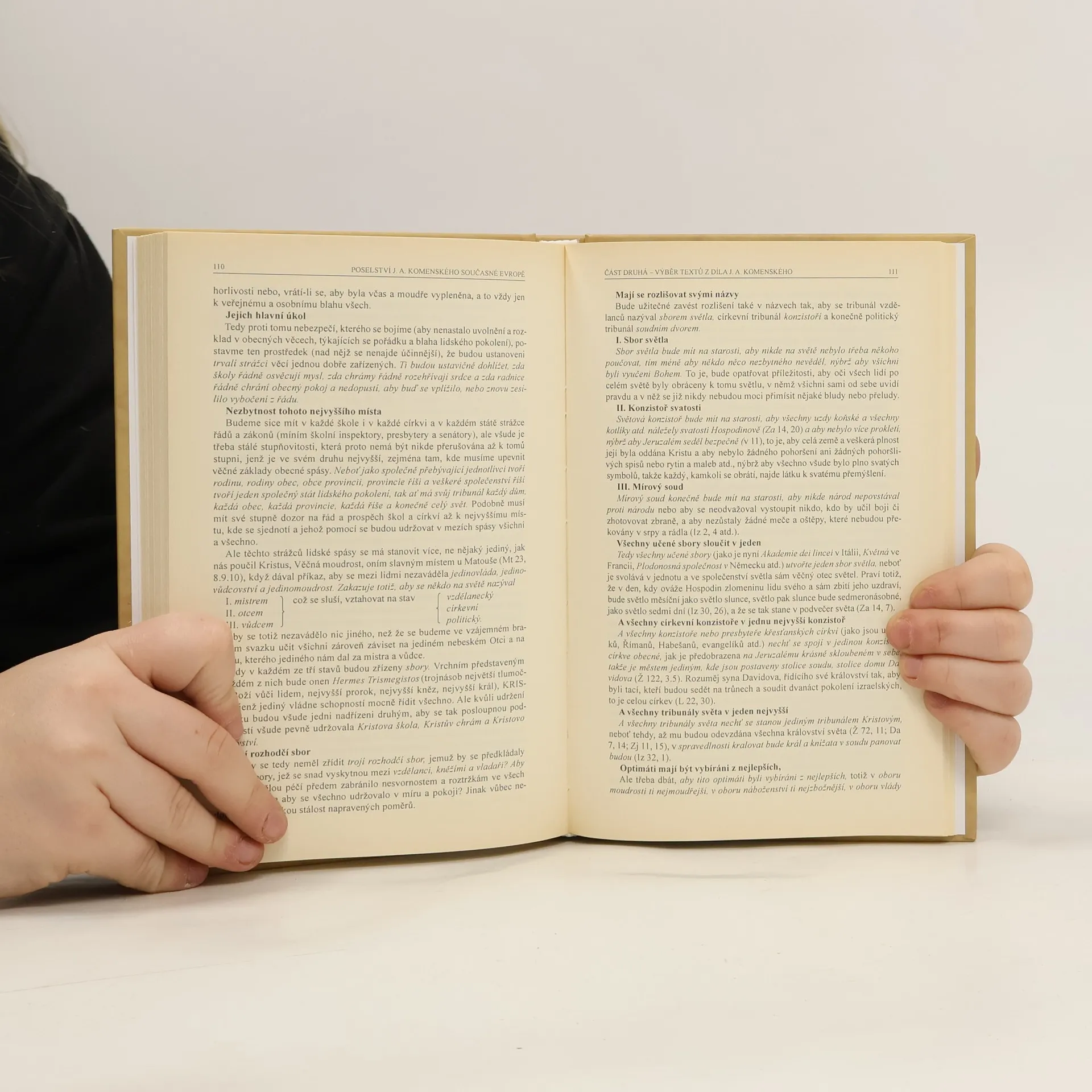 Studie předního evropského komeniologa, mimořádně čtivá a názorná, doplněná vybranými úryvky z díla J. A. Komenského. Při nahlédnutí na libovolnou stránku citací je zřetelná mimořádná mohutnost autorova ducha, který proniká skrze staletí a s břitkou aktualitou oslovuje jak jednotlivce, tak skupiny žijící v dnešní bouřlivé době. Vazba každého ze 1200 číslovaných výtisků je doplněna signovanou medailí s portrétem Jana Amose od akad. sochaře Andrého Víchy.