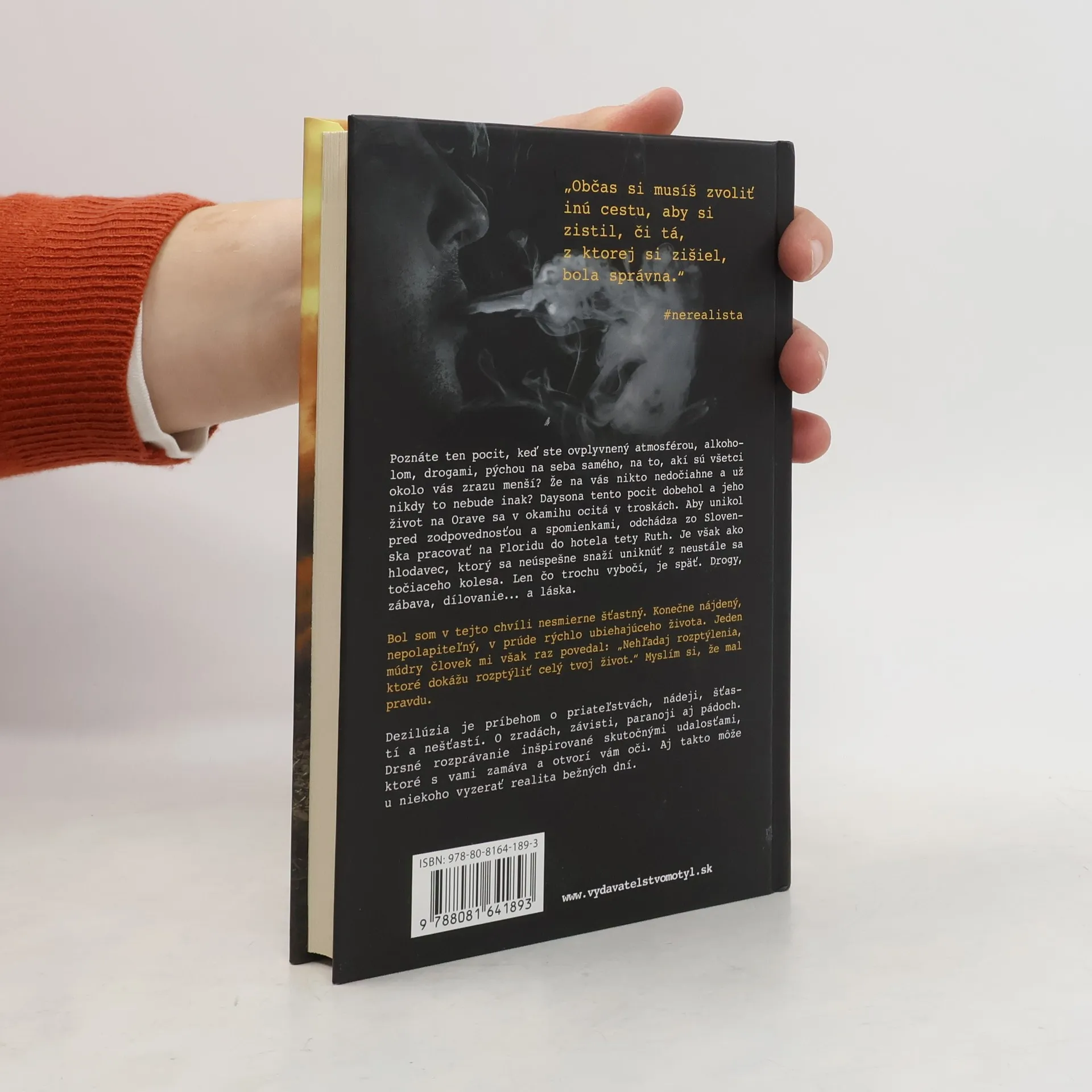 Občas musíš zvoliť inú cestu, aby si zistil, či tá, z ktorej si zišiel, bola správna. Poznáte ten pocit, keď ovplyvnený atmosférou, alkoholom, drogami a pýchou začínate mať pocit, že všetci naokolo sú zrazu akísi menší? Že na vás nikto nedočiahne a už nikdy to nebude inak? Daysona tento pocit dobehol a jeho život na Orave sa v okamihu ocitá v troskách. Aby unikol pred zodpovednosťou a spomienkami, odchádza zo Slovenska pracovať na Floridu do hotela tety Ruth. Je však ako hlodavec, ktorý sa neúspešne snaží uniknúť z neustále sa točiaceho kolesa... Len čo trochu vybočí, je späť. Drogy, zábava, dílovanie... a láska. Bol som v tejto chvíli nesmierne šťastný. Konečne nájdený, nepolapiteľný, v prúde rýchlo ubiehajúceho života. Jeden múdry človek mi však raz povedal: „Nehľadaj rozptýlenia, ktoré dokážu rozptýliť celý tvoj život.“ Myslím si, že mal pravdu. Dezilúzia je príbehom o priateľstvách, nádeji, šťastí a nešťastí. O zradách, závisti, paranoji aj pádoch. Drsné rozprávanie inšpirované skutočnými udalosťami, ktoré s vami zamáva a otvorí vám oči. Aj takto môže u niekoho vyzerať realita bežných dní.