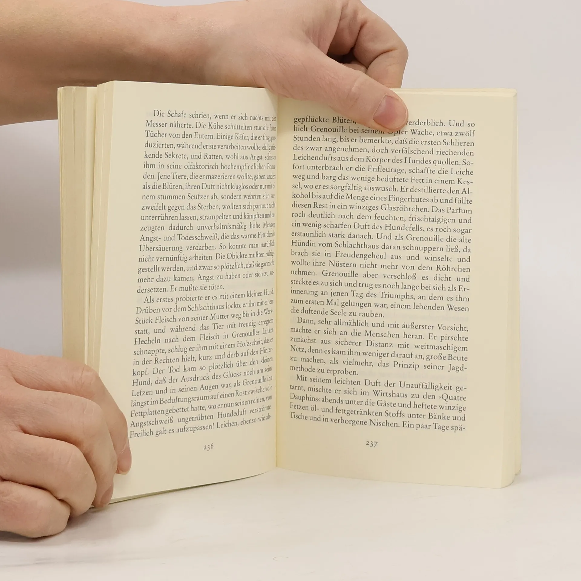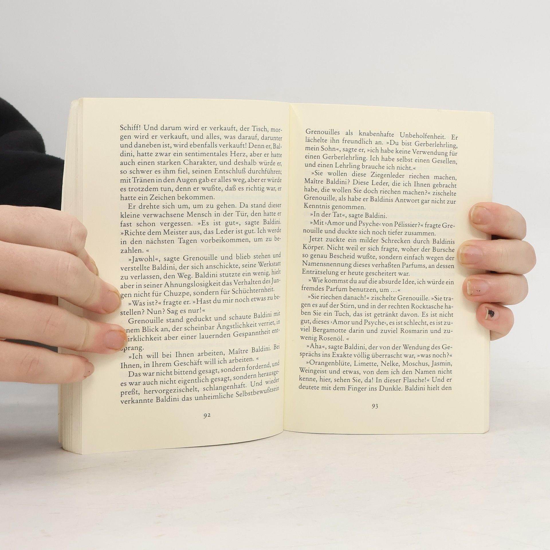 Von Jean-Baptiste Grenouille, dem finsteren Helden, sei nur verraten, daß er 1738 in Paris, in einer stinkigen Fischbude, geboren wird. Die Ammen, denen das Kerlchen an die Brust gelegt wird, halten es nur ein paar Tage mit ihm aus: Er sei zu gierig, außerdem vom Teufel besessen, wofür es untrügliche Indizien gebe: den fehlenden Duft, den unverwechselbaren Geruch, den Säuglinge auszuströmen pflegen.