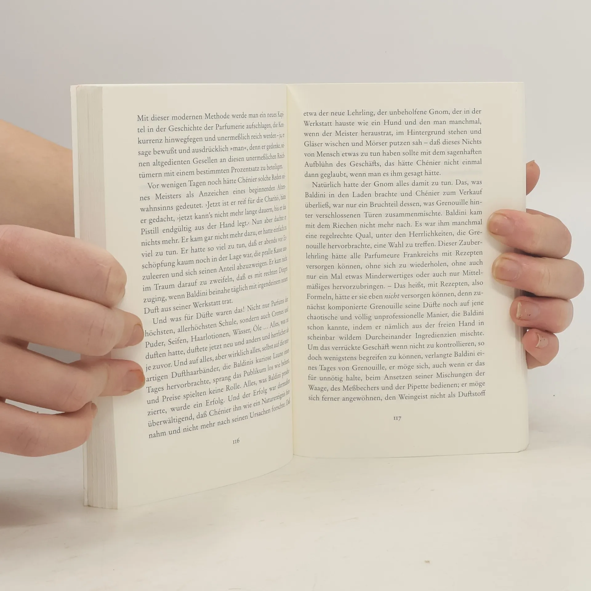 Von Jean-Baptiste Grenouille, dem finsteren Helden, sei nur verraten, daß er 1738 in Paris, in einer stinkigen Fischbude, geboren wird. Die Ammen, denen das Kerlchen an die Brust gelegt wird, halten es nur ein paar Tage mit ihm aus: Er sei zu gierig, außerdem vom Teufel besessen, wofür es untrügliche Indizien gebe: den fehlenden Duft, den unverwechselbaren Geruch, den Säuglinge auszuströmen pflegen.