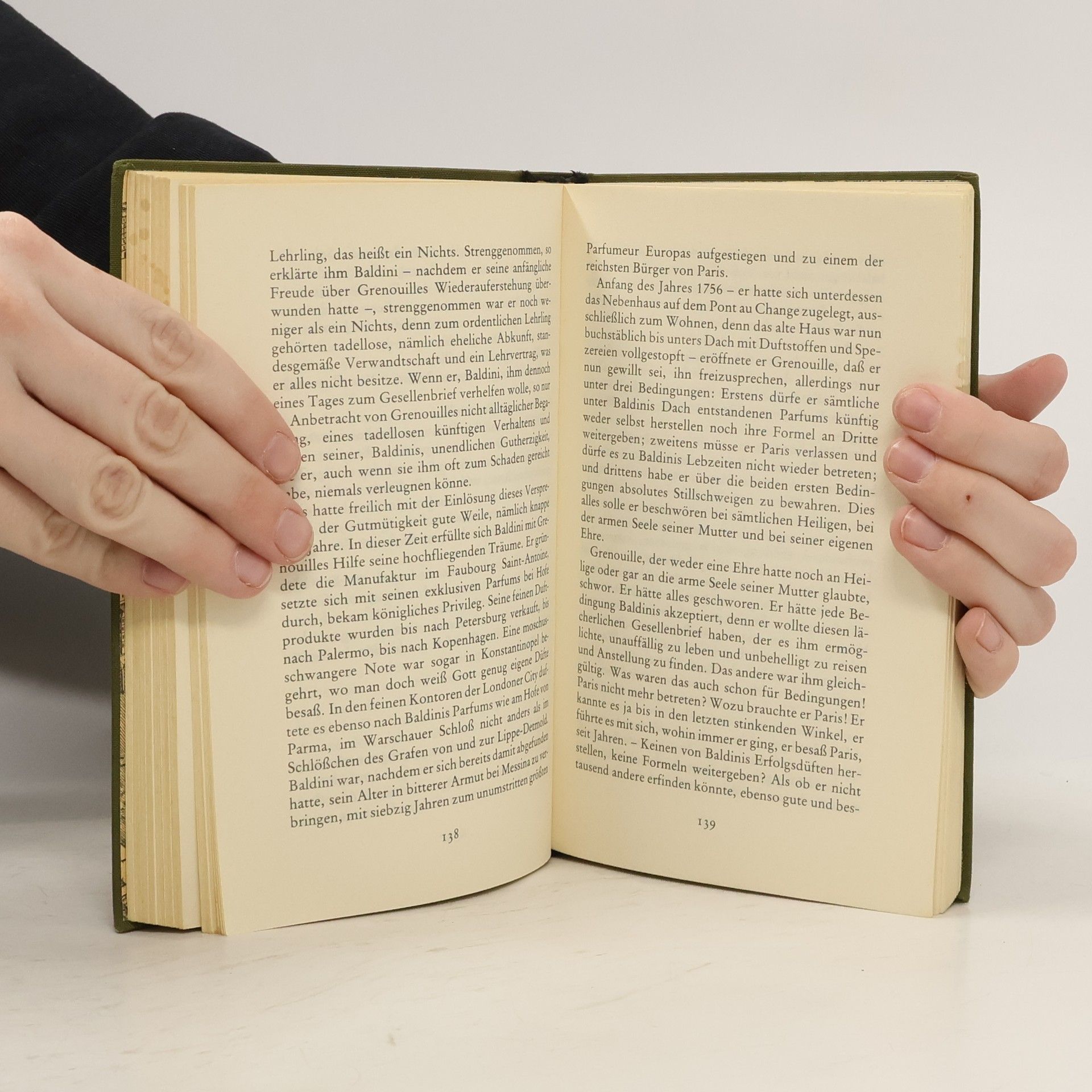 'Von Jean-Baptiste Grenouille, dem finsteren Helden, sei nur verraten, daß er 1738 in Paris, in einer stinkigen Fischbude, geboren wird. Die Ammen, denen das Kerlchen an die Brust gelegt wird, halten es nur ein paar Tage mit ihm aus: Er sei zu gierig, außerdem vom Teufel besessen, wofür es untrügliche Indizien gebe: den fehlenden Duft, den unverwechselbaren Geruch, den Säuglinge auszuströmen pflegen.'