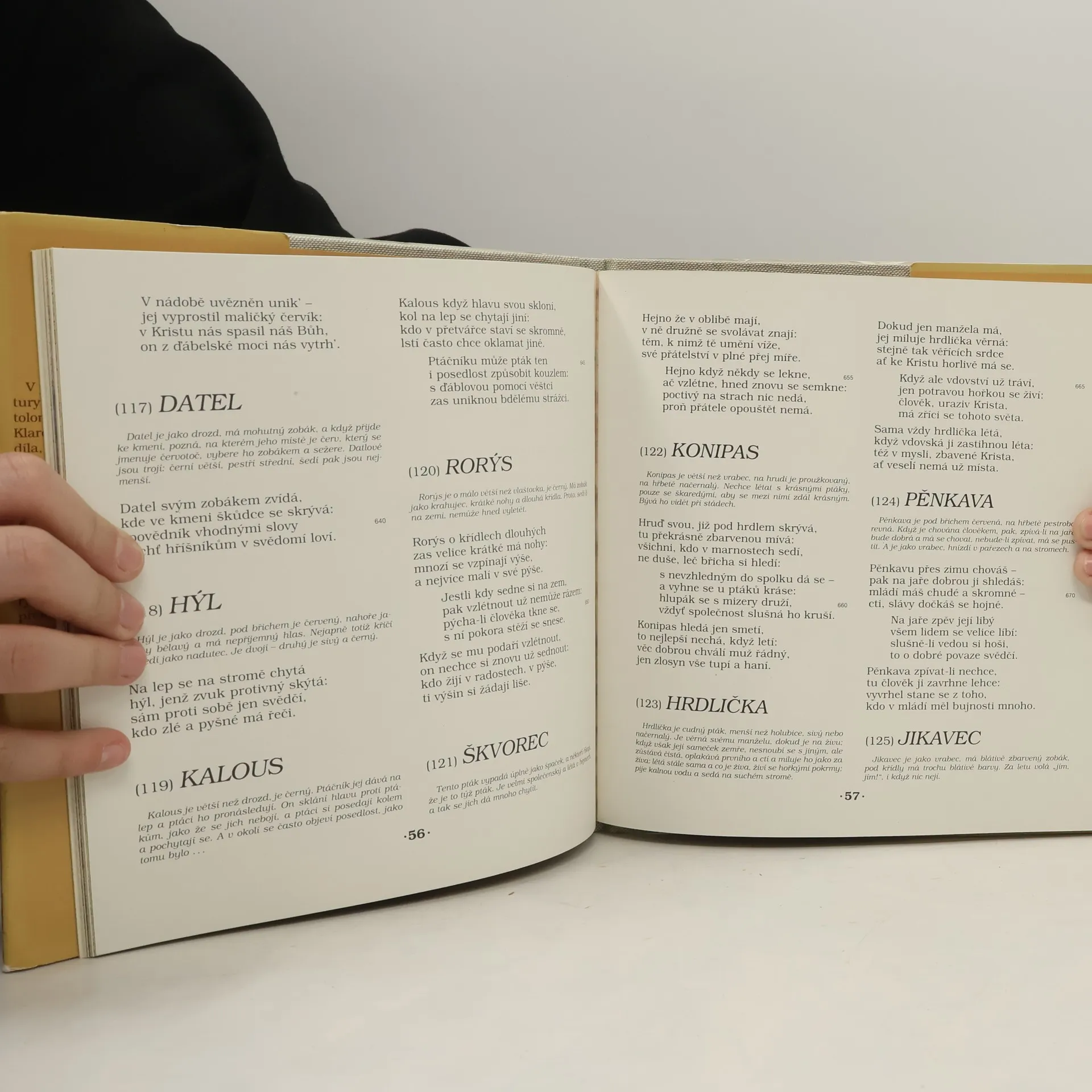 Kniha obsahuje veršovanou skladbu napsanou ve 14. stol. Ukázka z knihy: (88) SVĚTLUŠKA Světluška je malý létavec o mnoha nohách s křídly – proto se počítá mezi létavce. Ve tmě svítí jako svíce, nejvíce svou zadní částí. Na světle je ale nevzhledná a tmavá. Když se dotkne ruky, zbarví ji. Je velká jako včelka. Přízniv jí není svit denní, tam svítí však, světlo kde není: kdo se zle ve světě mají, ti září pak v nebeském ráji. Světlušky o mnoha nohou se v temnotě rozzářit mohou: pro svět kdo posledním je, má první být v radostech ráje. (Klaret, 1991, s. 47)... celý text