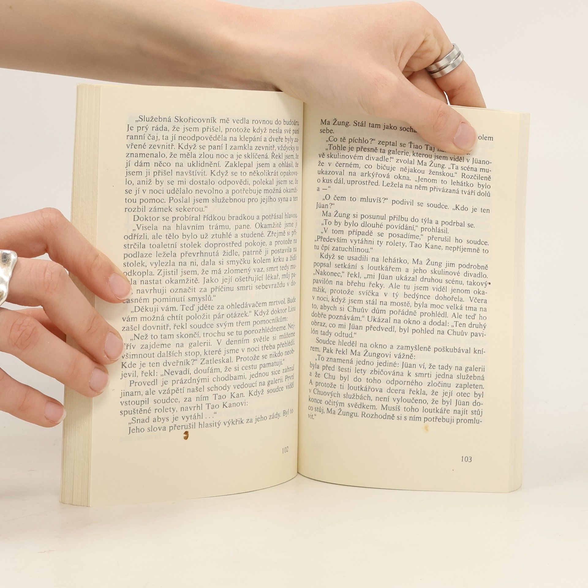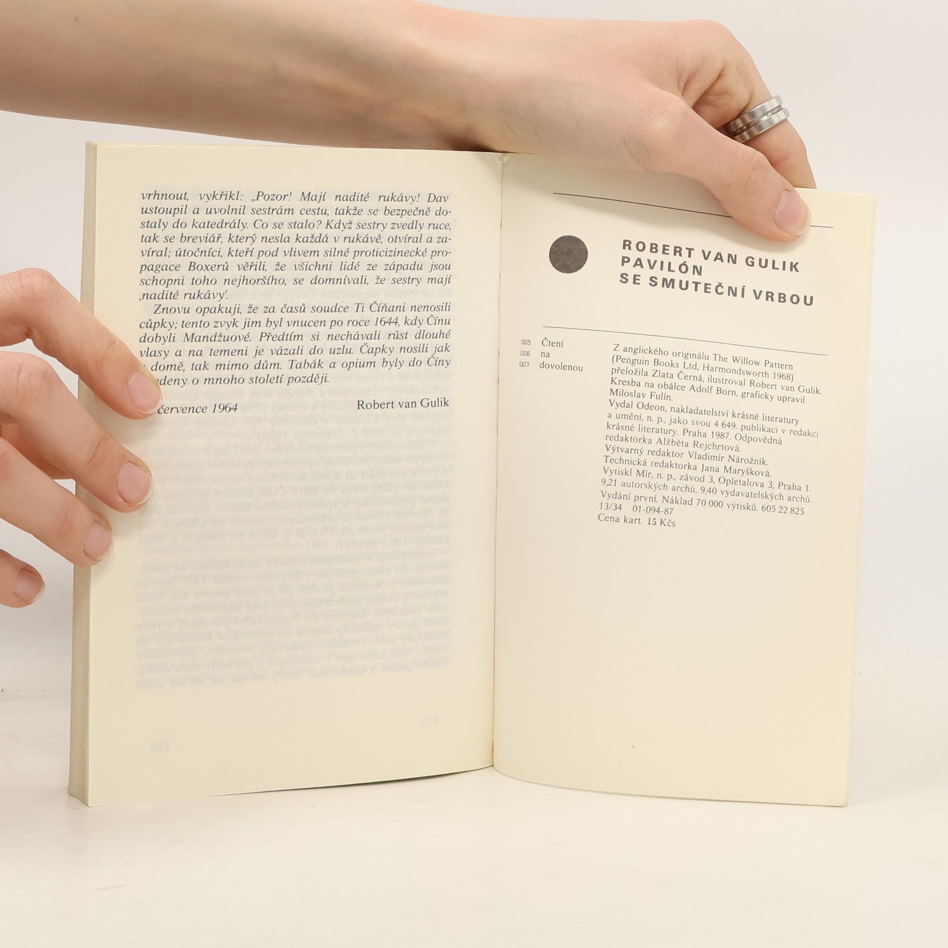 Tři případy, které opět řeší soudce Ti, se odehrávají v Číně v 7. století našeho letopočtu. Soudce Ti se zde za pomoci svých tří pomocníků zabývá vraždou potomků ze starých šlechtických rodů Ia a Meje, které spolu velice úzce souvisejí. Jakou roli v tom hraje motiv pavilónu se smuteční vrbou, loutkové divadlo, modrobílá porcelánová váza a kámen na roztírání tuše? Dovětek autora, černobílé autorovy ilustrace, na obálce ilustrace Adolfa Borna. 180 stran. Vydal Odeon v r. 1987 v edici Čtení na dovolenou.