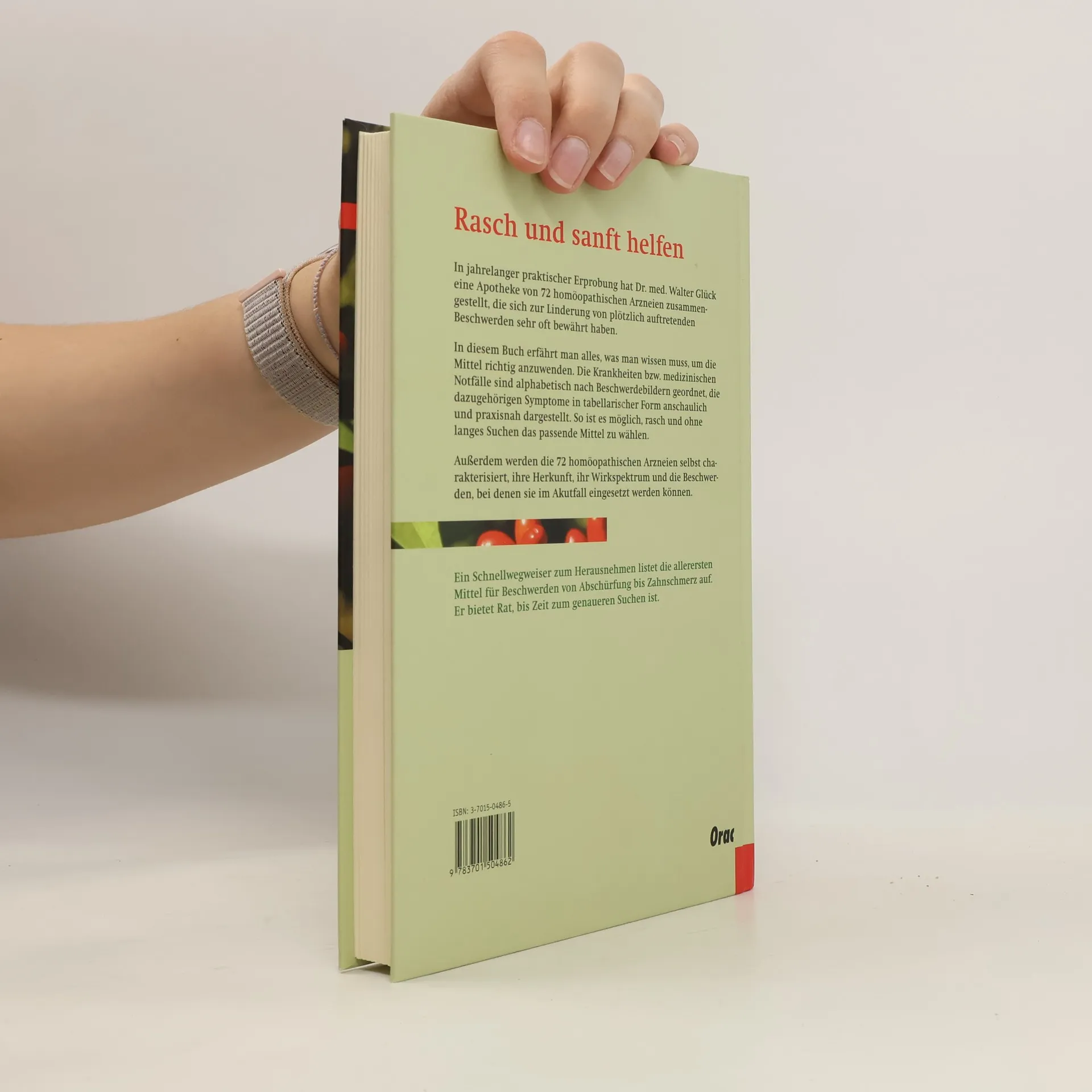 Rasch und sanft heilen Viele Auflagen wurden von der „Homöopathischen Notfallapotheke“ bisher verkauft. Diese aktualisierte Auflage enthält zusätzlich einen Schnellwegweiser zum Herausnehmen, der die allerersten Mittel für Beschwerden von Abschürfung bis Zahnschmerz aufzeigt. In jahrelanger praktischer Erprobung hat Dr. med. Walter Glück eine Apotheke von 72 homöopathischen Arzneien zusammengestellt, die sich zur Linderung von plötzlich auftretenden Beschwerden sehr oft bewährt haben. In diesem Buch erfährt man alles, was man wissen muss, um die Mittel richtig anzuwenden. Die Krankheiten bzw. medizinischen Notfälle sind alphabetisch nach Beschwerdebildern geordnet, die dazugehörigen Symptome in tabellarischer Form anschaulich und praxisnah dargestellt. So ist es möglich, rasch und ohne langes Suchen das passende Mittel zu wählen. Außerdem werden die 72 homöopathischen Arzneien selbst charakterisiert, ihre Herkunft, ihr Wirkspektrum und die Beschwerden, bei denen sie im Akutfall besonders hilfreich sein können.