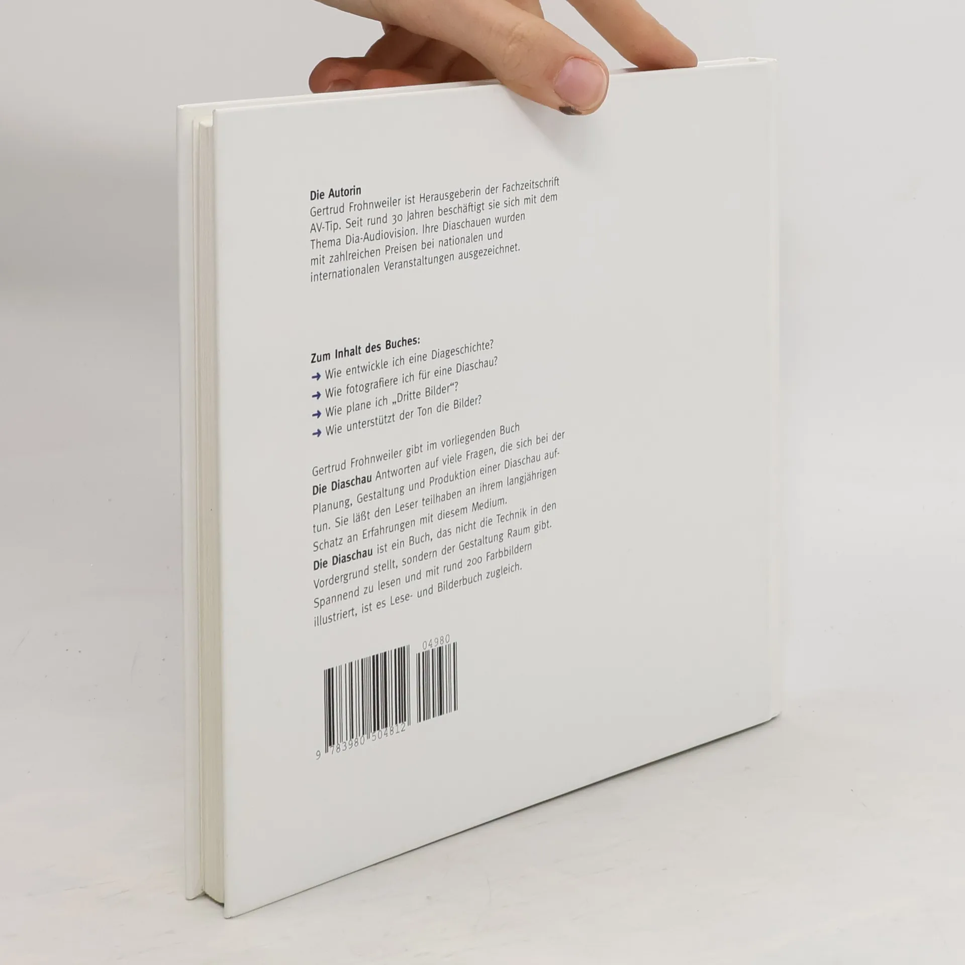Gertrud Frohnweiler gibt im vorliegenden Buch „Die Diaschau“ Antworten auf viele Fragen, die sich bei der Planung, Gestaltung und Produktion einer Diaschau auftun. Sie lässt den Leser teilhaben an ihrem langjährigen Schatz an Erfahrungen mit diesem Medium. Die Diaschau ist ein Buch, das nicht die Technik in den Vordergrund stellt, sondern der Gestaltung Raum gibt.
