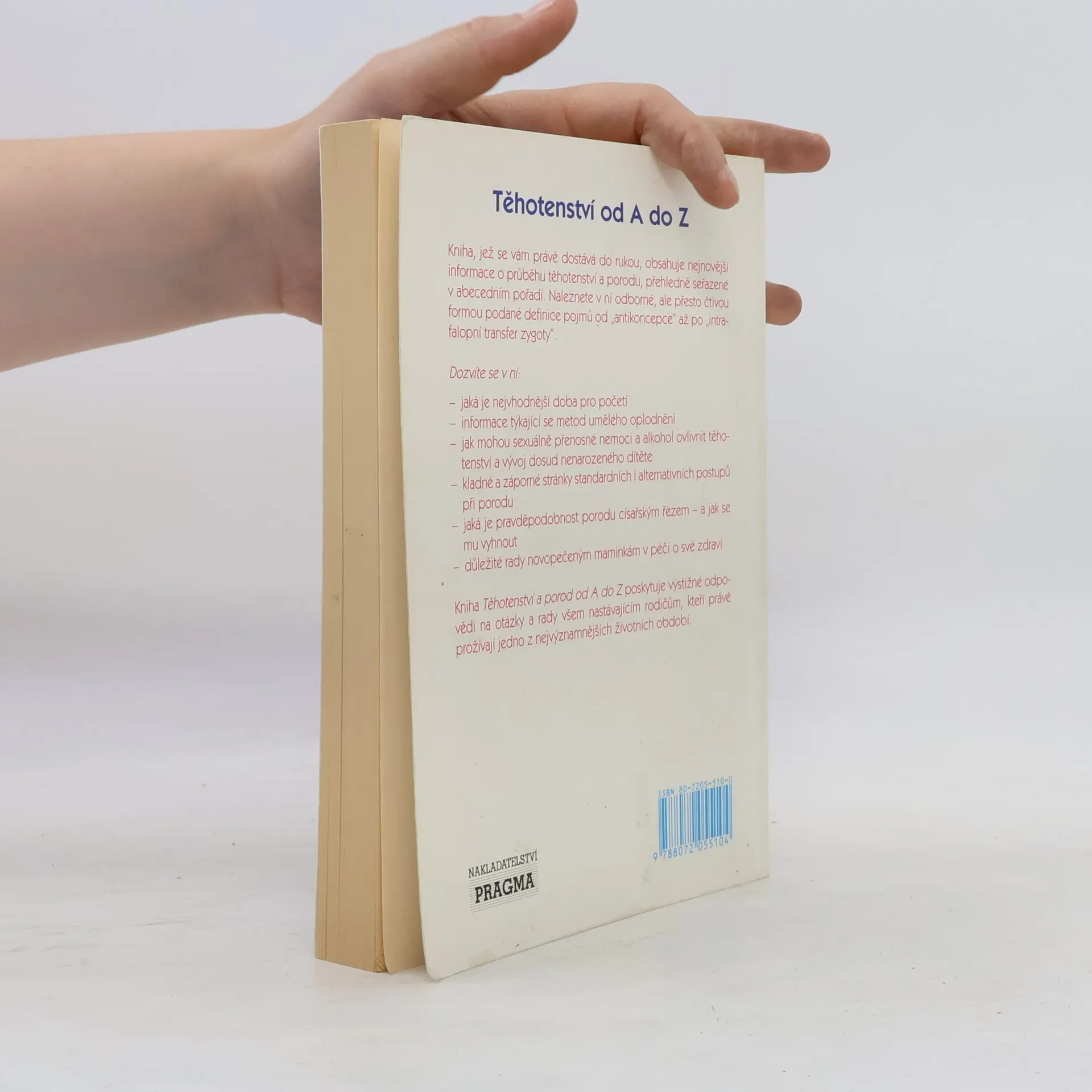 Kniha obsahuje nejnovější informace o průběhu těhotenství a porodu, přehledně seřazené v abecedním pořadí. Naleznete v ní odborné, ale přesto čtivou formou podané definice pojmů od "antikoncepce" až po "intrafalopní transfer zygoty". Dozvíte se v ní: - jaká je nejvhodnější doba pro početí - informace týkající se metod umělého oplodnění - jak mohou sexuálně přenosné nemoci a alkohol ovlivnit těhotenství a vývoj dosud nenarozeného dítěte - kladné a záporné stránky standardních i alternativních postupů při porodu - jaká je pravděpodobnost porodu císařským řezem - a jak se mu vyhnout - důležité rady novopečeným maminkám v péči o své zdraví Kniha Těhotenství a porod od A do Z poskytuje výstižné odpovědi na otázky a rady všem nastávajícím rodičům, kteří právě prožívají jedno z nejvýznamnějších životních období.