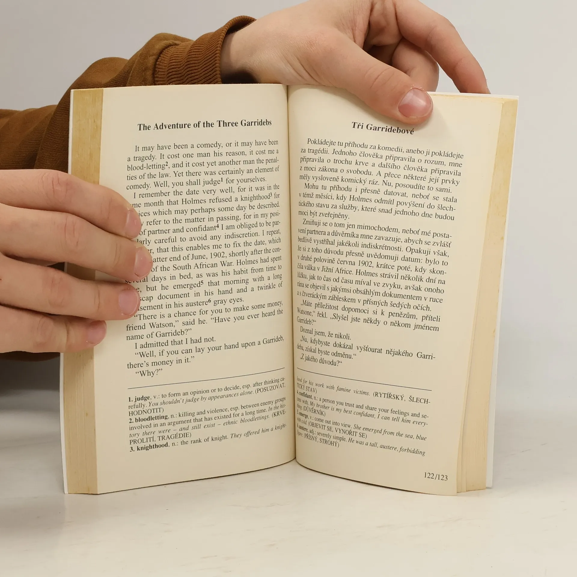 V dvojjazyčné edici Bilingua přinášíme další příběhy s promyšlenou zápletkou z viktoriánské Anglie, v nichž Sherlock Holmes opět exceluje jako mistr neúprosné dedukce. Výbor obsahuje povídky Mazarinův drahokam, Dům U tří štítů a Tři Garridebové.