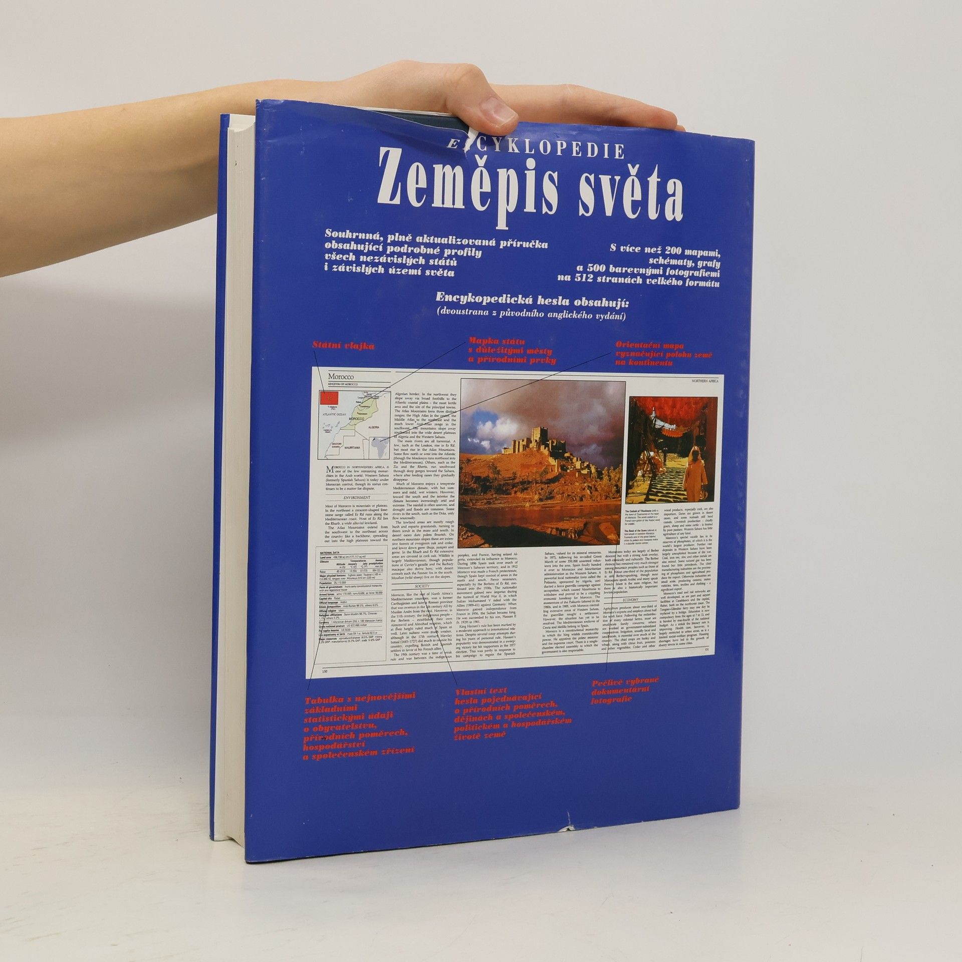 V posledním desetiletí jsme byli svědky posunů hranic a vzniku nových států, ale dosud chyběla souhrnná příručka, která by informovala o těchto změnách. Encyklopedie Zeměpis světa se zaměřuje na všechny země, včetně těch vzniklých po rozpadu SSSR, Jugoslávie a Československa. Obsahuje podrobné profily 189 zemí, které jsou mnohem obsáhlejší než obvyklé encyklopedické svazky, a zahrnuje mapy, fakta, statistiky a fotografie, což ji činí jednou z nejpraktičtějších příruček. Rozsah hesel se liší, od 50 stran pro USA po jednostránkové profily menších zemí, přičemž každé heslo je založeno na aktuálních údajích a strukturováno tak, aby usnadnilo porovnávání. Profily zahrnují tři hlavní oddíly: Přírodní poměry, Společnost a Hospodářství, popisující klimatické podmínky, historické události, kulturu a hospodářství. Země jsou rozděleny podle geografických oblastí, přičemž každá má svou mapu a obsahuje státní vlajku, umístění na kontinentu a základní statistické údaje. Některá hesla obsahují i ilustrované články o unikátních kulturních a historických jevech. V knize jsou uvedena chybná ISBN 80-901727-6-8 a 80-7176-022-6.