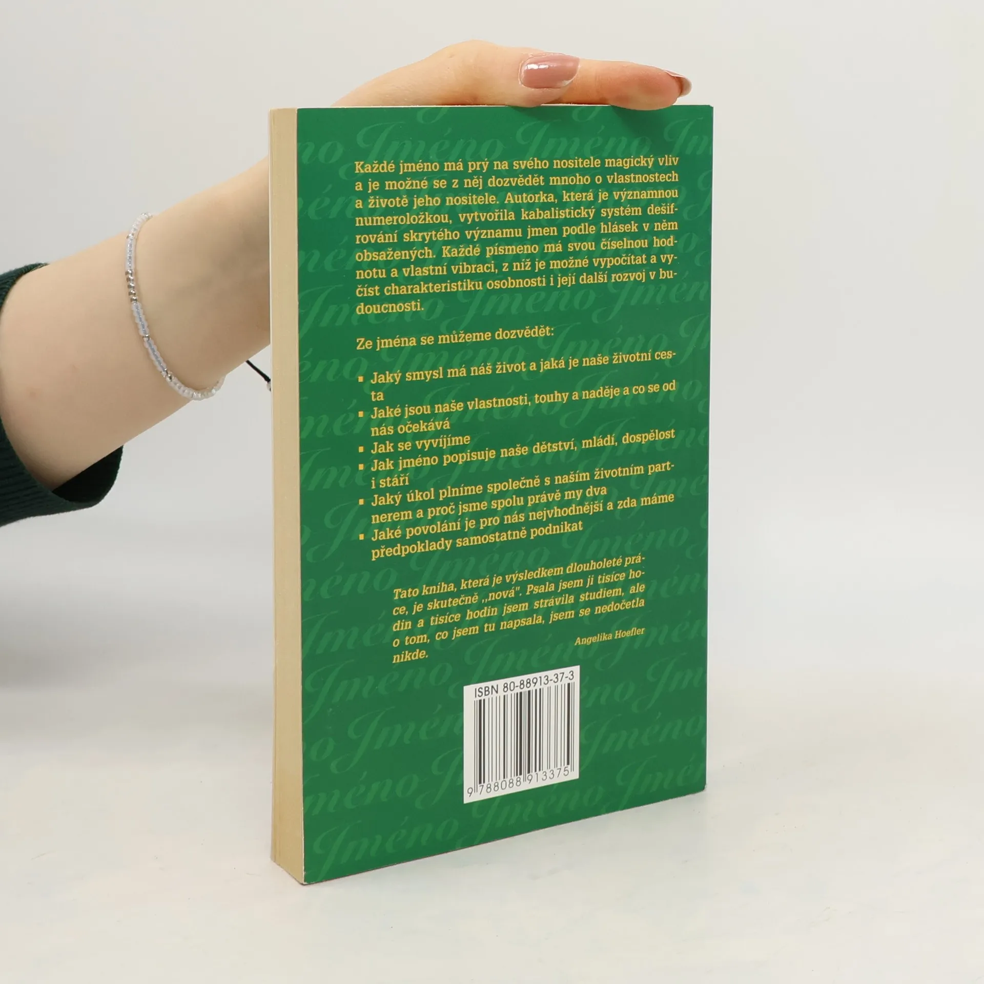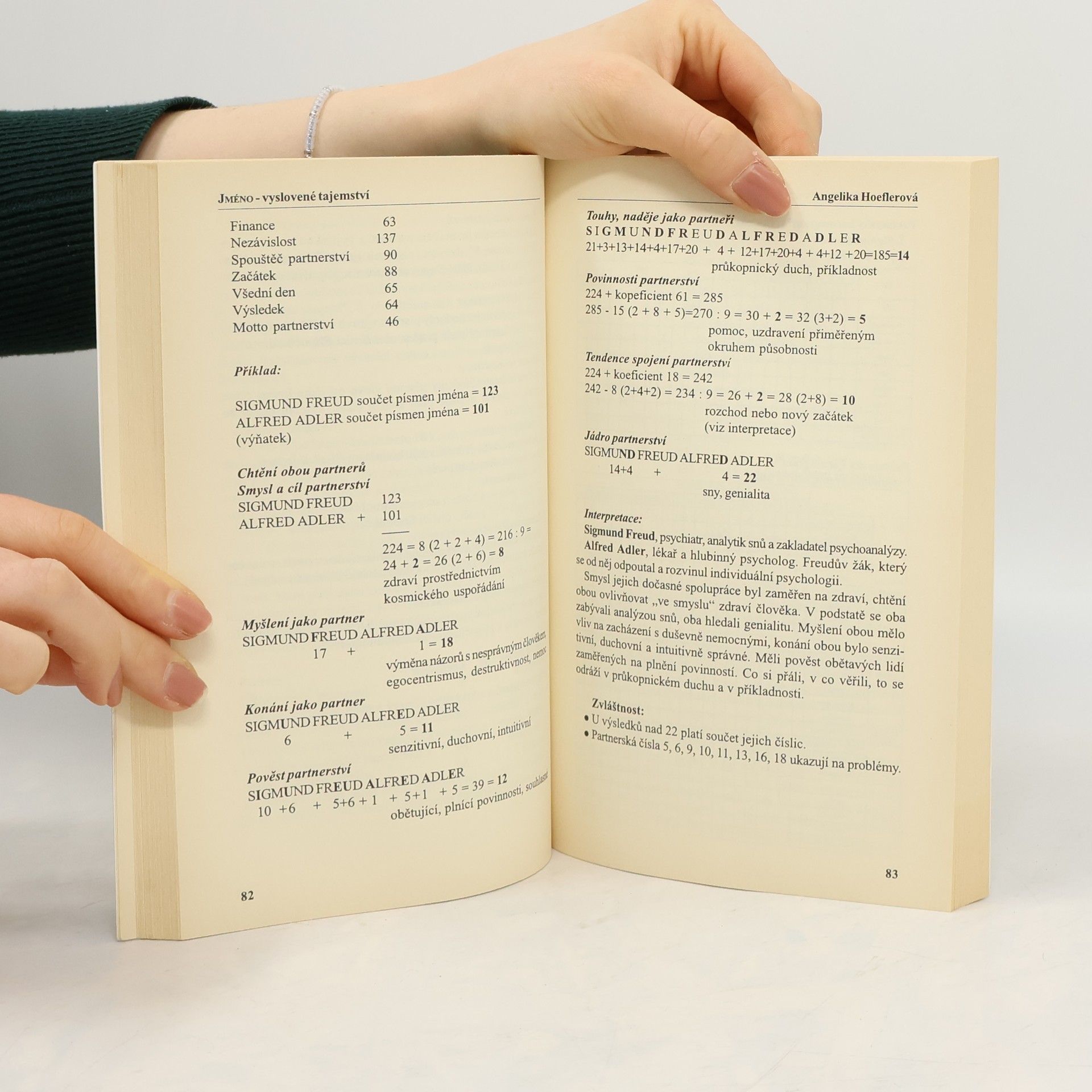 Každé jméno má prý na svého nositele magický vliv a je možné se z něj dozvědět mnoho o vlastnostech a životě jeho nositele. Autorka, která je významnou numeroložkou, vytvořila kabalistický systém dešifrování skrytého významu jmen podle hlásek v něm obsaženým. Každé písmeno má svou číselnou hodnotu a vlastní vibraci, z nichž je možné vypočítat a vyčíst charakteristiku osobnosti i její další rozvoj v budoucnosti.