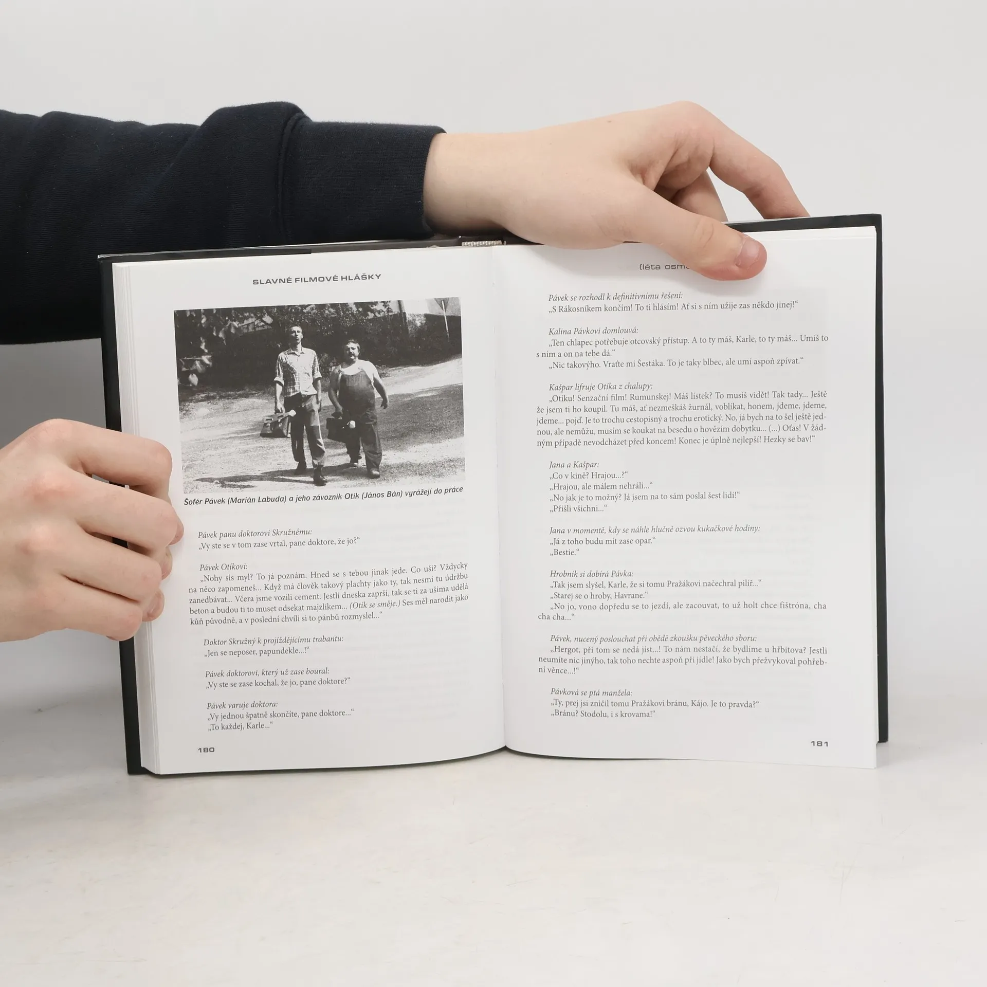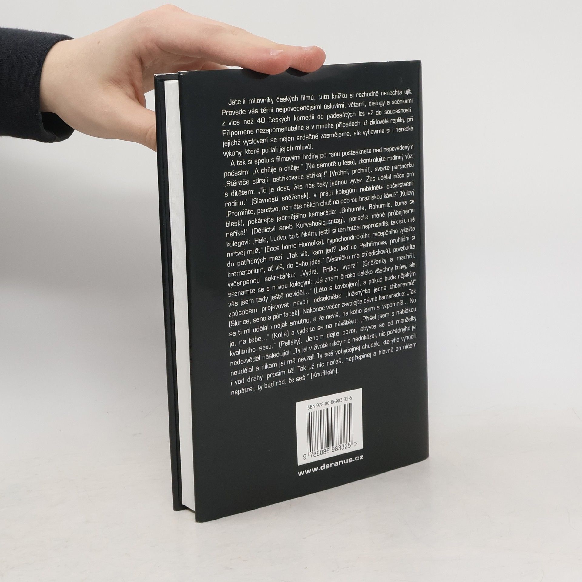 Pokud jste fanouškem českých filmů, tato knížka je pro vás nezbytná. Provede vás nejpovedenějšími úslovími, větami a scénkami z více než 40 českých komedií od padesátých let až po současnost. Připomene nezapomenutelné repliky, které nás nejen pobaví, ale také vyvolají vzpomínky na herecké výkony. Společně s filmovými hrdiny si můžete postesknout nad špatným počasím: „A chčije a chčije.“ (Na samotě u lesa), zkontrolovat rodinný vůz: „Stěrače stírají, ostřikovače stříkají!“ (Vrchní, prchni!), nebo povzbudit partnerku: „To je dost, žes nás taky jednou vyvez. Žes udělal něco pro rodinu.“ (Slavnosti sněženek). V práci můžete nabídnout kolegům občerstvení: „Promiňte, panstvo, nemáte někdo chuť na dobrou brazilskou kávu?“ (Kulový blesk) nebo pokárat kamaráda: „Bohumile, Bohumile, kurva se neříká!“ (Dědictví aneb Kurvahošigutntag). A pokud se setkáte s novou kolegyní, můžete říct: „Já znám široko daleko všechny krávy, ale vás jsem tady ještě neviděl...“ (Léto s kovbojem). Na závěr zavolejte kamarádce: „Tak se ti mi udělalo nějak smutno, a že nevíš, na koho jsem si vzpomněl... No jo, na tebe...“ (Kolja) a vydejte se na návštěvu: „Přišel jsem s nabídkou kvalitního sexu.“ (Pelíšky). Dejte si však pozor na reakce manželky!