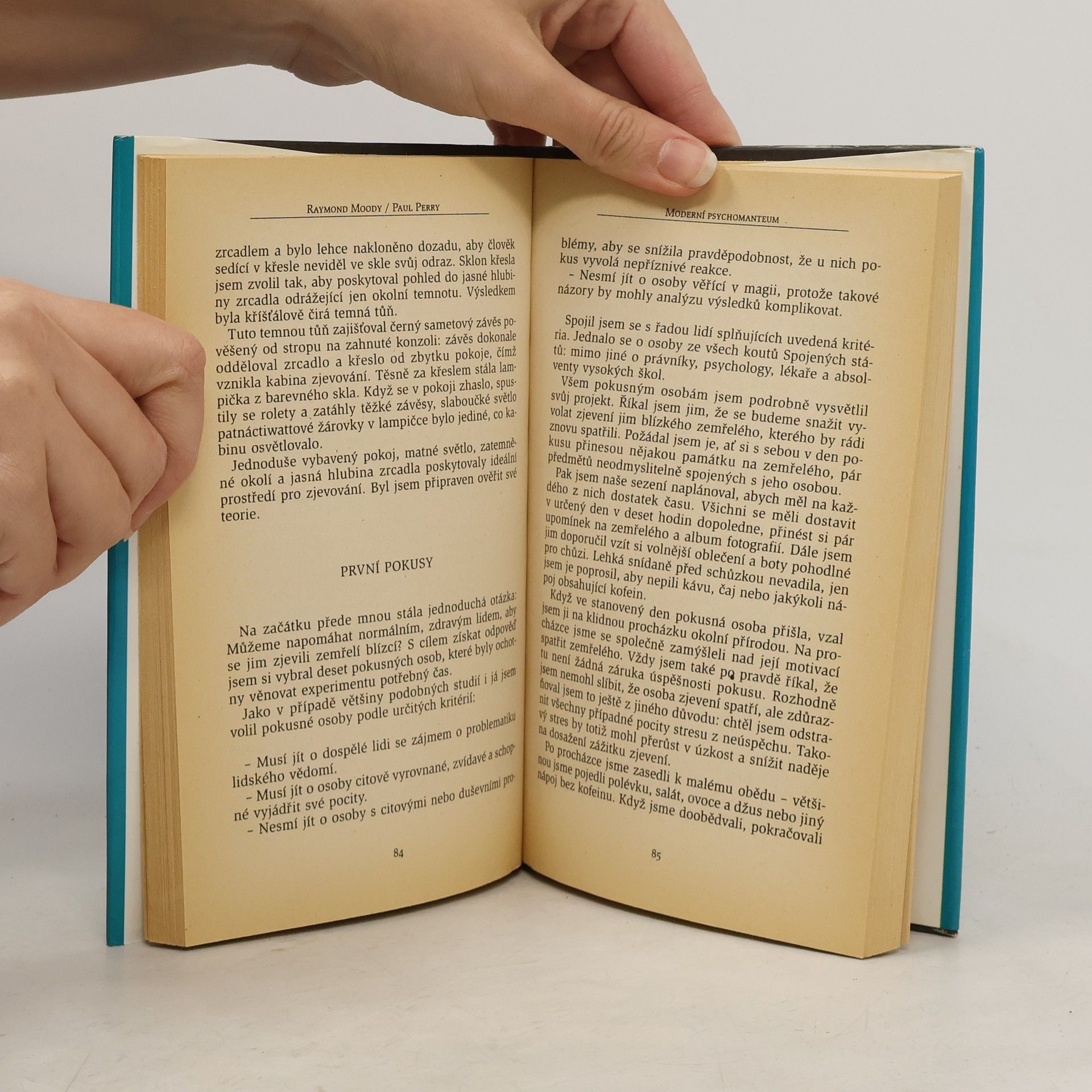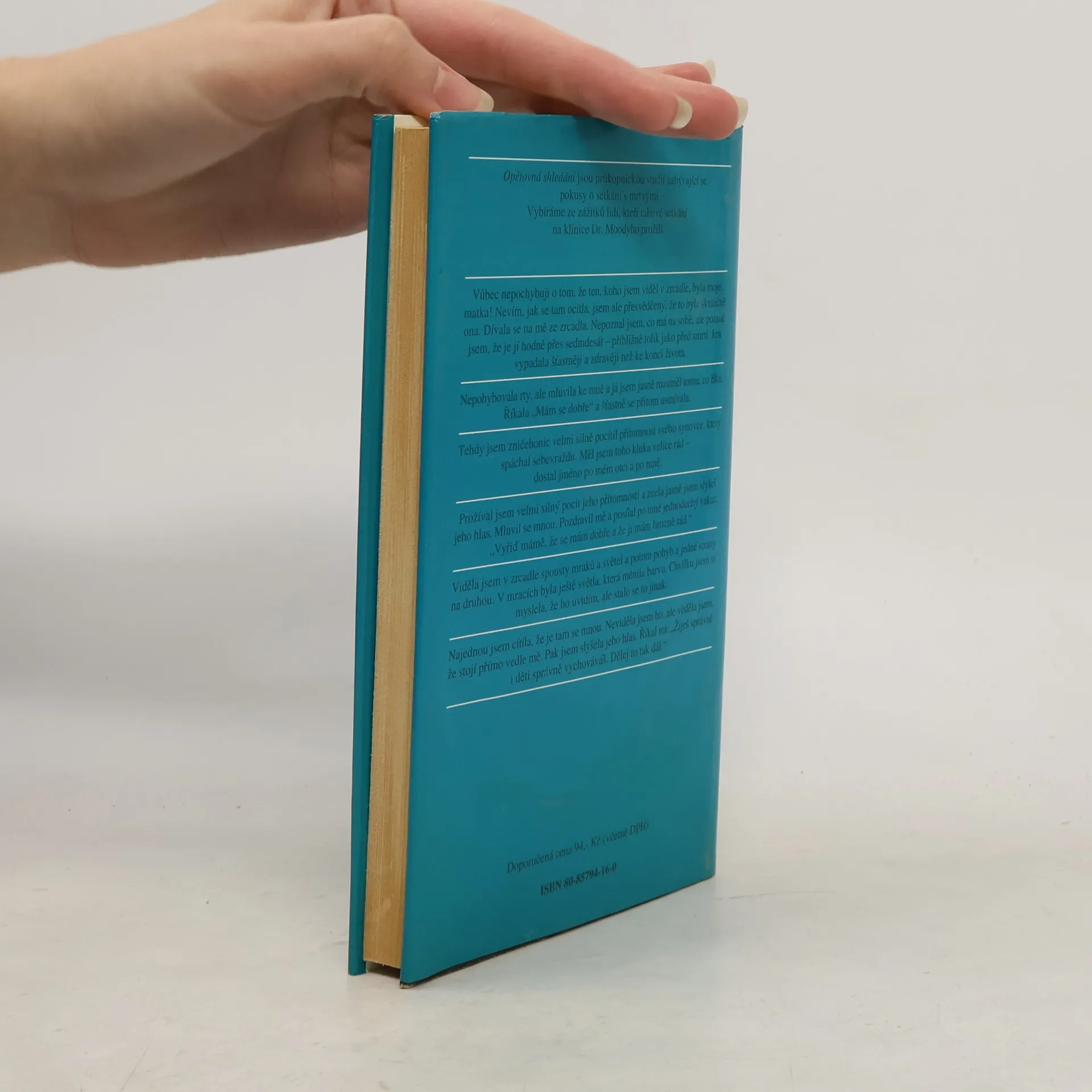 Opětovná shledání jsou průkopnickou studií zabývající se pokusy o setkání s mrtvými. Vybíráme ze zážitků lidí, kteří takové setkání na klinice Dr. Moodyho prožili. Vůbec nepochybuji o tom, že ten, koho jsem viděl v zrcadle, byla moje matka! Nevím, jak se tam ocitla, jsem ale přesvědčený, že to byla skutečně ona. Dívala se na mě ze zrcadla. Nepoznal jsem, co má na sobě, ale poznal jsem, že je jí hodně přes sedmdesát — přibližně tolik jako před smrtí. Jen vypadala šťastněji a zdravěji než ke konci života. Nepohybovala rty, ale mluvila ke mně a já jsem jasně rozuměl tomu, co říká. Říkala „Mám se dobře“ a šťastně se přitom usmívala. Tehdy jsem zničehonic velmi silně pocítil přítomnost svého synovce, který spáchal sebevraždu. Měl jsem toho kluka velice rád — dostal jméno po mém otci a po mně. Prožíval jsem velmi silný pocit jeho přítomnosti a zcela jasně jsem slyšel jeho hlas. Mluvil se mnou. Pozdravil mě a posílal po mně jednoduchý vzkaz: „Vyřiď mámě, že se mám dobře a že ji mám hrozně rád.“ Viděla jsem v zrcadle spousty mraků a světel a potom pohyb z jedné strany na druhou. V mracích byla ještě světla, která měnila barvu. Chvilku jsem si myslela, že ho uvidím, ale stalo se to jinak. Najednou jsem cítila, že je tam se mnou. Neviděla jsem ho, ale věděla jsem, že stojí přímo vedle mě. Pak jsem slyšela jeho hlas. Říkal mi: „Žiješ správně i děti správně vychováváš. Dělej to tak dál.“ Vydání první