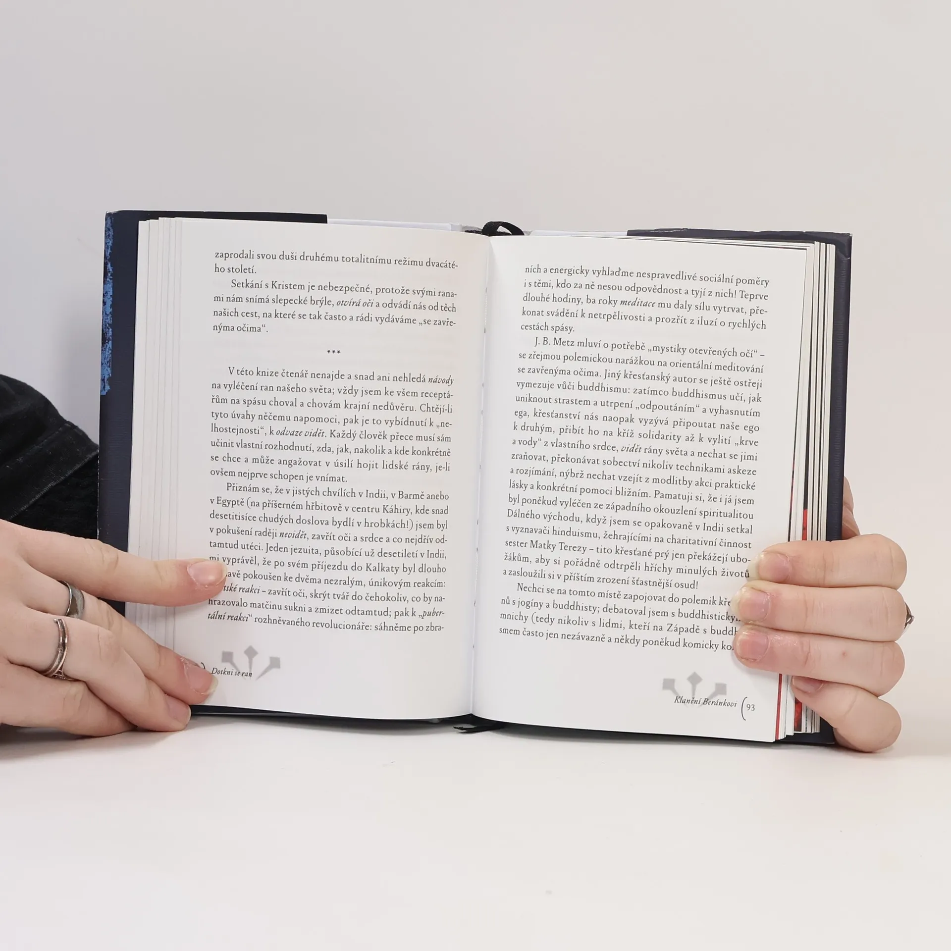 Ve čtrnácti esejích autor vychází z evangelijního příběhu o „nevěřícím Tomášovi". Představy o Bohu, církvi a víře „bez zranění" autor považuje za iluze. Ke křesťanské víře patří odvaha vidět rány našeho světa a dotýkat se jich vírou, která sama je jimi zasažena, zraněna. Tváří v tvář „zraněnému Bohu" člověk může odložit „brnění, masky a šminky", jimiž před druhými a někdy sám před sebou zakrývá svá bolestná místa. Kniha obsahuje jak teologicko-filozofické meditace, dotýkající se mystických hloubek víry, tak překvapivé, ostré i místy humorné komentáře konkrétních událostí a typických znaků naší doby. Zdrojem autorovy inspirace je křesťanská i židovská mystika, Pavlova a Lutherova teologie kříže, současná postmoderní filozofie a teologie i poklady staré lidové velikonoční zbožnosti a umění a v neposlední řadě i autorovy vlastní zkušenosti z dlouholeté terapeutické i pastorační praxe.