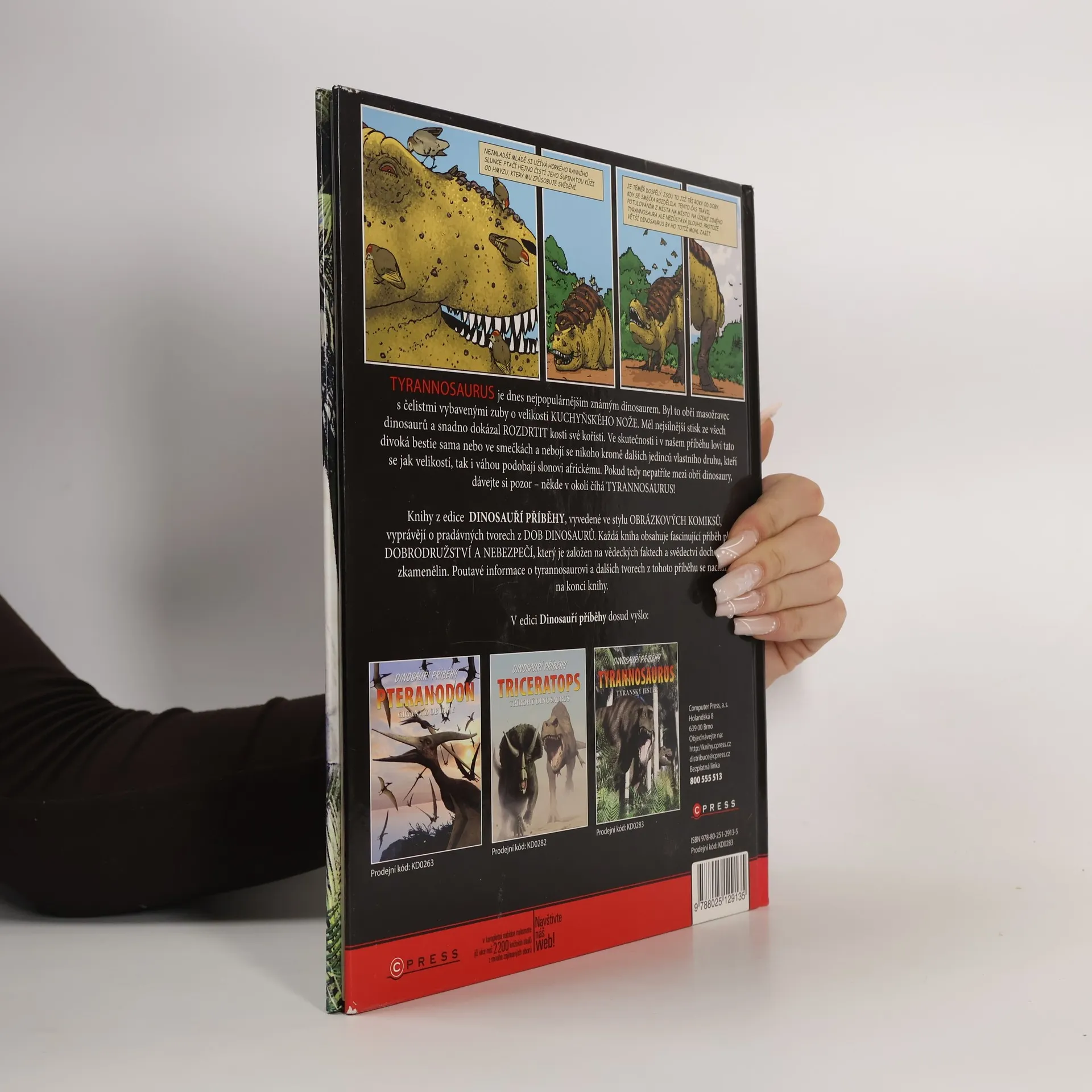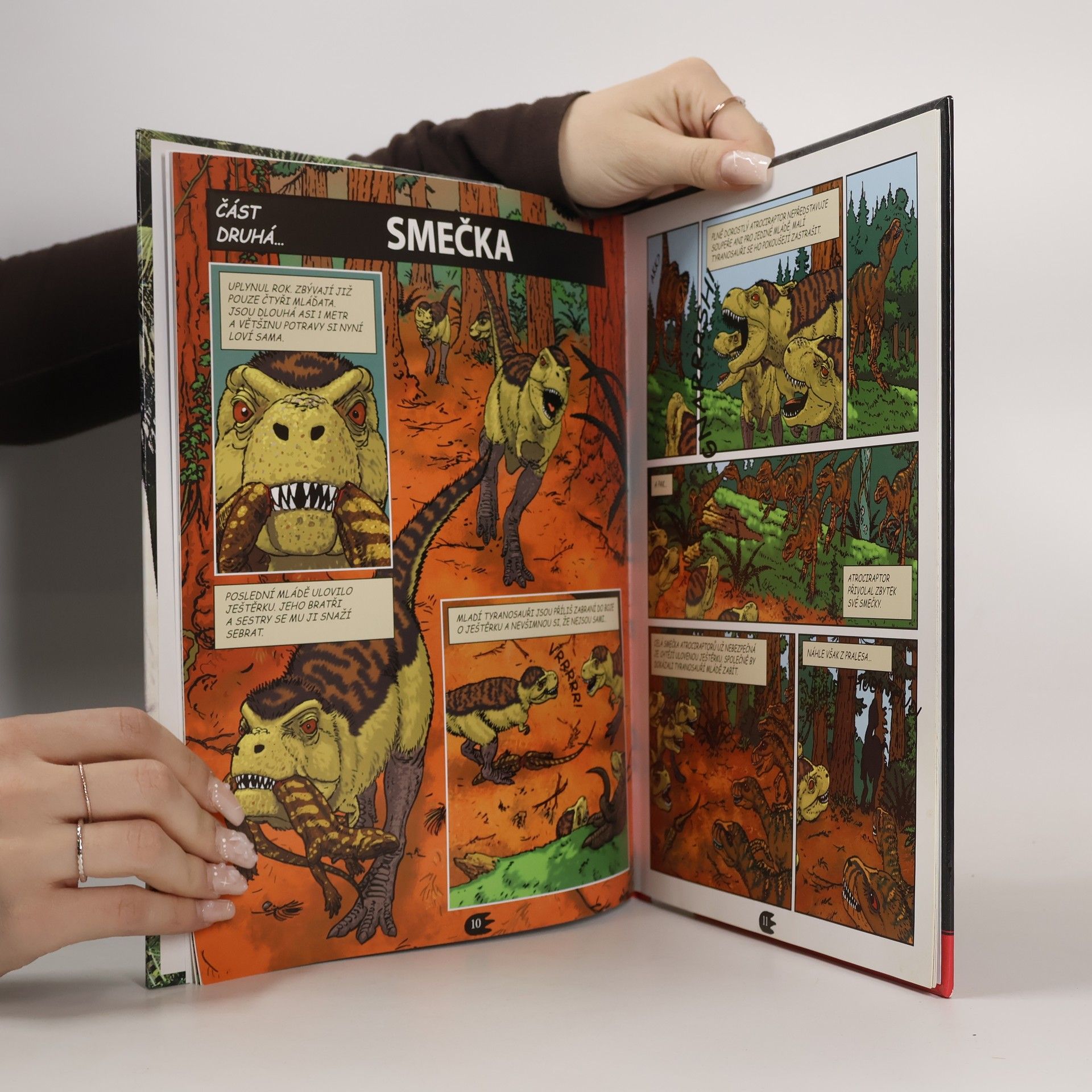 Tyrannosaurus je dnes nejpopulárnějším známým dinosaurem. Byl to obří masožravec s čelistmi vybavenými zuby o velikosti kuchyňského nože. Měl nejsilnější stisk ze všech dinosaurů a snadno dokázal rozdrtit kosti své kořisti. Ve skutečnosti i v našem příběhu loví tato divoká bestie sama nebo ve smečkách a nebojí se nikoho kromě dalších jedinců vlastního druhu, kteří se jak velikostí, tak i váhou podobají slonovi africkému. Pokud tedy nepatříte mezi obří dinosaury, dávejte si pozor - někde v okolí číhá Tyrannosaurus! Knihy z edice Dinosauří příběhy, vyvedené ve stylu obrázkových komiksů, vyprávějí o pradávných tvorech z dob dinosaurů. Každá kniha obsahuje fascinující příběh plný dobrodružství a nebezpečí, který je založen na vědeckých faktech a svědectví dochovaných zkamenělin. Poutavé informace o tyrannosaurovi a dalších tvorech z tohoto příběhu se nachází na konci knihy.