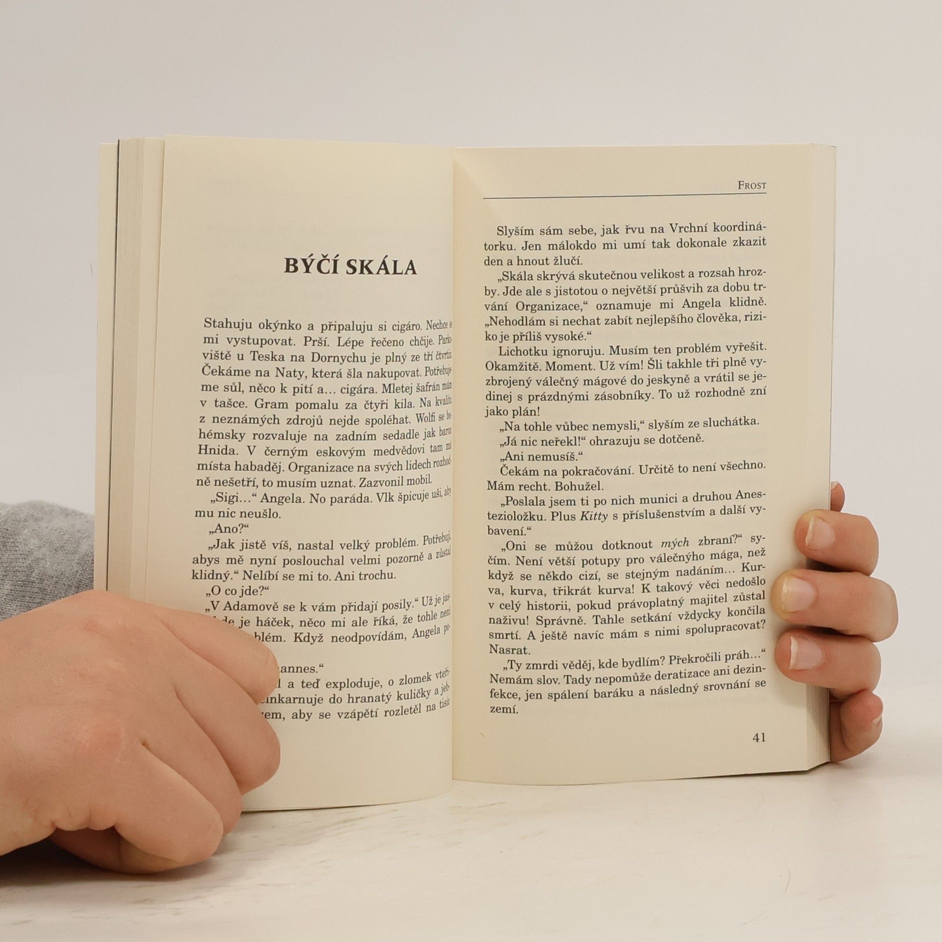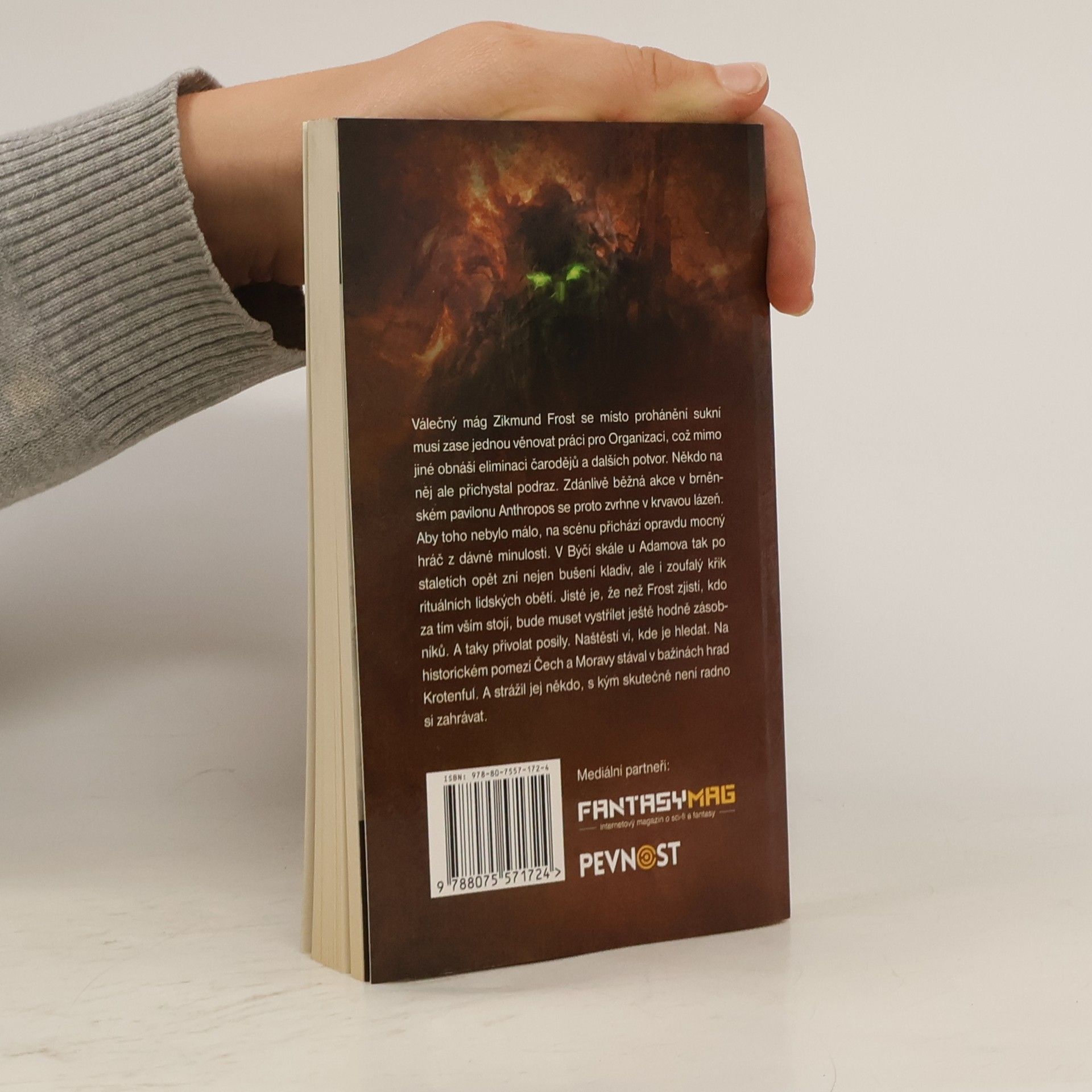 Válečný mág Zikmund Frost se místo prohánění sukní musí zase jednou věnovat práci pro Organizaci, což mimo jiné obnáší eliminaci čarodějů a dalších potvor. Někdo na něj ale přichystal podraz. Zdánlivě běžná akce v brněnském pavilonu Anthropos se proto zvrhne v krvavou lázeň. Aby toho nebylo málo, na scénu přichází opravdu mocný hráč z dávné minulosti. V Býčí skále u Adamova tak po staletích opět zní nejen bušení kladiv, ale i zoufalý křik rituálních lidských obětí. Jisté je, že než Frost zjistí, kdo za tím vším stojí, bude muset vystřílet ještě hodně zásobníků. A taky přivolat posily. Naštěstí ví, kde je hledat. Na historickém pomezí Čech a Moravy stával v bažinách hrad Krotenful. A strážil jej někdo, s kým skutečně není radno si zahrávat. 2. Vydání