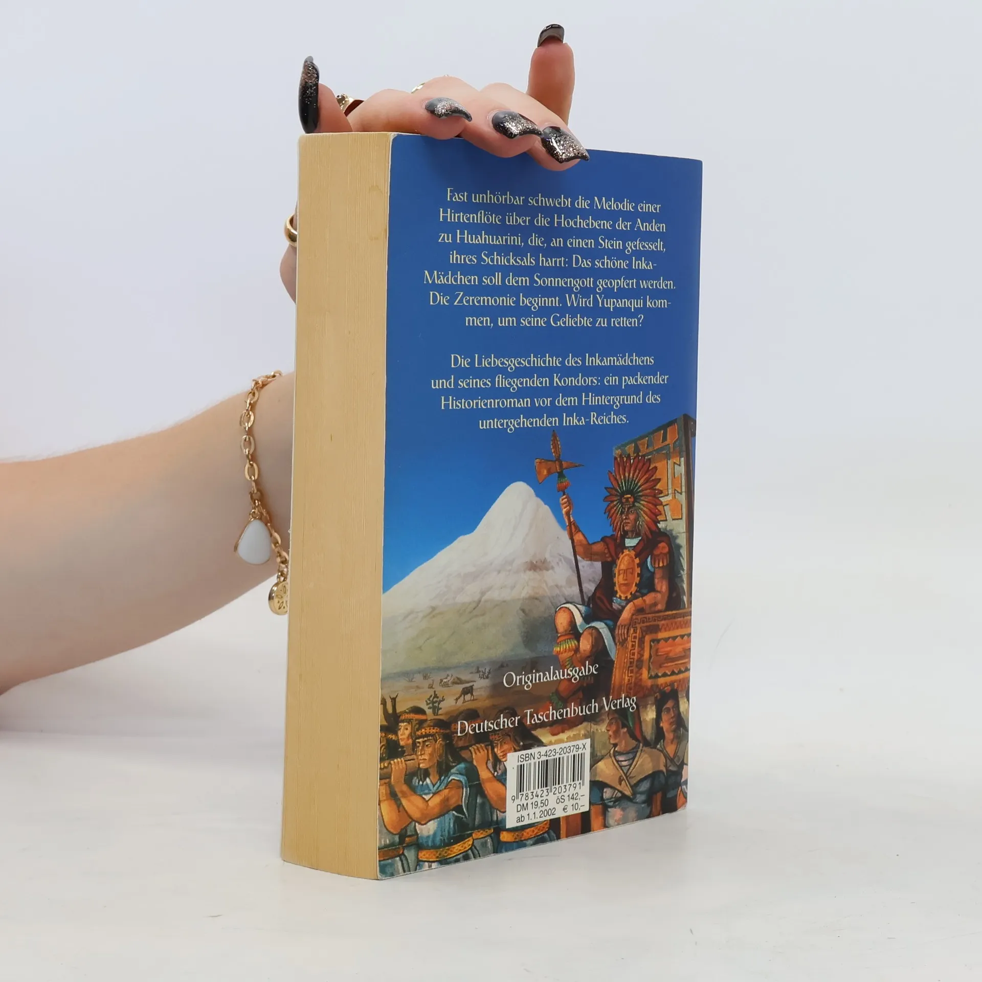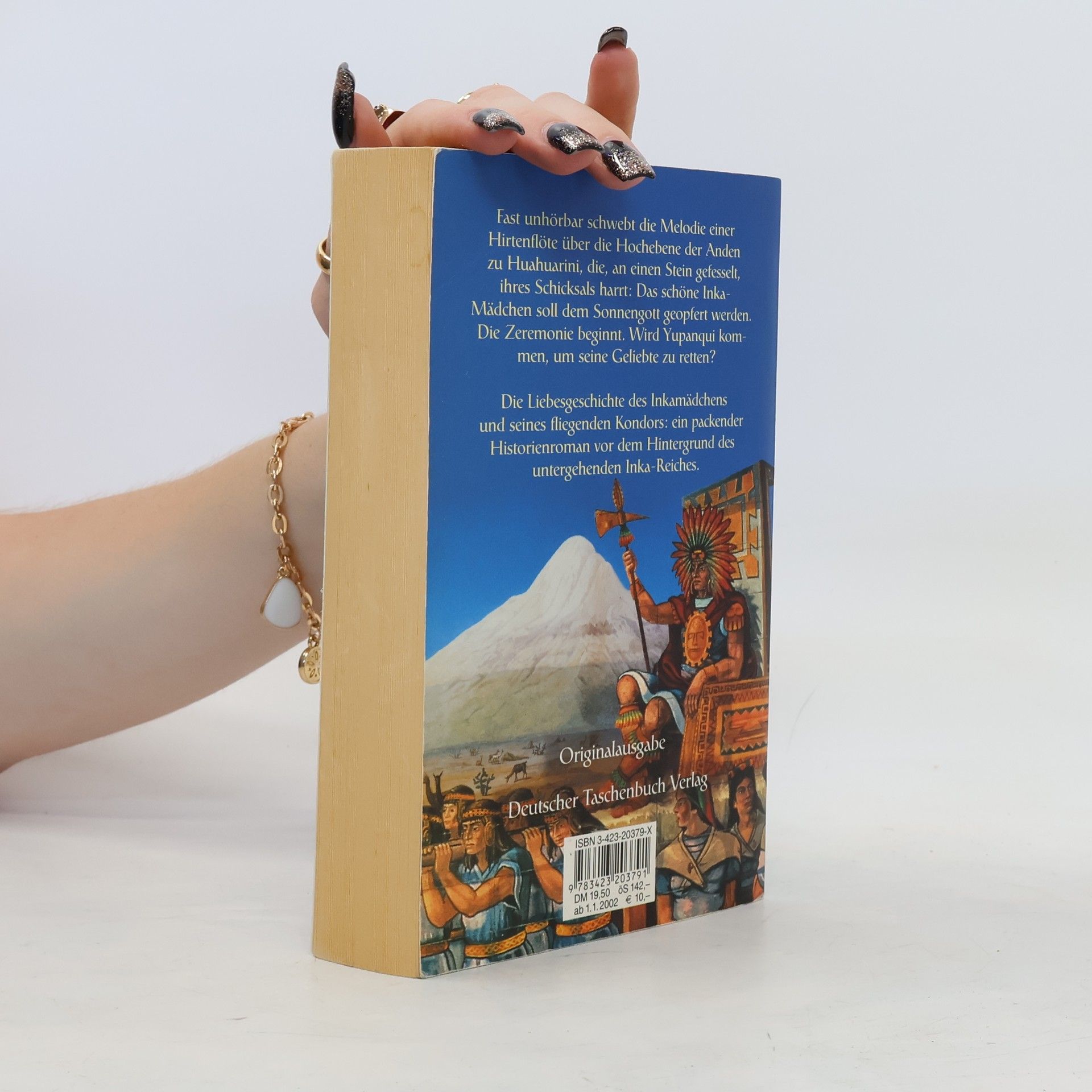 Wie aus weiter Ferne, fast unhörbar schwingt die Melodie einer kleinen Hirtenflöte durch die Hochebene der Anden zu Huahuarini, die, an einen Stein gefesselt, ihres Schicksals harrt: das schöne Inkamädchen soll dem Sonnengott als Opfergabe dargebracht werden; die Hohenpriester treffen die letzten Vorbereitungen. Huahuarinis Gedanken schweifen zurück in ihre Kindheit, als sie Alpakas hütete, ihrer Familie beim Kartoffel- und Maisanbau half und in die Stammesriten eingeführt wurde. Damals hatte Huahuarini zum ersten Mal andächtig dem Lied vom fliegenden Kondor gelauscht. Yupanqui, der Nachbarsjunge, hatte es ihr auf seiner Hirtenflöte vorgespielt und ihr junges Herz damit im Sturm erobert. Doch die Wege der beiden trennen sich schon bald, denn man schickt sie in die Hauptstadt des Inka-Reiches Cuzco. Im Haus der auserwählten Frauen wird sie auf ihre zukünftige Rolle als Dienerin der Inka-Aristokratie vorbereitet. Dort wird auch Huáscar, Herrscher über das südliche Inka-Imperium, auf sie aufmerksam und holt sie zu sich in seinen Palast. Als er aber in den Norden reist, setzt seine eifersüchtige Hauptfrau einen mörderischen Plan in die Tat um: Huahuarini soll den Göttern geopfert werden. Die Zeremonie beginnt. Wird Yupanqui kommen, um seine Geliebte zu retten? Das Inkamädchen und sein fliegender Kondor: ein atmosphärischer und kenntnisreicher historischer Roman vor dem Hintergrund des un-tergehenden Inka-Reiches.