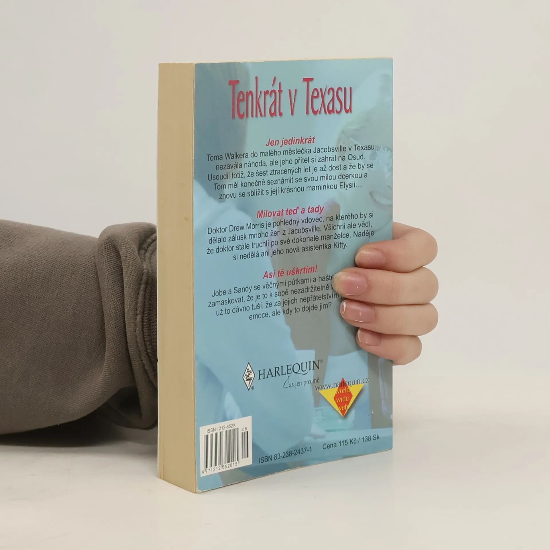 Kniha obsahuje tři romantické příběhy od oblíbené autorky. Jen jedinkrát - Toma Walkera do malého městečka Jacobsville v Texasu nezavála náhoda, ale jeho přítel si zahrál na Osud. Usoudil totiž, že šest ztracených let je až dost a že by se Tom měl konečně seznámit se svou milou dcerkou a znovu se sblížit s její krásnou maminkou Elysií… Milovat teď a tady - Doktor Drew Morris je pohledný vdovec, na kterého by si dělalo zálusk spousta žen z Jacobsville. Všichni ale vědí, že doktor stále truchlí po své dokonalé manželce. Naděje si nedělá ani jeho nová asistentka Kitty. Asi tě uškrtím! - Jobe a Sandy se věčnými půtkami a hašteřením snaží zamaskovat, že je to k sobě nezadržitelně táhne. Všichni už to dávno tuší, že za jejich nepřátelstvím jsou jiné emoce, ale kdy to dojde jim?