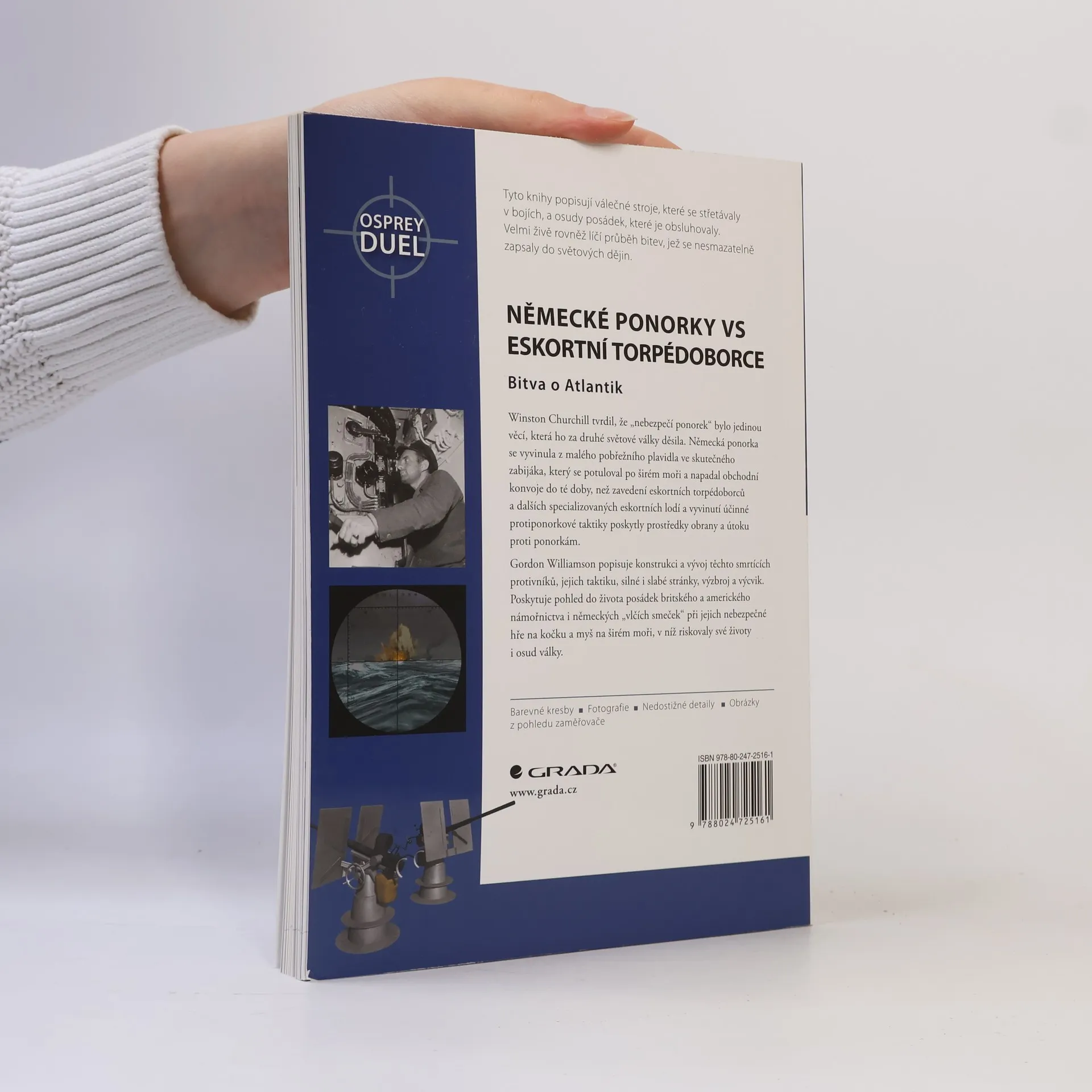 Historie fascinujícího souboje lodí, které měly sloužit jako ochrana konvojů, zásobujících Velkou Británii během druhé světové války, a německých ponorek, které se postupně z malých plavidel vyvinuly ve skutečné zabijáky. Jak pravil Churchill, nepřátelské ponorky byly jedinou věcí, které ho děsily. Autor se v knize zaměřil jak na technickou stránku strojů, výzbroj a výstroj, tak také na nesmírně obtížný život posádek, jejichž ztráty byly na obou stranách děsivé. Napínavé líčení vzájemného střetávání doprovázejí unikátní dobové fotografie a statistické analýzy. Z anglického vydání „Duel 3: U-boats vs Destroyer Escorts. The Batle of the Atlantic“ v Osprey Publishing Ltd. Midland House, West Way, Botley, Oxford 2007 přeložil PhDr. Jaroslav Hrbek. První vydání.