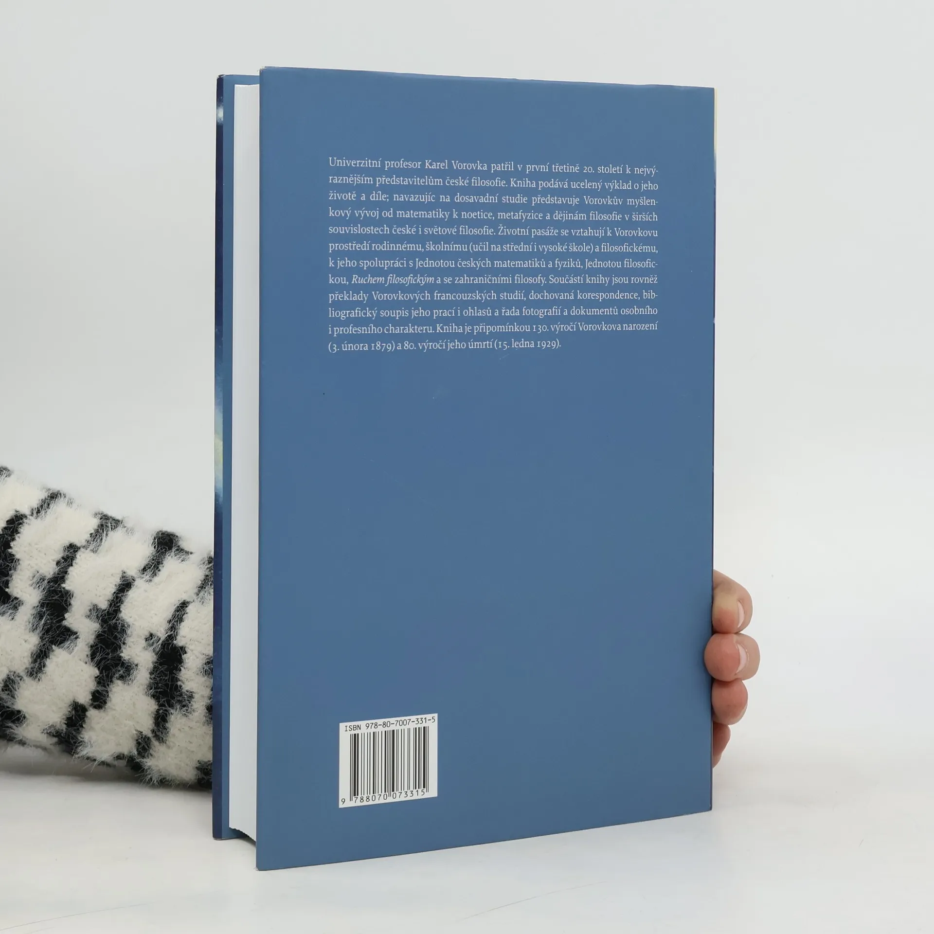Univerzitní profesor Karel Vorovka patřil v první třetině 20. století k nejvýraznějším představitelům české filosofie. Kniha podává ucelený výklad o jeho životě a díle; navazujíc na dosavadní studie představuje Vorovkův myšlenkový vývoj od matematiky k noetice, metafyzice a dějinám filosofie v širších souvislostech české i světové filosofie. Životní pasáže se vztahují k Vorovkovu prostředí rodinnému, školnímu (učil na střední i vysoké škole) a filosofickému, k jeho spolupráci s Jednotou českých matematiků a fyziků, Jednotou filosofickou, Ruchem filosofickým a se zahraničními filosofy. Součástí knihy jsou rovněž překlady Vorovkových francouzských studií, dochovaná korespondence, bibliografický soupis jeho prací i ohlasů a řada fotografií a dokumentů osobního i profesního charakteru. Kniha je připomínkou 130. výročí Vorovkova narození (3. února 1879) a 80. výročí jeho úmrtí (15. ledna 1929).