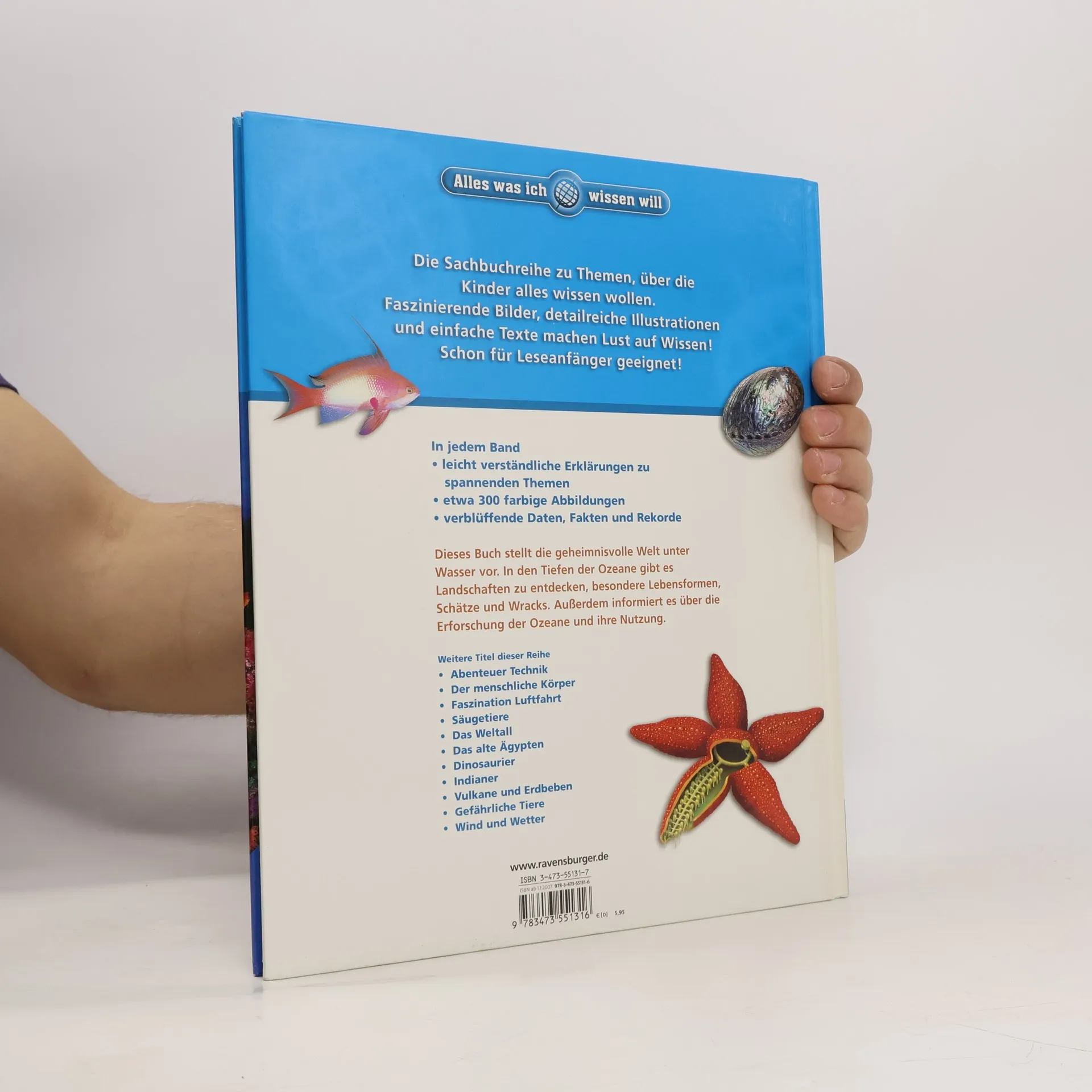 Dieses Buch führt in die geheimnisvolle Welt unter Wasser. Es lässt in den Tiefen der Ozeane Landschaften entdecken, besondere Lebensformen, Schätze und Wracks. Außerdem: die Erforschung der Ozeane und ihre Nutzung.