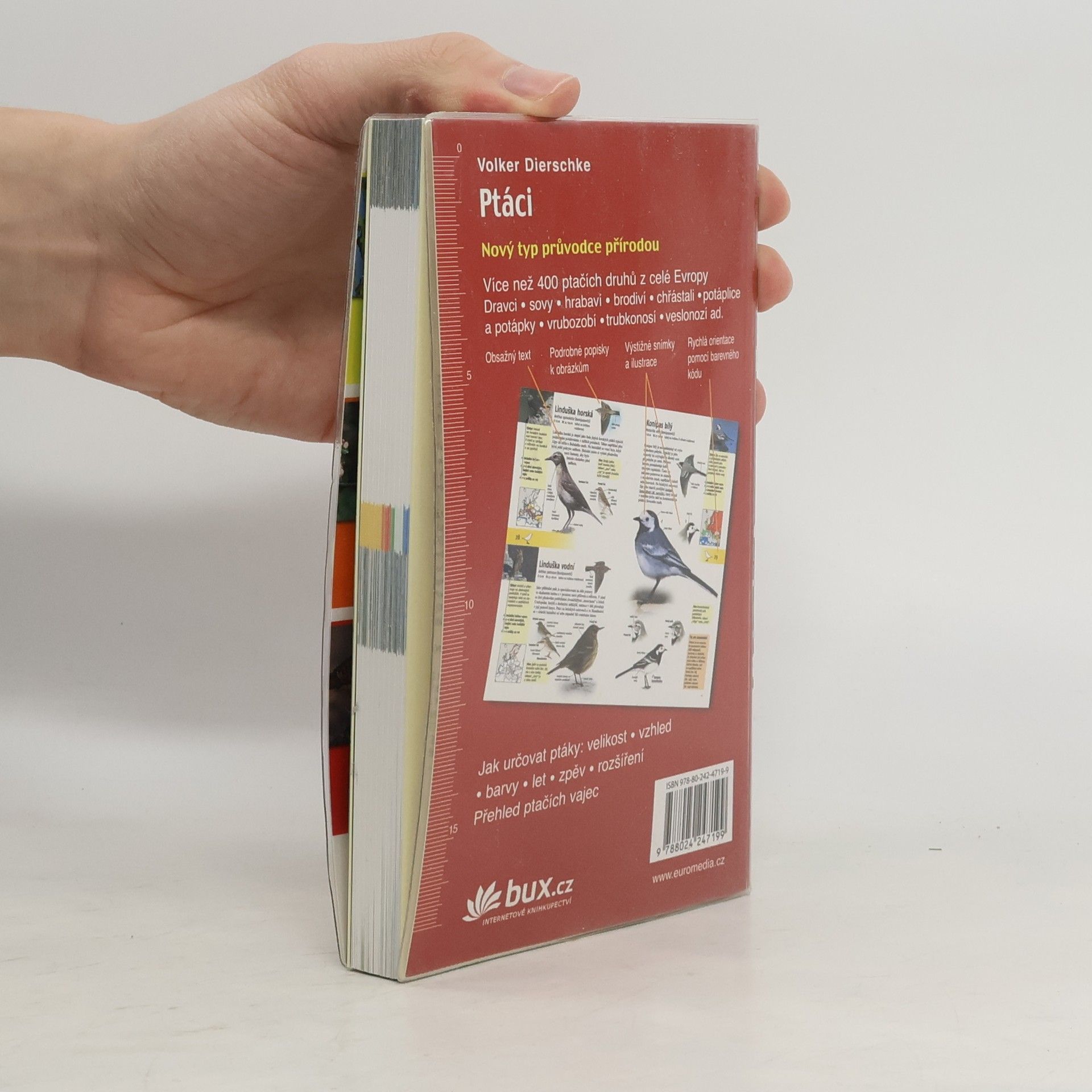Kniha představuje více než 440 ptačích druhů z celé Evropy. Podrobný text, který uvádí základní charakteristické znaky (vzhled, velikost, barvy ptáků, let, zpěv, rozšíření ad.), doplňují výstižné barevné snímky a ilustrace. V postranních rámečcích se dozvíte řadu zajímavostí. Nechybí ani přehled nejdůležitějších ptačích vajec.