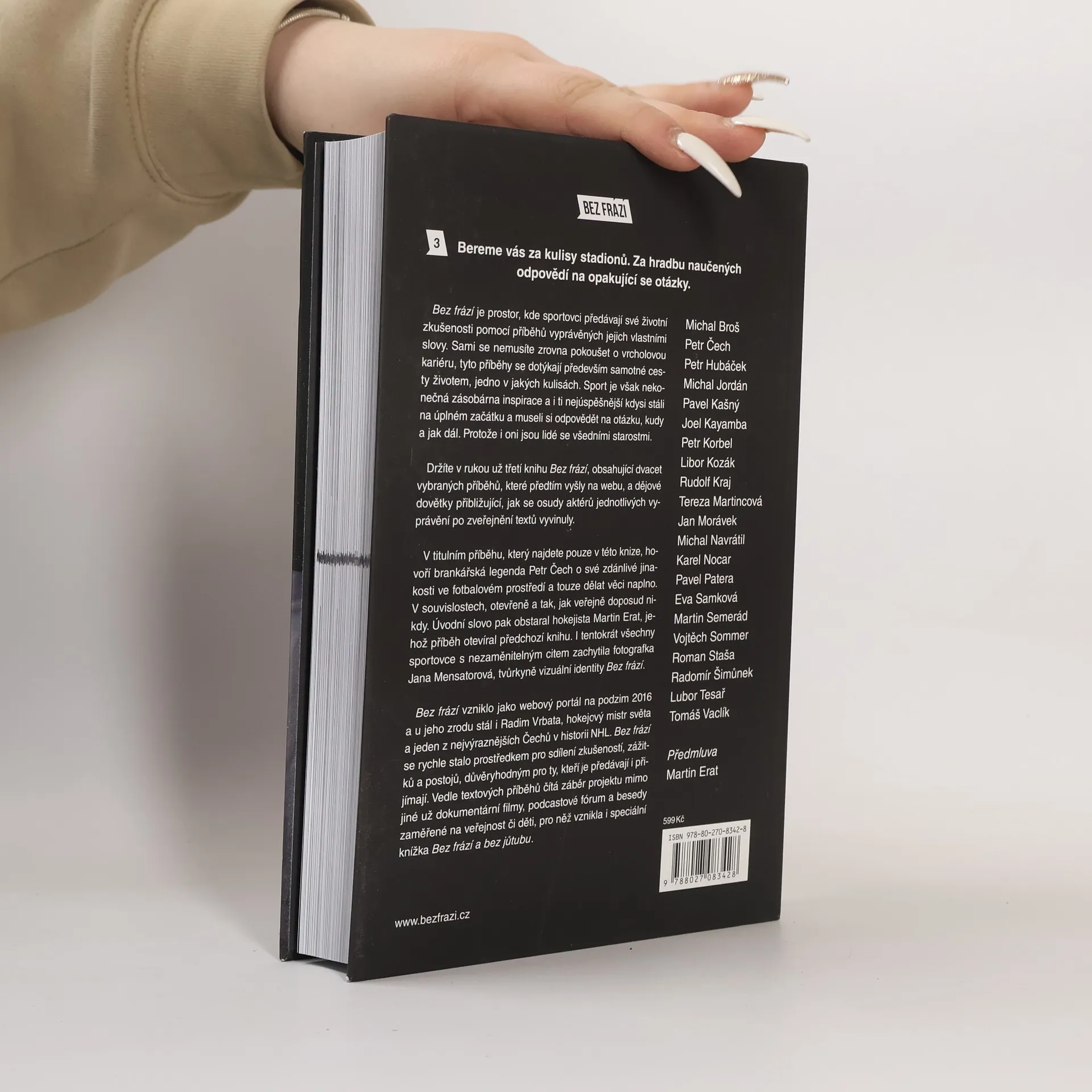 Další porce inspirace od sportovních osobností. Třetí kniha Bez frází přináší jako exkluzivní titulní příběh vyprávění fotbalové legendy Petra Čecha. Někdejší nejlepší brankář světa nechává nahlédnout do svého maximalistického uvažování, přibližuje svůj přístup k řešení zadaných úkolů a vysvětluje, proč nemá rád přezdívku Mr. Perfect i proč mu nevadí být jiný než ostatní. Bez frází je prostor, kde sportovci předávají své životní zkušenosti pomocí příběhů vyprávěných jejich vlastními slovy. Sami se nemusíte zrovna pokoušet o vrcholovou kariéru, tyto příběhy se především dotýkají samotné cesty životem, jedno v jakých kulisách. Sport je ovšem nekonečná zásobárna inspirace a i ti nejúspěšnější kdysi stáli na úplném začátku a museli si odpovědět, jak dál. A protože i oni jsou lidé se všedními starostmi. V knize si přečtete i příběhy (a jejich dovětky mapující, co se s jednotlivými osobnostmi dělo od vydání příběhu na webu Bez frází) těchto sportovců: Michal Broš, Petr Hubáček, Michal Jordán, Pavel Kašný, Joel Kayamba, Petr Korbel, Libor Kozák, Rudolf Kraj, Tereza Martincová, Jan Morávek, Michal Navrátil, Karel Nocar, Pavel Patera, Eva Samková, Martin Semerád, Vojtěch Sommer, Roman Staša, Radomír Šimůnek, Lubor Tesař, Tomáš Vaclík. I tentokrát všechny s nezaměnitelným citem zachytila fotografka Jana Mensatorová, tvůrkyně vizuální identity Bez frází.