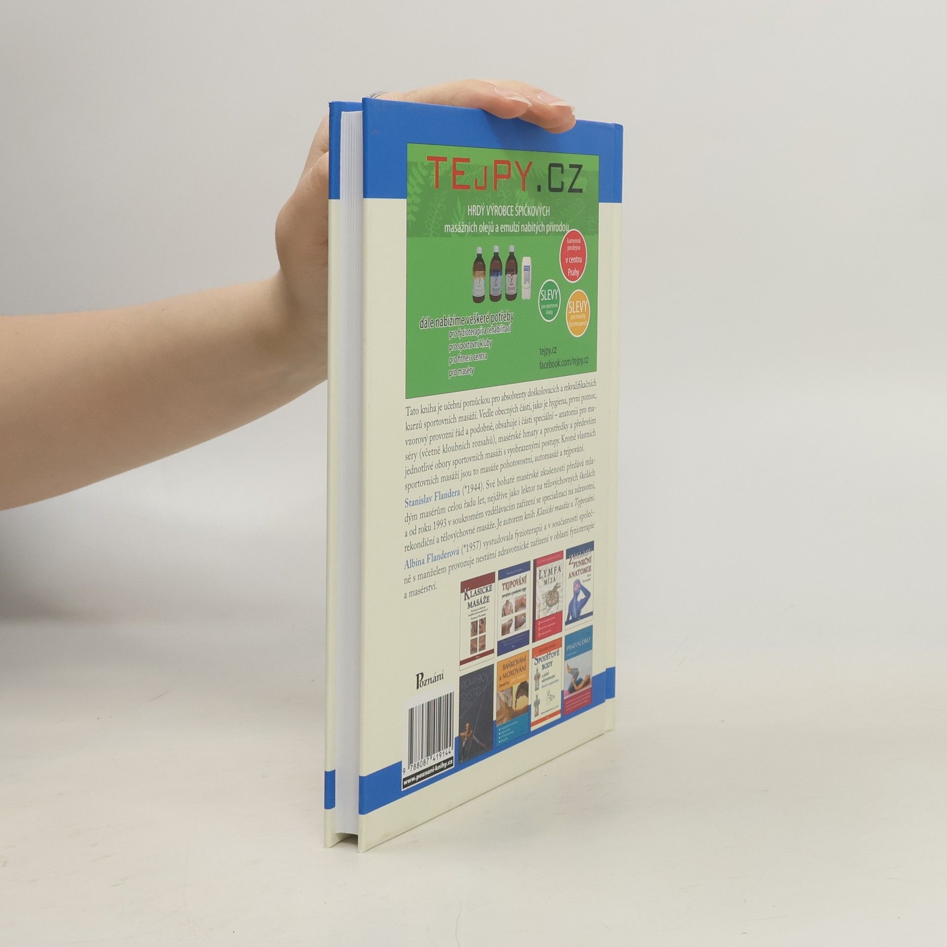 Učební pomůcka pro absolventy doškolovacích a rekvalifikačních kurzů sportovních masáží. Vedle obecných částí, jako je hygiena, první pomoc a vzorový provozní řád, obsahuje i části speciální - anatomii pro maséry (včetně kloubních rozsahů), masérské hmaty a prostředky a především jednotlivé obory sportovních masáží a vyobrazenými postupy. Kromě vlastních sportovních masáží jsou to masáže pohotovostní, automasáž a tejpování.