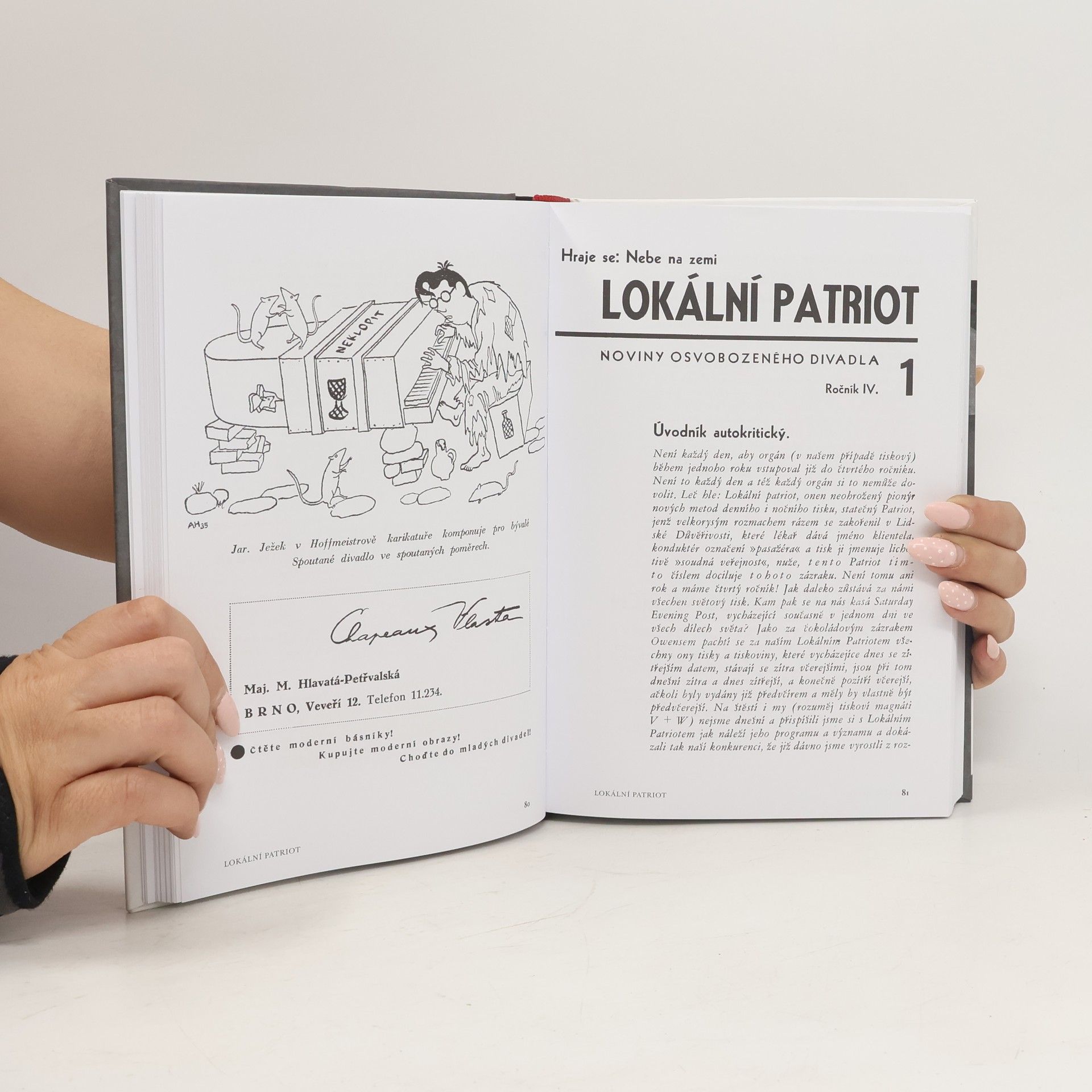Bonbonek pro všechny milovníky J. Voskovce a J. Wericha, přinášející dosud knižně nepublikované materiály. Kniha mapující duchovní ovzduší, panující v a kolem Osvobozeného divadla, představuje její tvůrce, spolupracovníky a vše, co dotvářelo kolorit této jedinečné scény. Doplňuje ji ojedinělá antologie časopisů Osvobozeného divadla, vydávaných pod názvy /Vest Pocket Revue/ a /Lokální patriot /(antologie je pořízena formou reprintu vč. dobových inzerátů). Zatímco první z nich usiloval o začlenění do širokého proudu evropské avantgardy (svědčí o tom např. příspěvky P. Soupaulta, A. Jarryho, P. Picassa, J. Cocteaua, B. Cendrarse, T. Tzary či G. Ribemont-Dessaignese, ale i J. Šímy, K. Teiga, Vl. Vančury, E. F. Buriana, K. Biebla, J. Honzla, J. Ježka i samotných "tiskových magnátů" J. Voskovce a J. Wericha objevují se zde např. jejich "paměti" z druhé poloviny 30. let), dává druhý titul nahlédnout především do zákulisí a "kuchyně" této scény. Text doplňuje téměř 250 fotografií a karikatur.