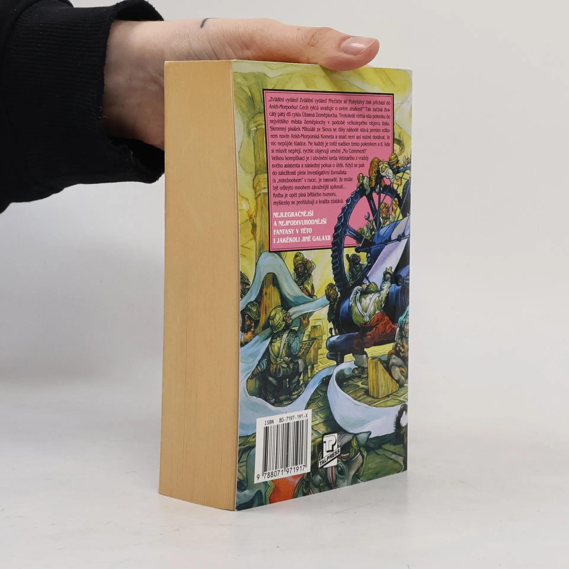„Zvláštní vydání! Zvláštní vydání! Přečtěte si! Pohyblivý tisk přichází do Ankh-Morporku! Cech rytců uvažuje o svém zrušení!“ Tak začíná dvacátý pátý díl cyklu Úžasná Zeměplocha. Tentokrát vtrhla síla pokroku do největšího města Zeměplochy v podobě velkolepého objevu tisku. Skromný pisálek Mikuláš ze Slova se díky náhodě stává prvním editorem novin Ankh-Morporská kometa a snad není ani nutné dodávat, že nic nepůjde hladce. Ne každý je totiž nadšen tímto pokrokem a ti, kdo se mluvit nepřejí, rychle objevují umění „No Comment!“ Velkou komplikací je i obvinění lorda Vetinariho z vraždy svého asistenta a následný pokus o útěk. Když se pak do záležitostí plete investigativní žurnalista (s „notebookem“ v ruce), je nasnadě, že může být odkryto mnohem závažnější spiknutí... Kniha je opět plná břitkého humoru, myšlenky se prohlubují a kvalita zůstává. Úžasná Zeměplocha, kniha 25., přeložil Jan Kantůrek.