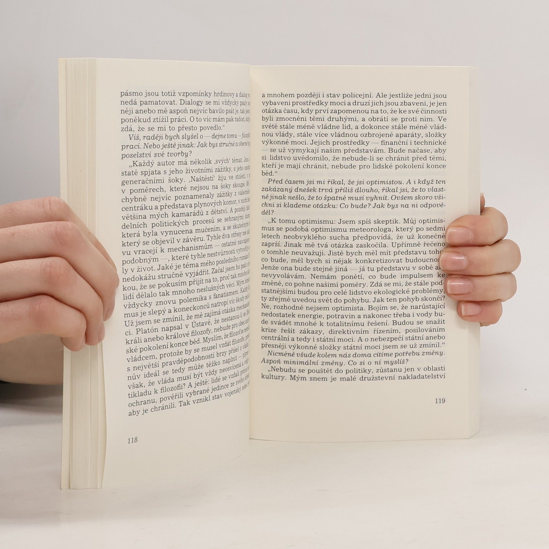 Rozhovory autora s lidmi v české opozici (Vaculík, Havel, Kohout, Hanzelka, Zikmund, Klíma, Landovský, Kolář, Gruša atd.).