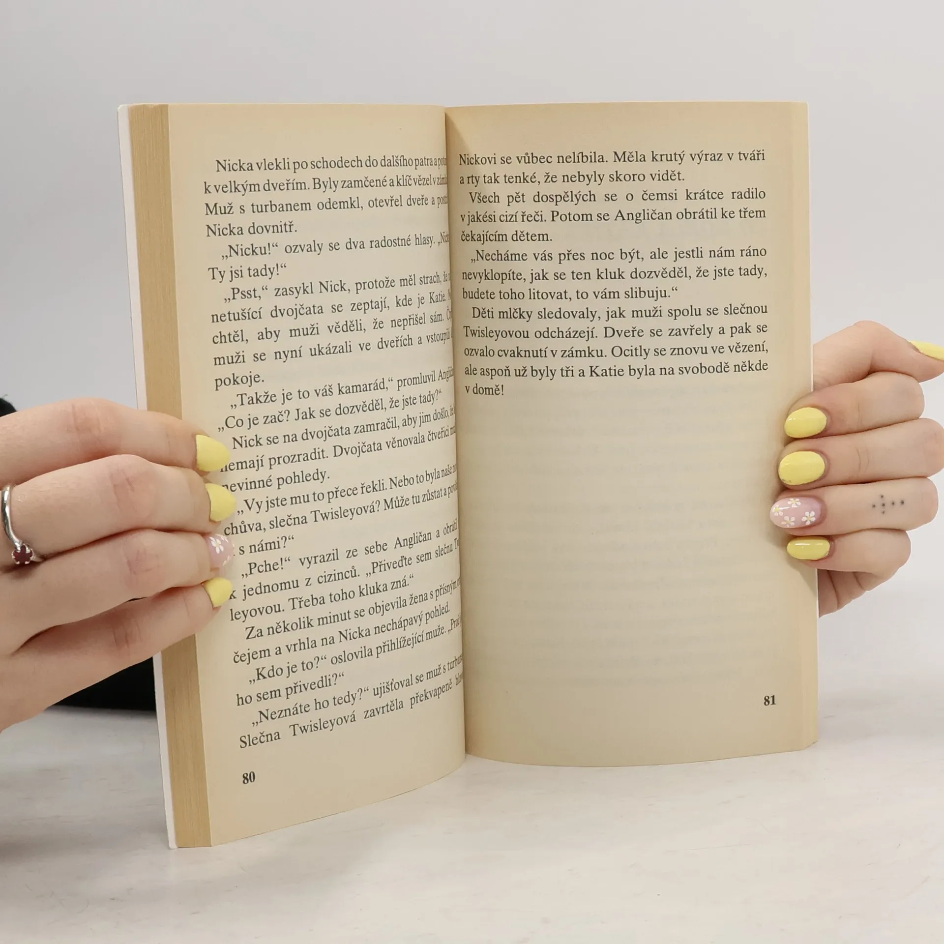 Nick po špičkách obešel dveře do obrovské kuchyně. Žena stále spala s polootevřenými ústy. Katie se plížila Nickovi v patách. Potom se stala hrozná věc. Nick si nevšiml kočky pod ženiným křeslem, ale zvíře ho dobře vidělo. Rozběhlo se se k němu, jako by si chtělo hrát, a Nick zakopl a vrazil přitom do křesla. Žena se strhnutím probudila a vyskočila. Vylekaná Katie stačila ještě v poslední chvíli uklouznout za těžké modré závěsy. Nick se zvedl a rozběhl se k zadnímu schodišti.