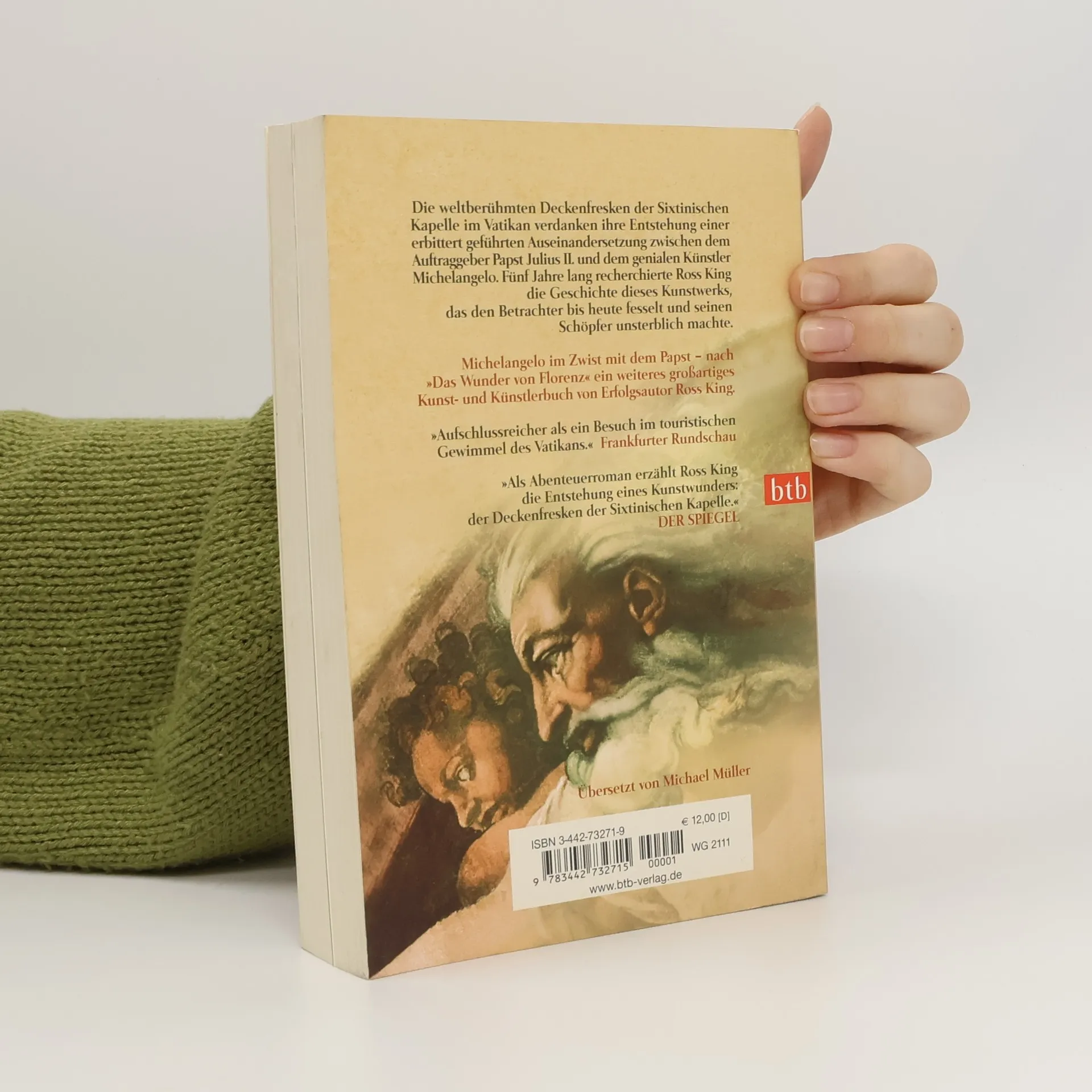 Die weltberühmten Deckenfresken der Sixtinischen Kapelle im Vatikan verdanken ihre Entstehung einer erbittert geführten Auseinandersetzung zwischen dem Auftraggeber Papst Julius II. und dem genialen Künstler Michelangelo. Fünf Jahre lang recherchierte Ross King die Geschichte dieses Kunstwerks, das den Betrachter bis heute fesselt und seinen Schöpfer unsterblich machte. King schildert die Ängste und Zweifel des Künstlers, die Missgunst seiner Zeitgenossen wie Bramante und Raphael. Als roter Faden erweist sich jedoch das konfliktgeladene Verhältnis zweier Männer, die – jeder an seinem Platz – ein beispielloses Werk her vorbrachten.