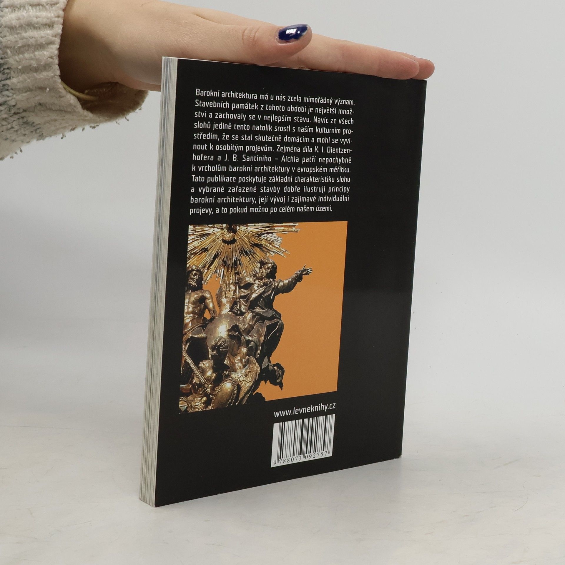 Barokní architektura má u nás zcela mimořádný význam. Stavebních památek z tohoto období je největší množství a zachovaly se v nejlepším stavu. Navíc ze všech slohů jedině tento natolik srostl s naším kulturním prostředím, že se stal skutečně domácím a mohl se vyvinout k osobitým projevům. Tato publikace poskytuje základní charakteristiku slohu a vybrané zařazené stavby dobře ilustrují principy barokní architektury, její vývoj i zajímavé individuální projevy, a to pokud možno po celém našem území.