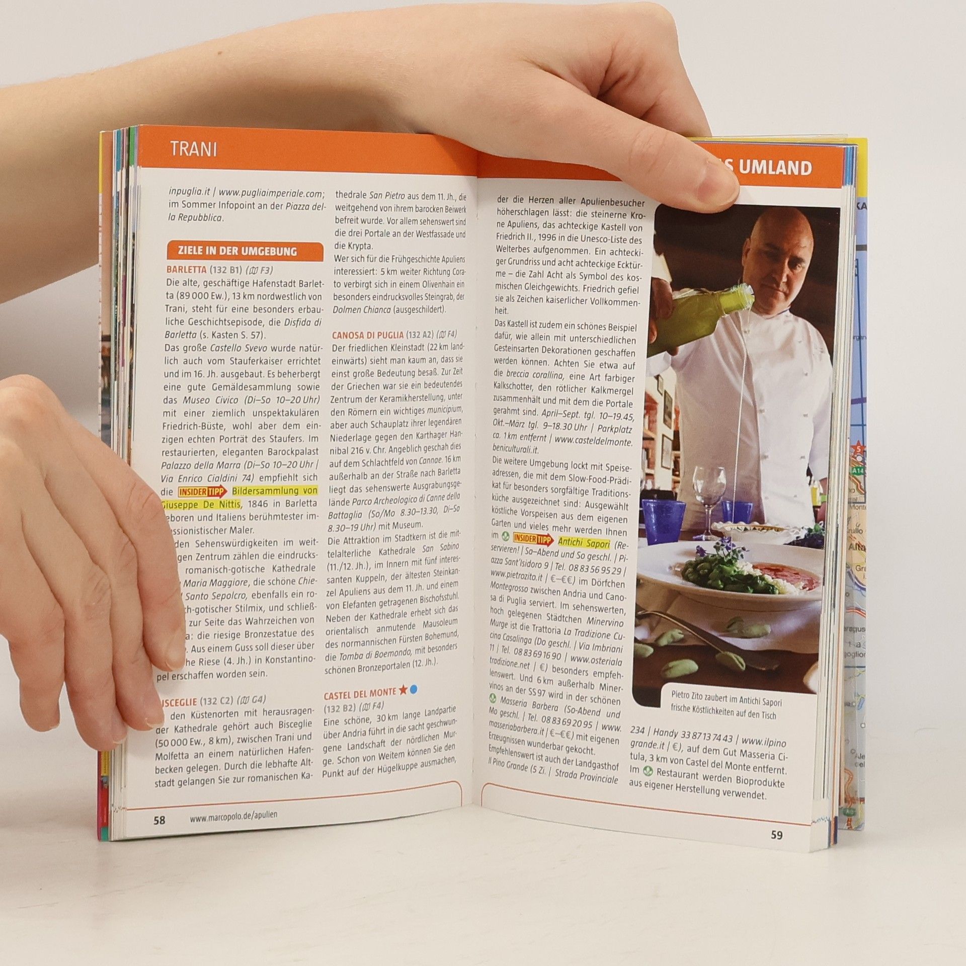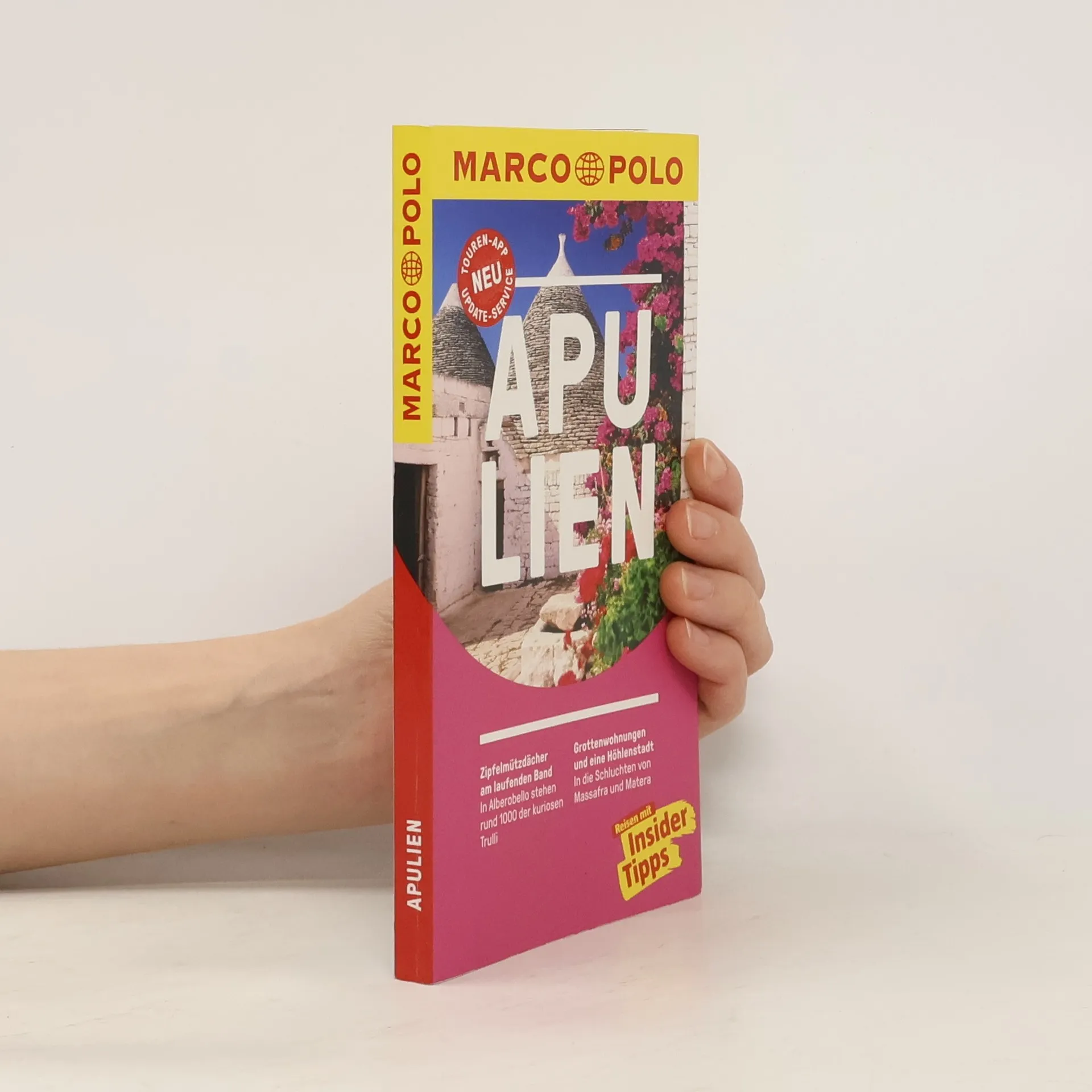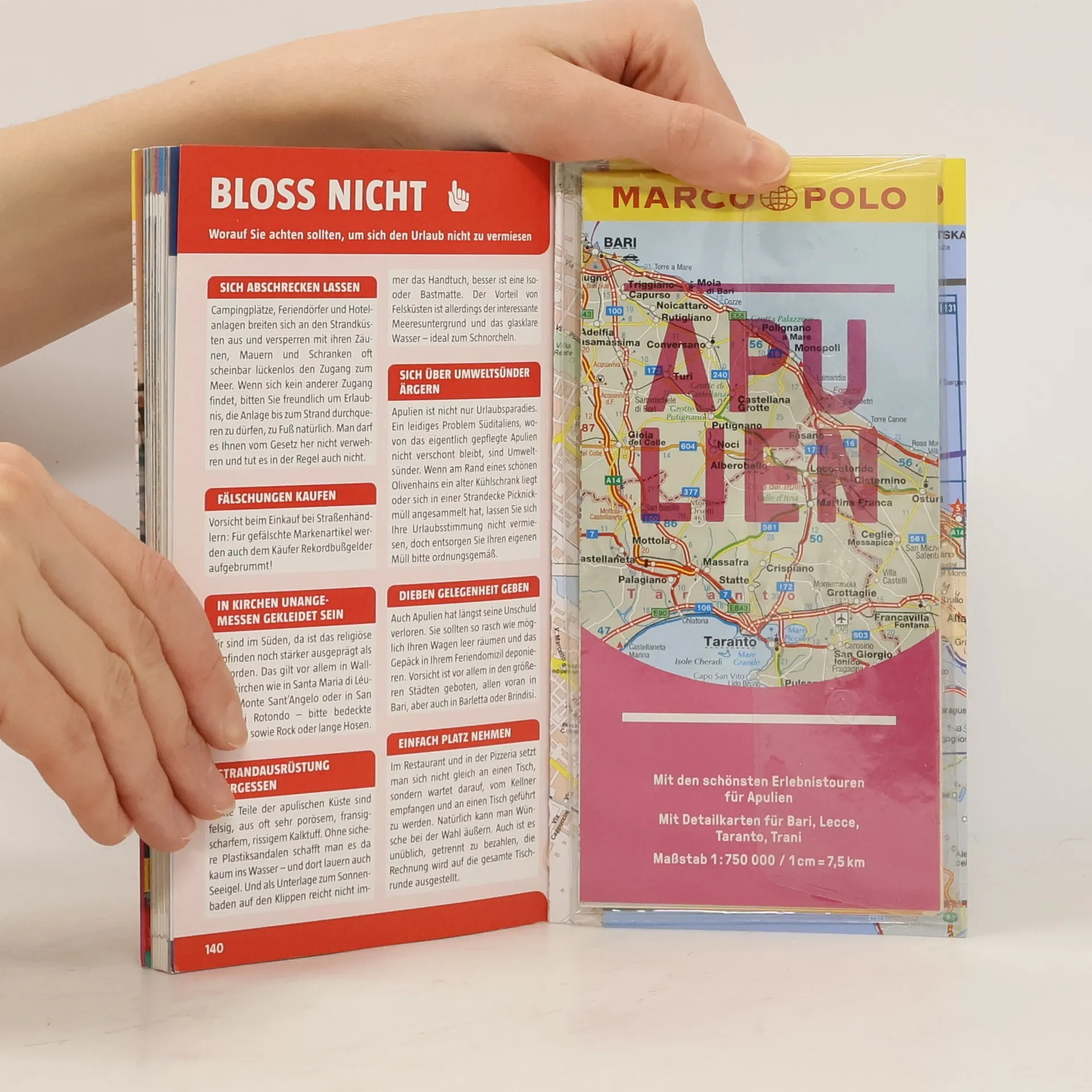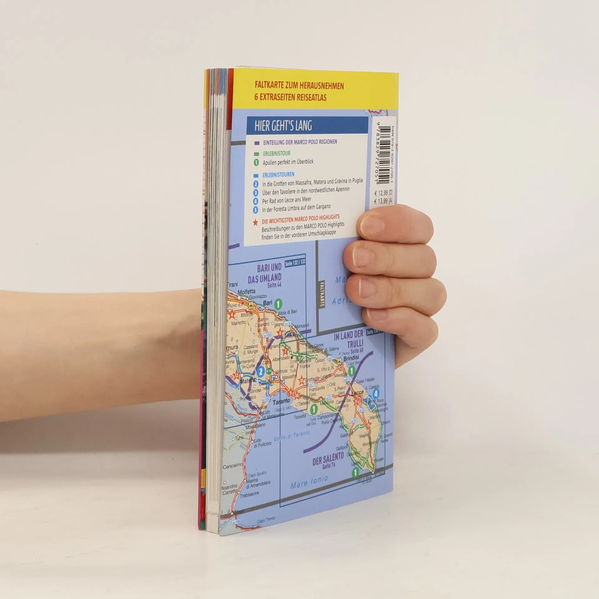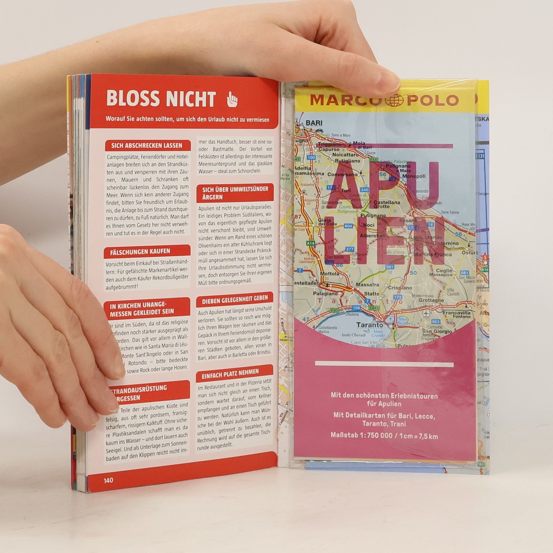 Apulien eine Welt der Kontraste, über der sechs Monate im Jahr die heiße, mediterrane Sonne scheint, während sich im karstigen Erdinnern eine geheimnisvolle Unterwelt aus Meeresgrotten, Tropfsteinbalyrinthen und Höhlenkirchen verbirgt. Steinerne Einsamkeit löst sich ab mit üppigen Gartenlandschaften, orientalische anmutenden Städtchen, grandiosen mittelalterlichen Kastellen und Kirchen, glasklarem Meer an bewegter Klippenküste oder feinen Sandstränden. Und über allem vibriert der Sound Apuliens, der beschwörende Rhythmus des Tamburello zum Tanz der Pizzica. Mit Szene-Guide, 24h Action pur, Insider-Tipps
