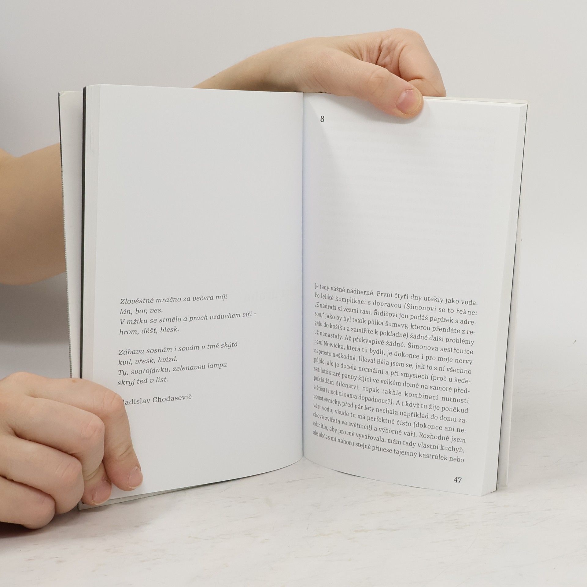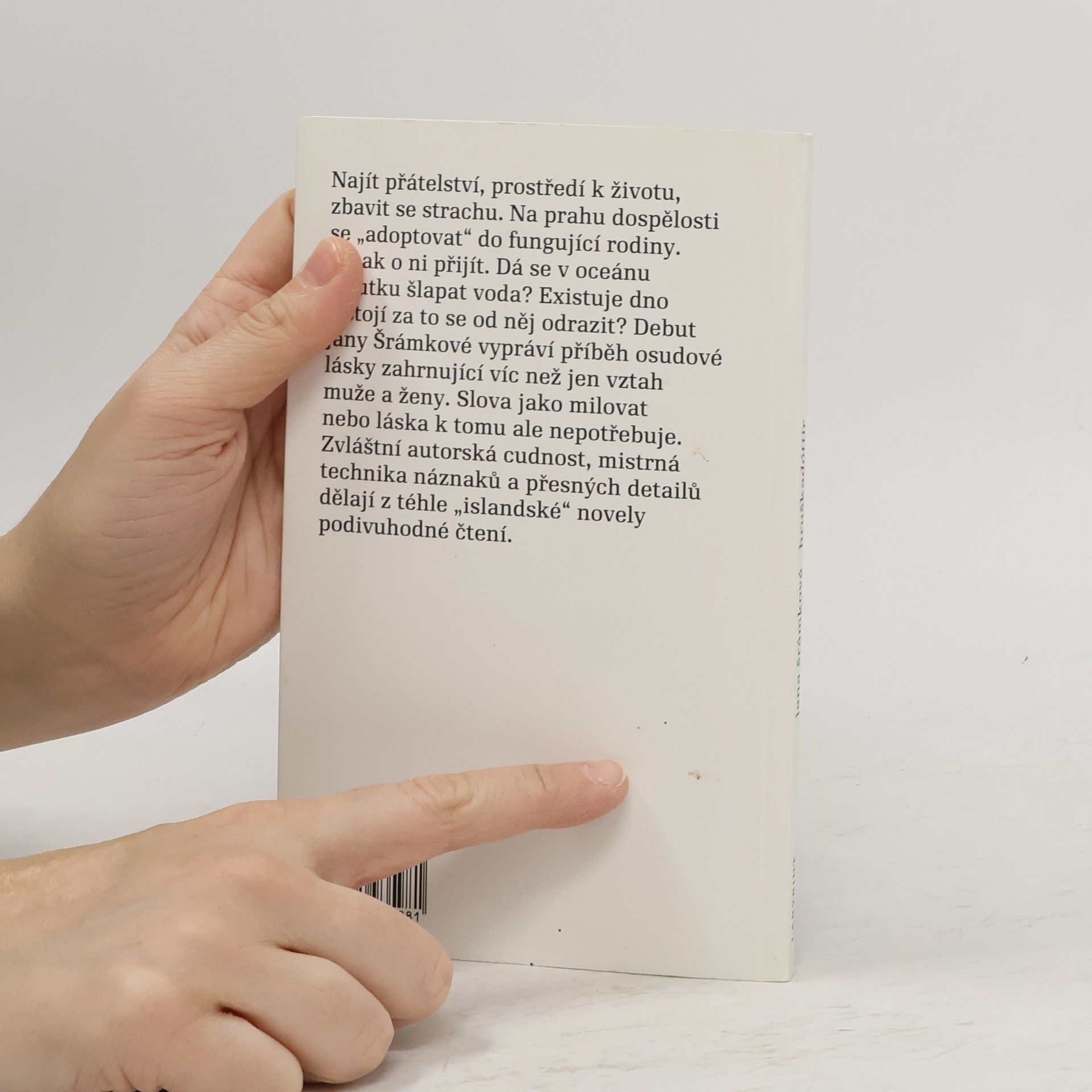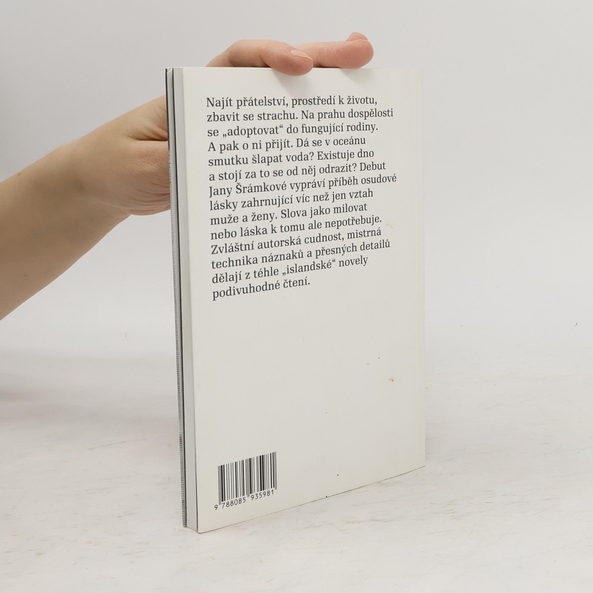 Najít přátelství, prostředí k životu, zbavit se strachu a na prahu dospělosti se „adoptovat“ do fungující rodiny. Dá se v oceánu smutku šlapat voda? Existuje dno a stojí za to se od něj odrazit? Debut Jany Šrámkové vypráví příběh osudové lásky zahrnující víc než jen vztah muže a ženy. Slova jako milovat nebo láska k tomu ale nepotřebuje. Zvláštní autorská cudnost, mistrná technika náznaků a přesných detailů dělají z téhle „islandské“ novely podivuhodné čtení. Kniha získala Cenu Jiřího Ortena 2009.