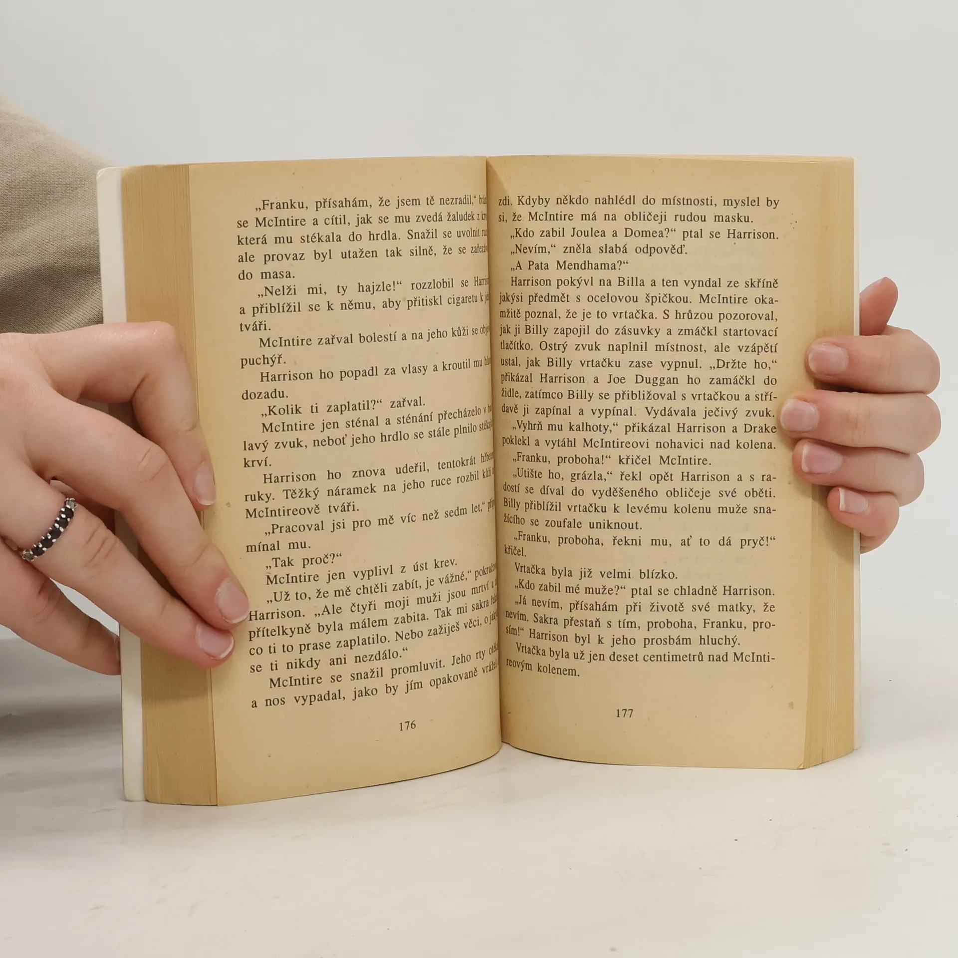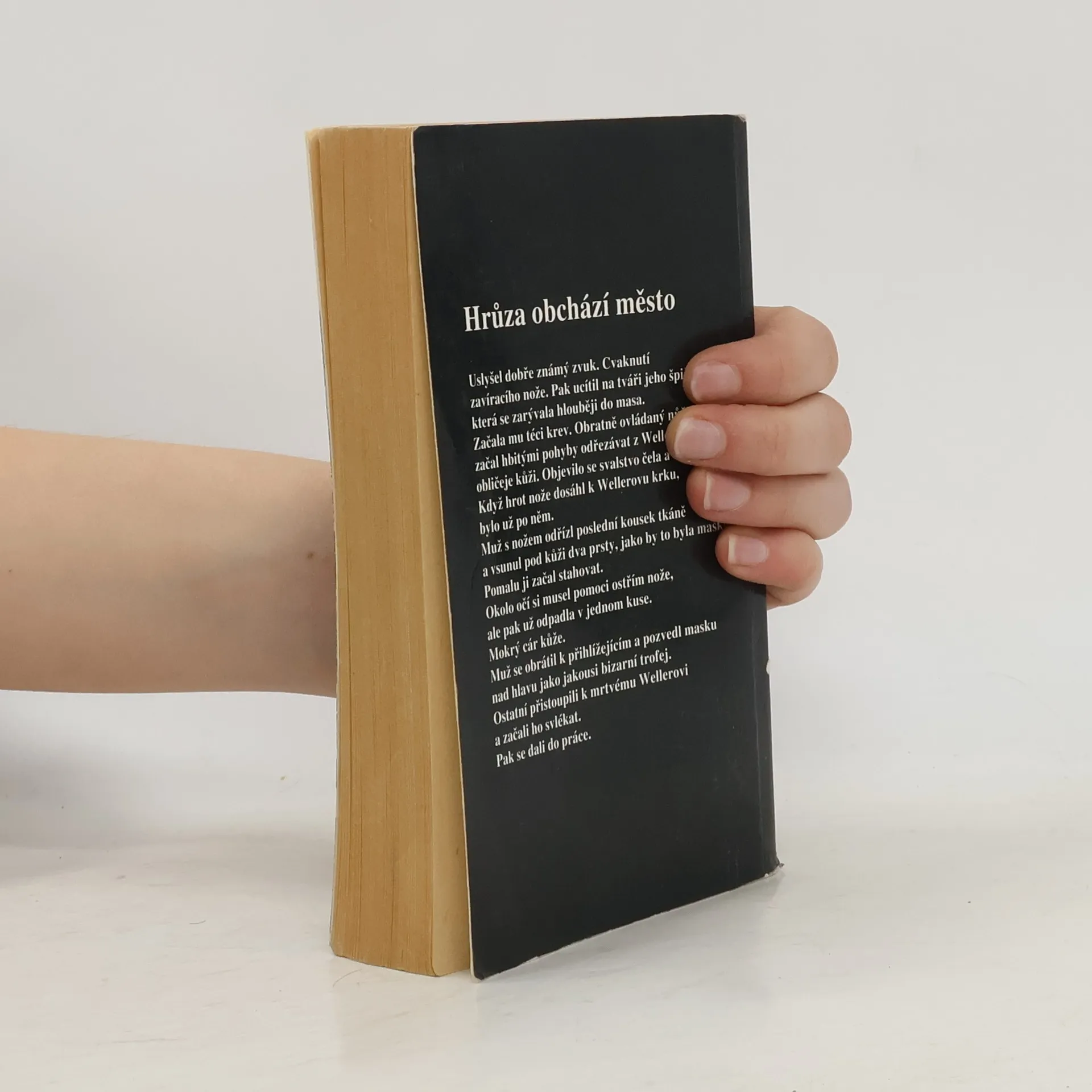 Uslyšel dobře známý zvuk. Cvaknutí zavíracího nože. Pak ucítil na tváři jeho špičku, která se zarývala hlouběji do masa. Začala mu téci krev. Obratně ovládaný nůž začal hbitými pohyby odřezávat z Wellerova obličeje kůži. Objevilo se svalstvo čela a tváří. Když hrot nože dosáhl k wellerovu krku, bylo už po něm Muž s nožem odřízl poslední kousek tkáně a vsunul pod kůži dva prsty, jako by to byla maska. Pomalu ji začal stahovat. Okolo očí si musel pomoci ostřím nože, ale pak už odpadla v jednom kuse. Mokrý cár kůže. Muž se obrátil k přihlížejícím a pozvedl masku nad hlavu jako jakousi bizarní trofej. Ostatní přistoupili k mrtvému Wellerovi a začali ho svlékat. Pak se dali do práce. ... celý text